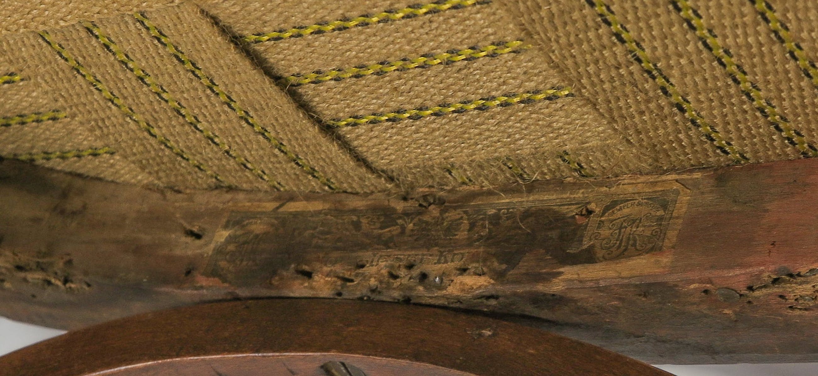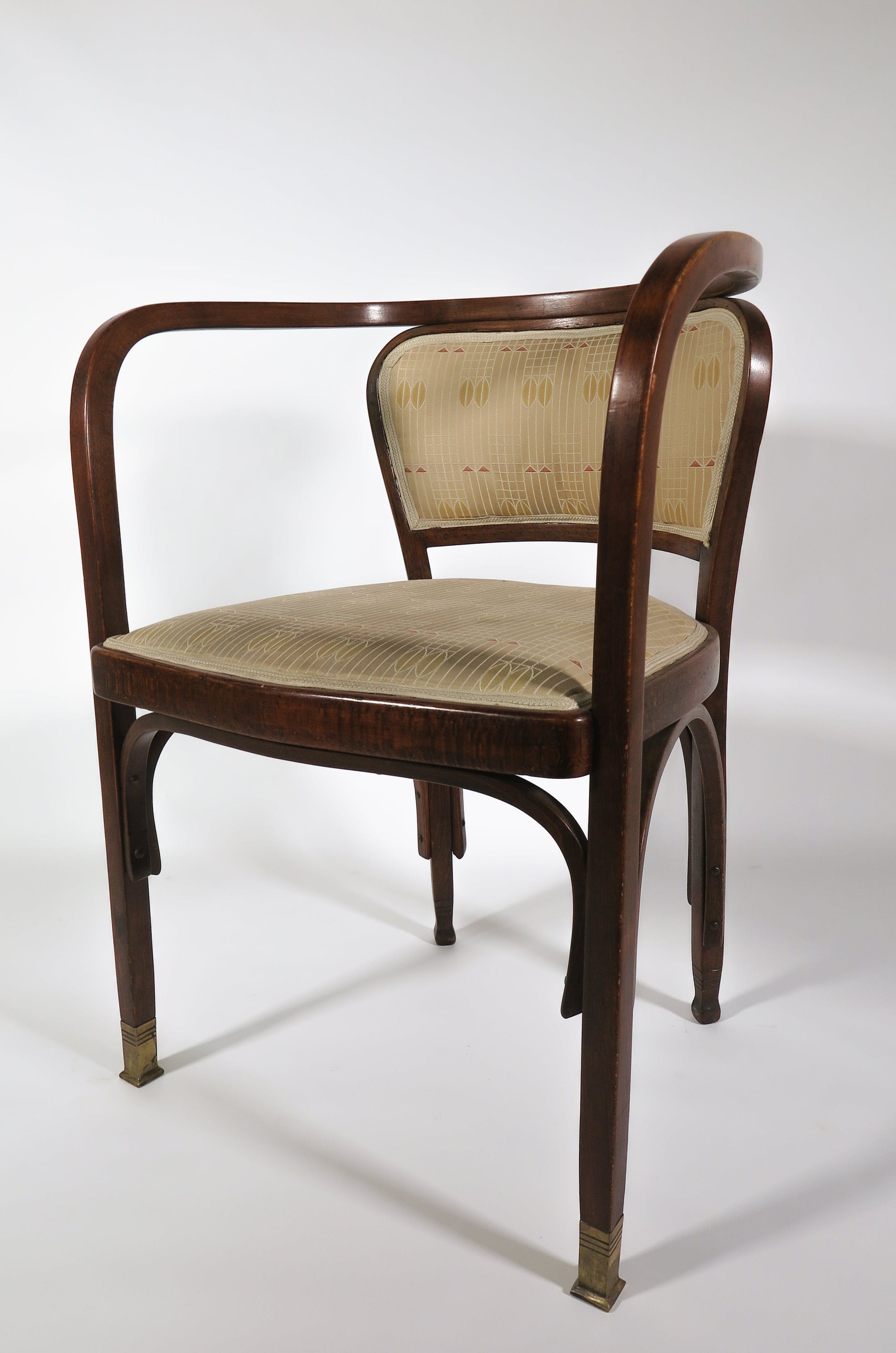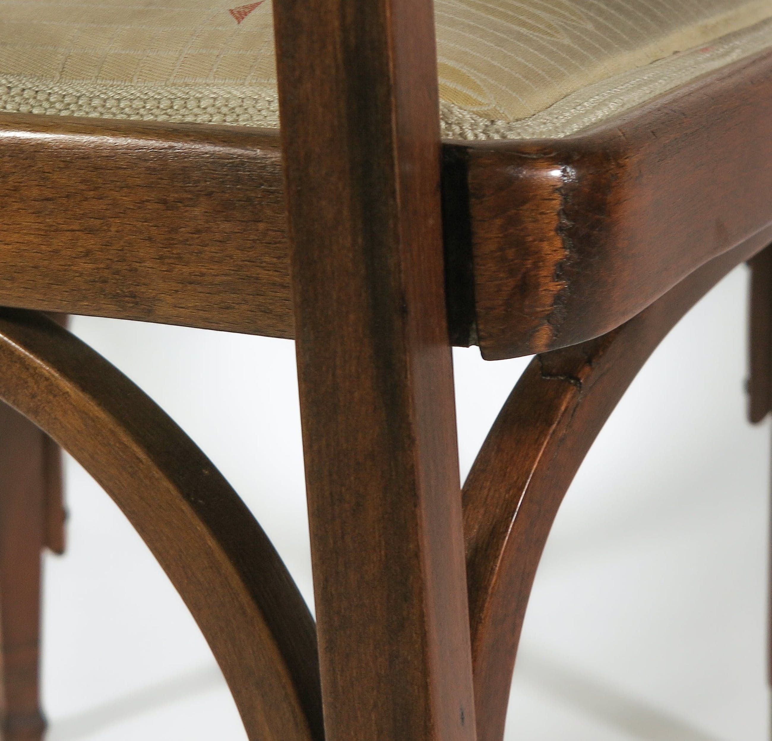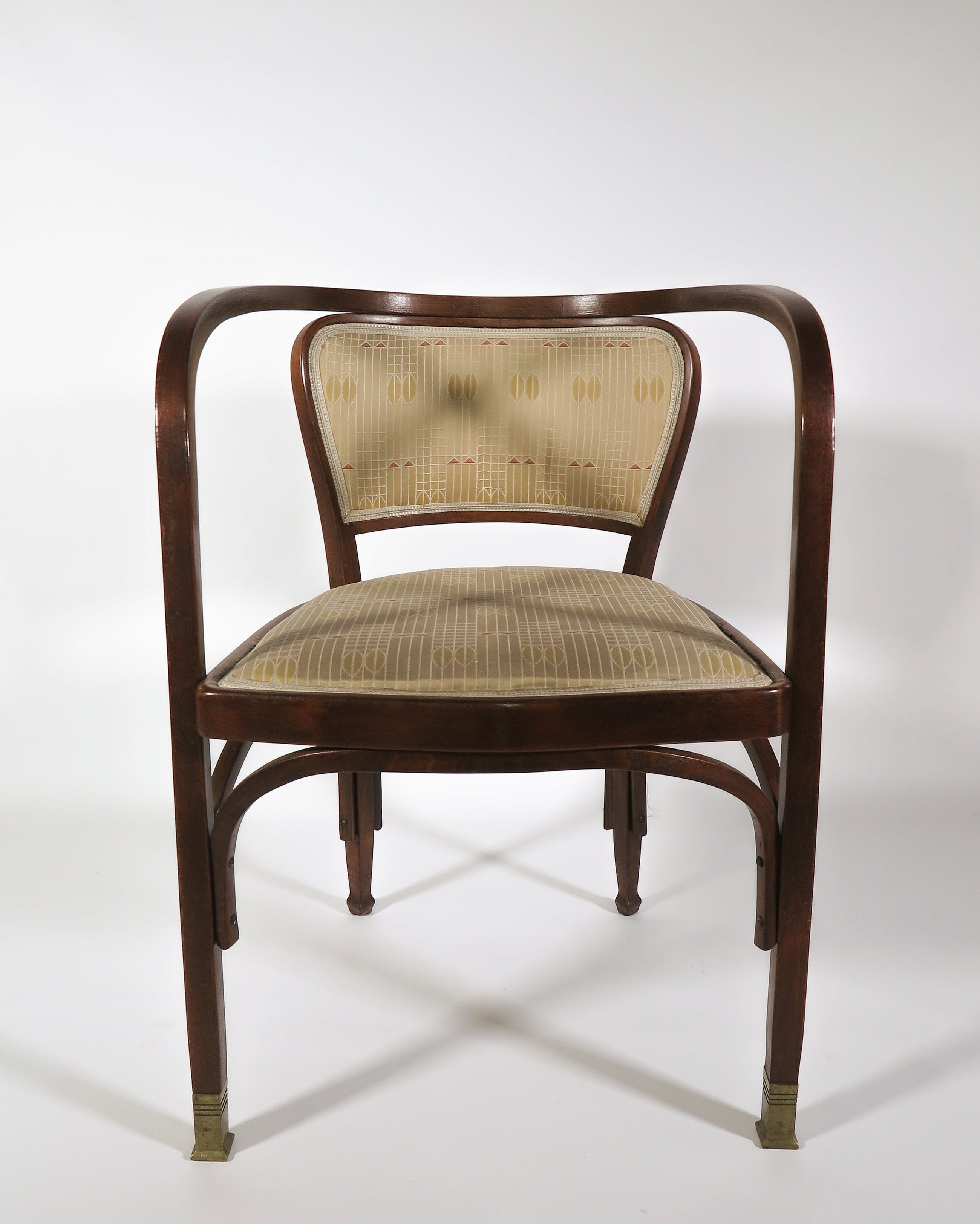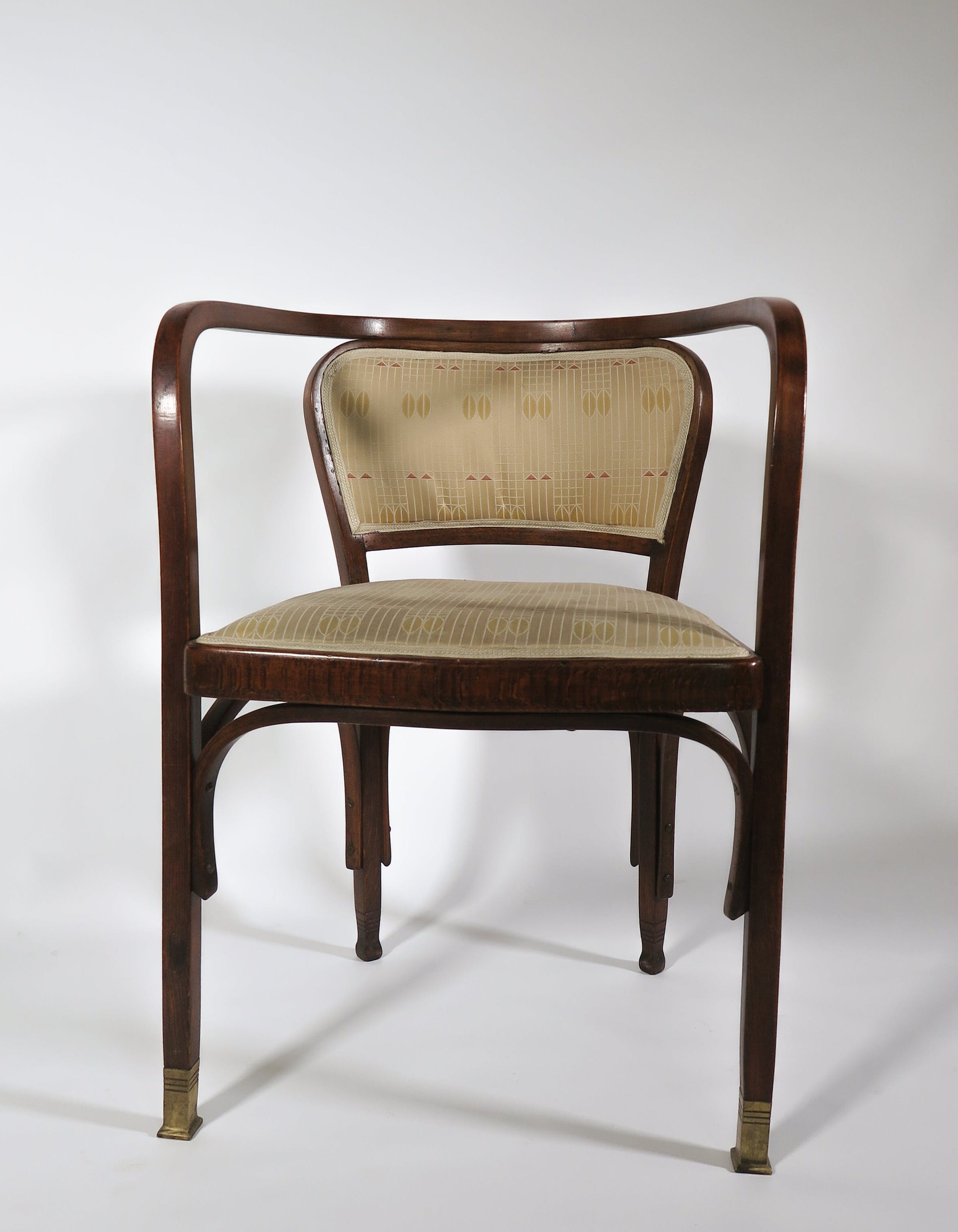 Deze acht armstoelen zijn ontworpen door Gustav Siegel en dateren uit de 'Vienna Secession' periode (1899/1900). De voorvoeten van de stoelen hebben koperen hoefjes. De basis van de stoel is van mahonie hout. De linnen stoffering is 30 jaar oud en verdient een schoonmaak/opknapbeurt. De stoelen zijn geproduceerd door de broers J. & J. Kohn in 1900. De stoel is voor het eerst tentoongesteld in de expositie 'Universelle, Parijs' in 1900.