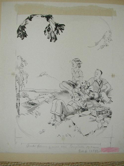 Gustav Traub Ausflug Illustrationsvorlage.Rückseitig Stempel mit der Künstlerangabe Gustav Traub. Schwarze Tuschzeichnung , unten signiert. Mit Druckerangaben . Als Illustrationsvorlage mit Gebrauchsspuren. Am oberen Rand Klebereste eines anderen Blattes.Mit zwei Ppierstreifen unter passepartout montiert. Unter passepartout sieht das Blatt natürlich besser aus. Maße der Zichnung: Etwa 24 mal 32 cm.Privatverkauf. bei Fragen bitte mailen. Versand 8?, andere Länder erfragen.