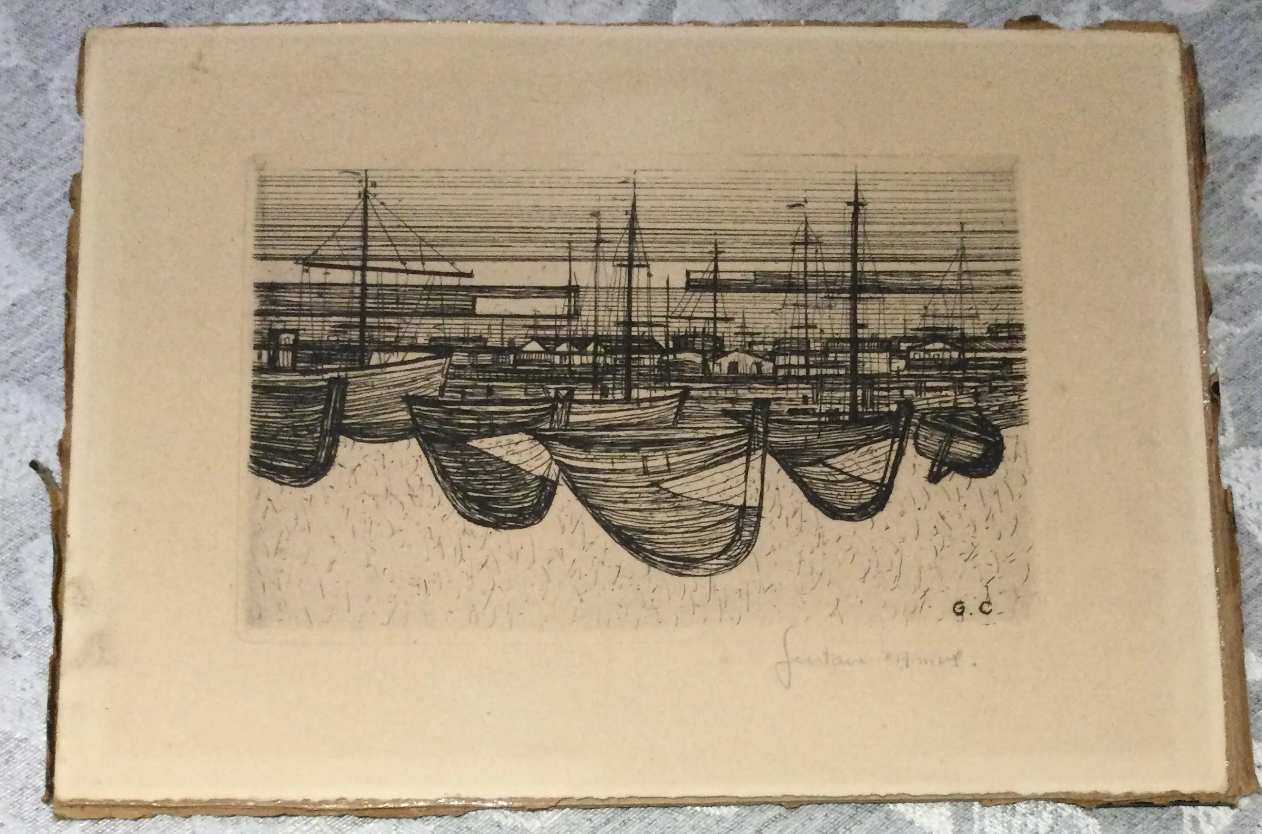 Mooie hand gesigneerde gravure van Gustave Camus van aangemeerde boten