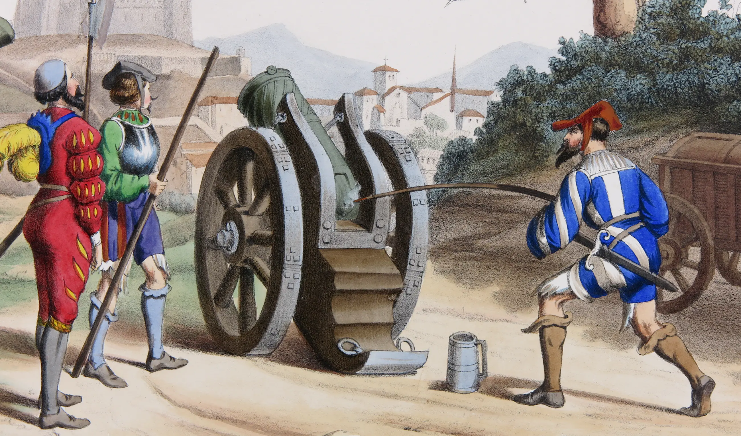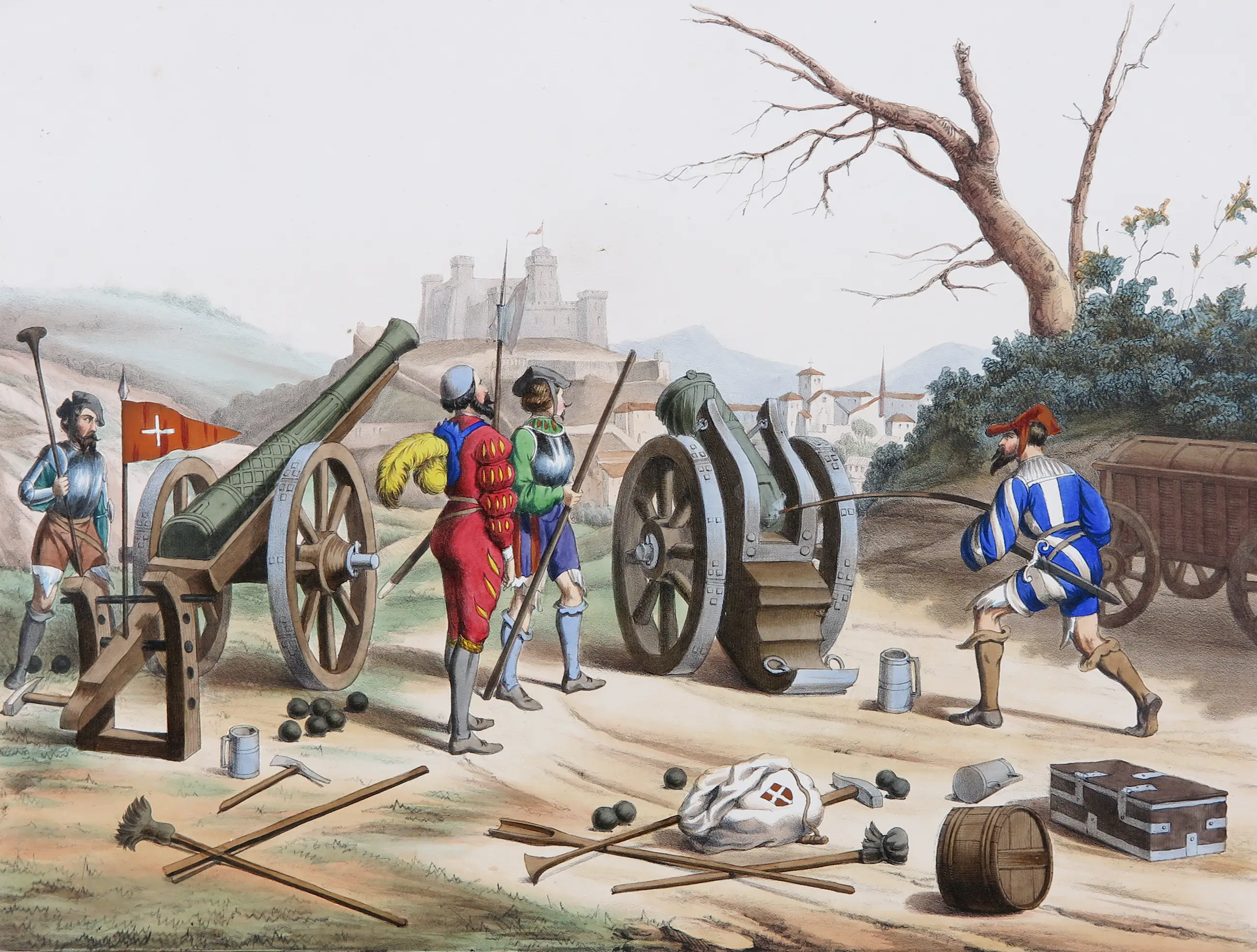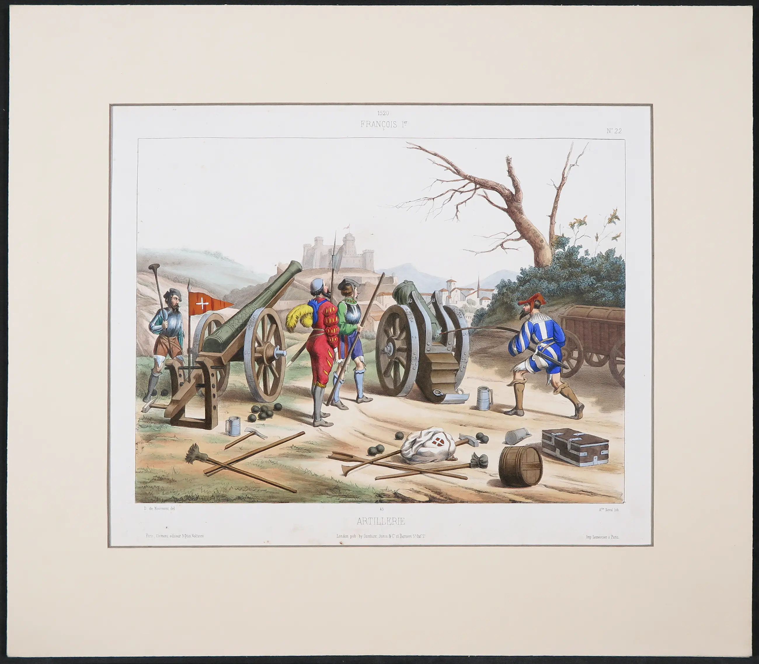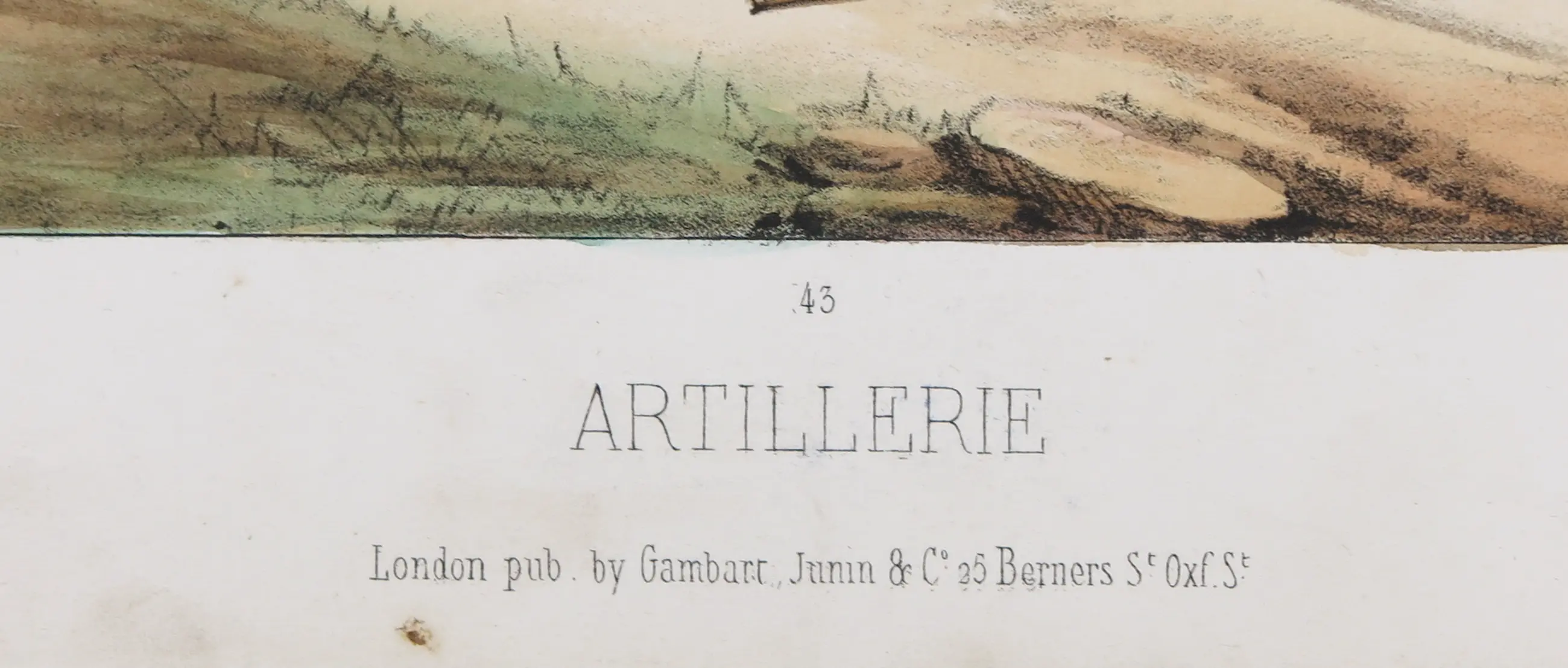 Handgekleurde litho, getiteld Artillerie, door Gustave David en D. de Noirmont.