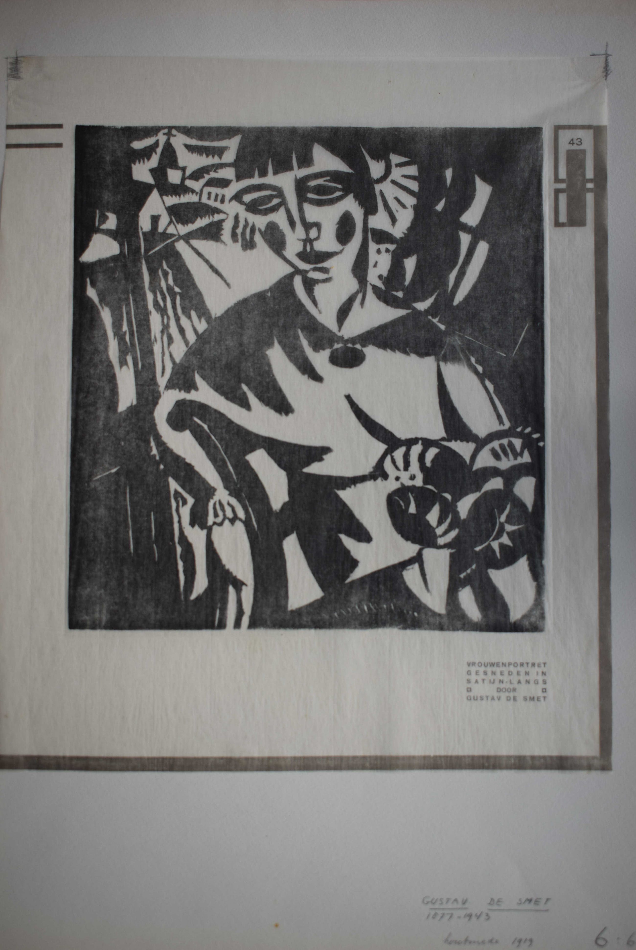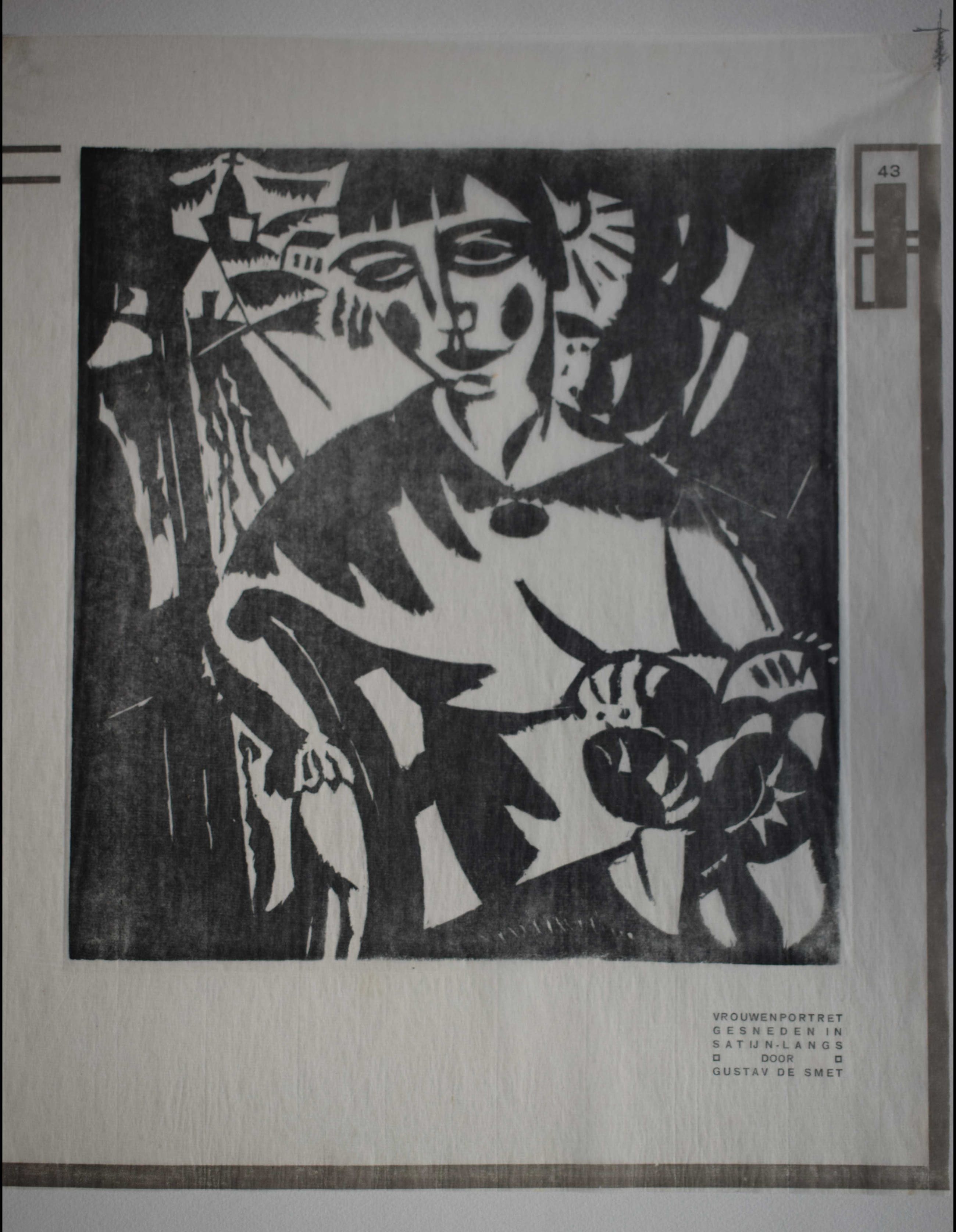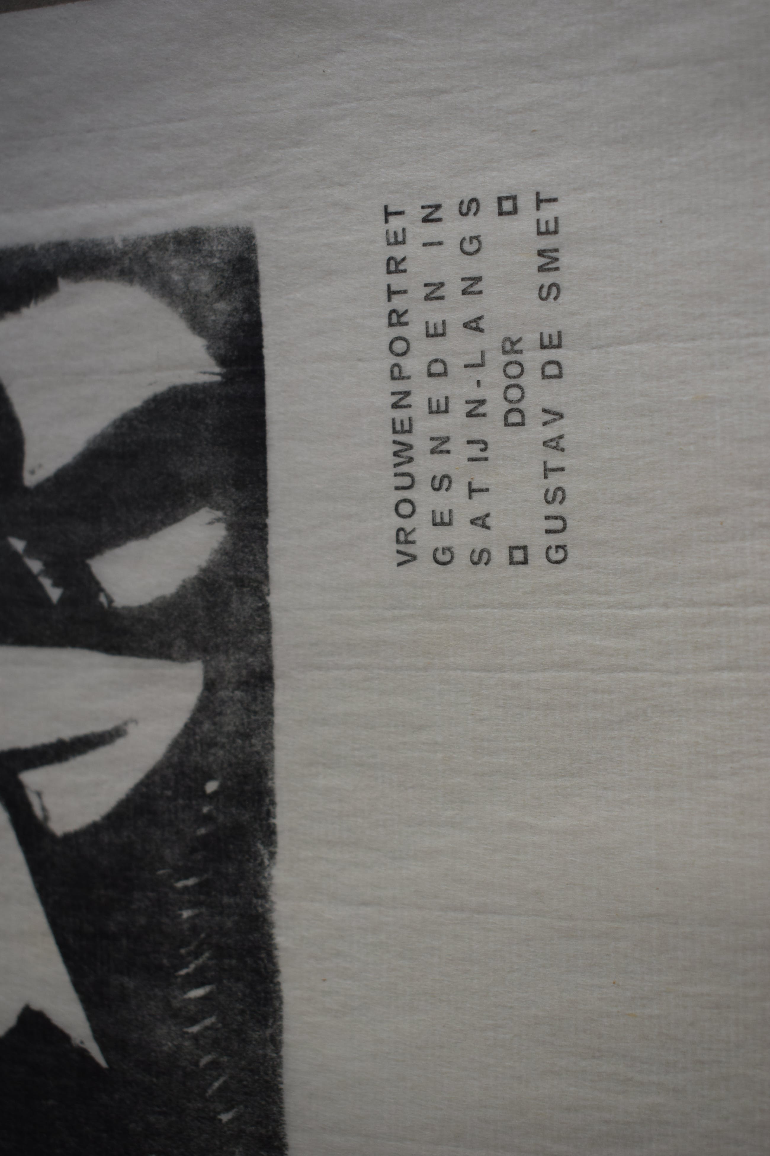 Tekst onderin de pagina: Vrouwenportret Gesneden in Satijn-Langs door Gustav De Smet