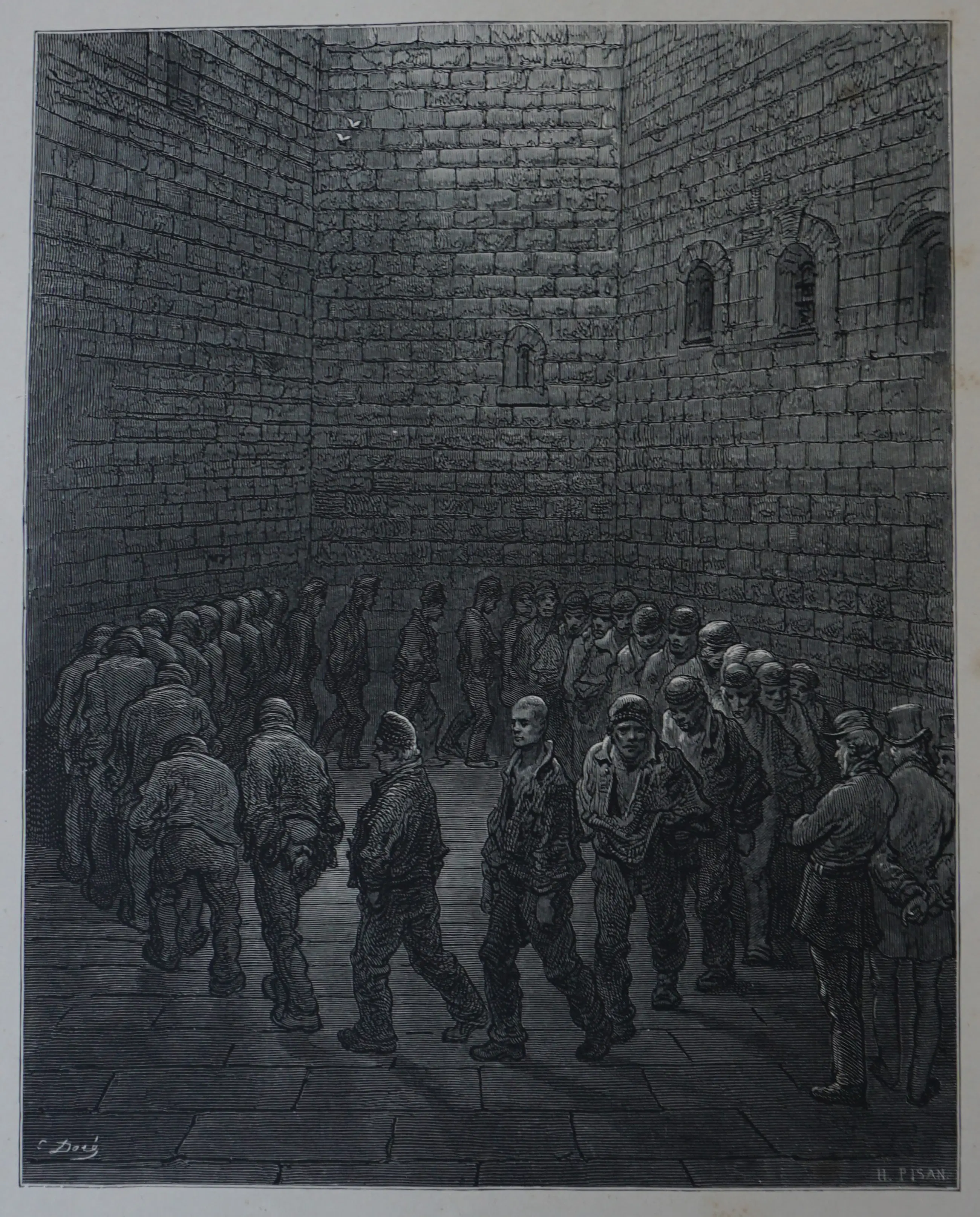 “Newgate – The Exercise Yard” (ca. 1872). Ze toont gevangenen in een gevangenis die in een cirkel rondlopen in de binnenplaats.