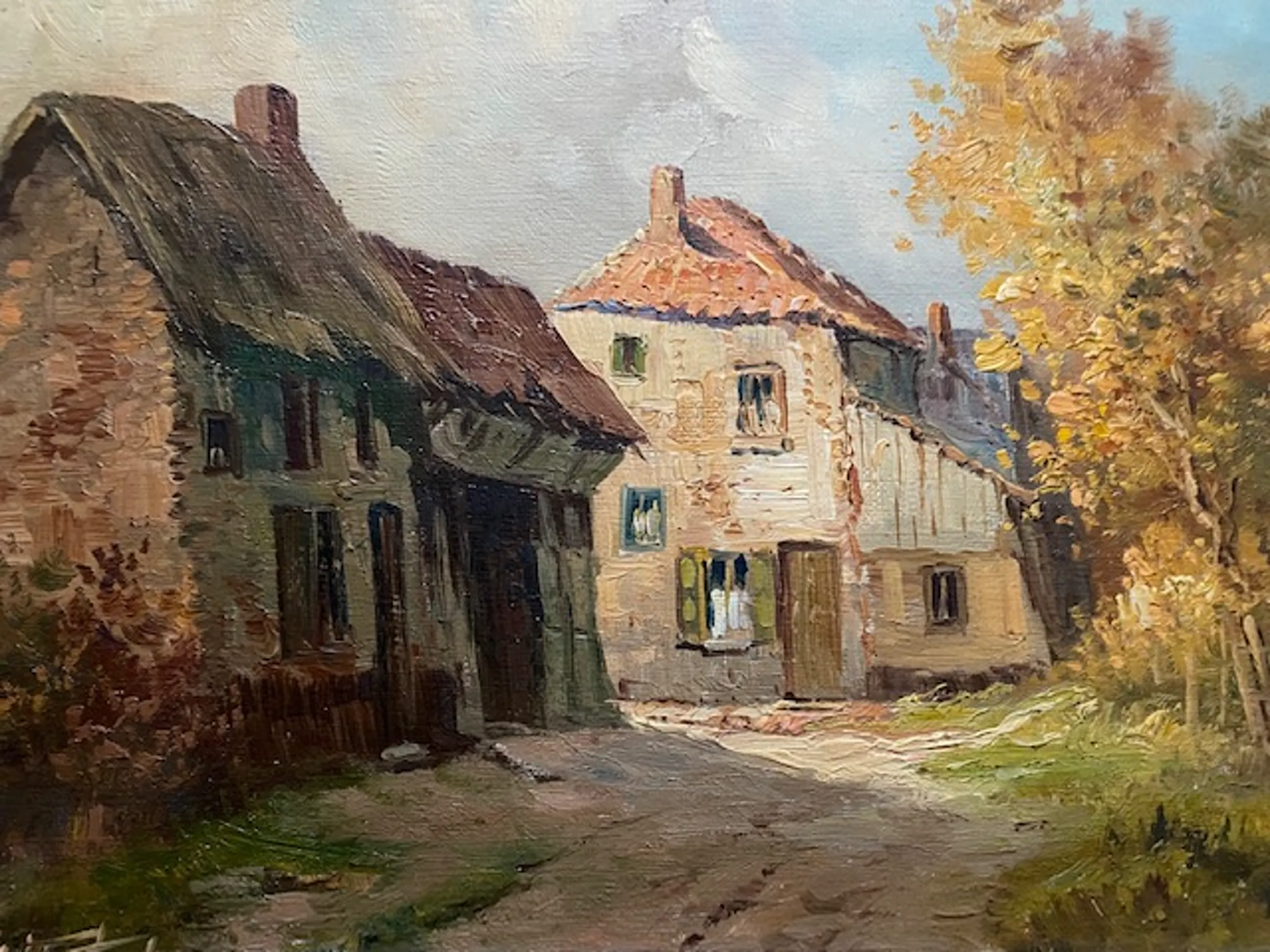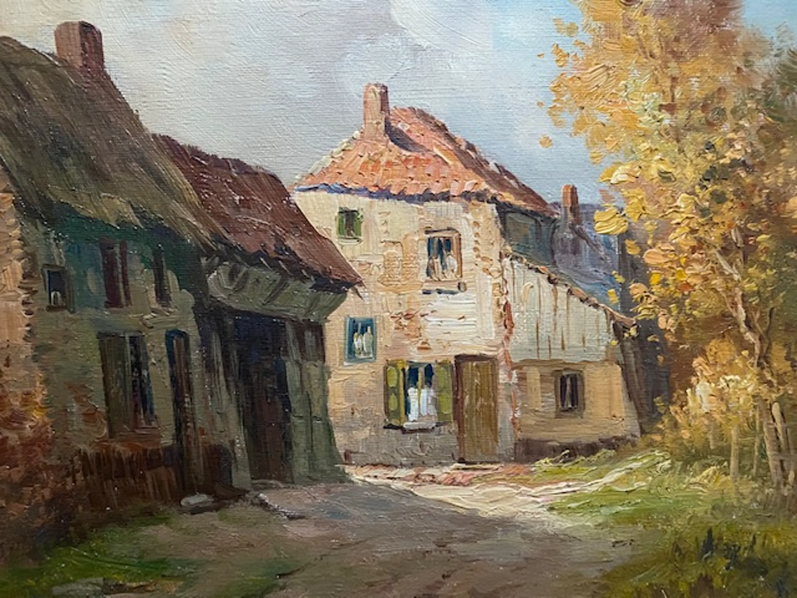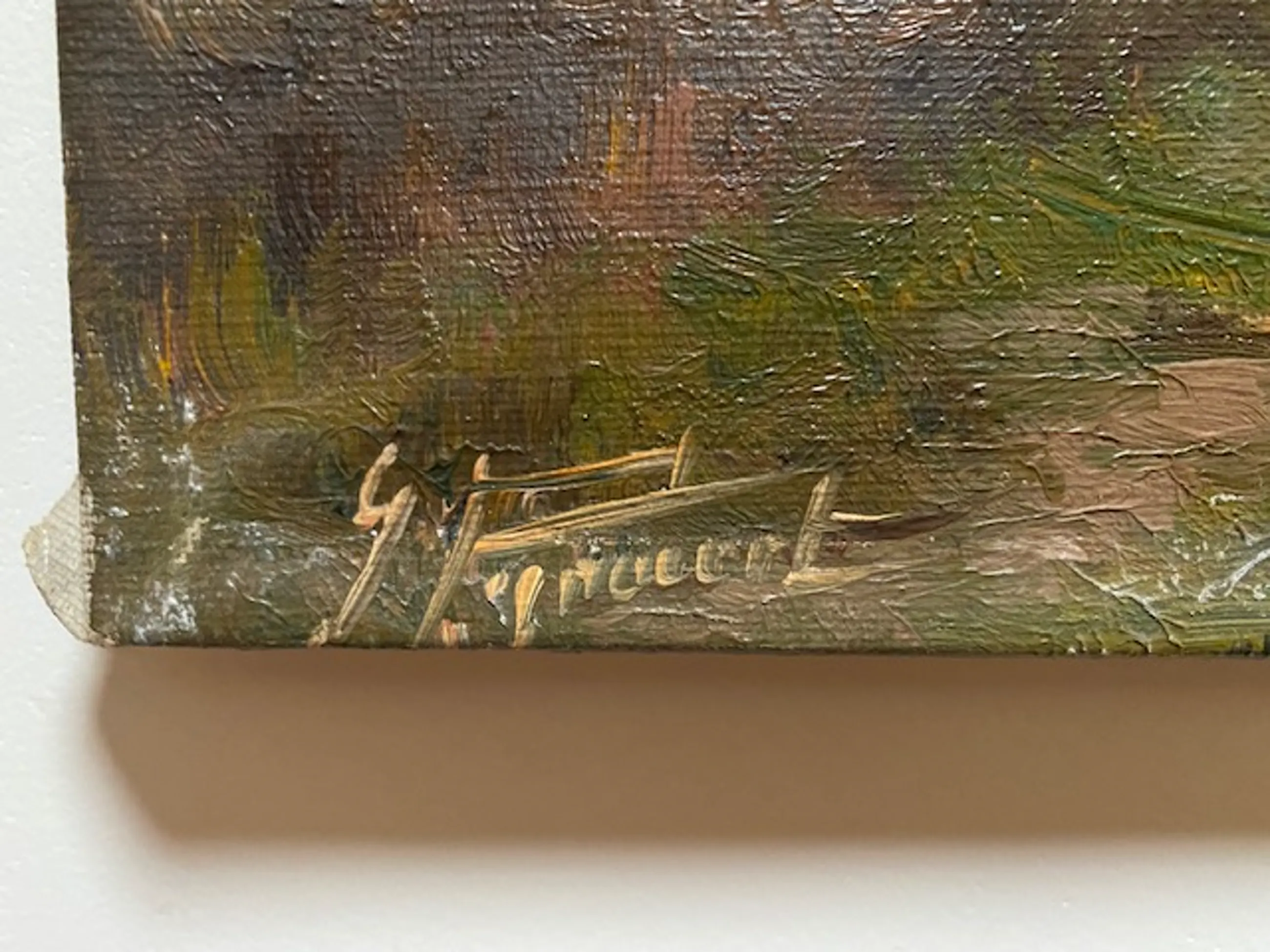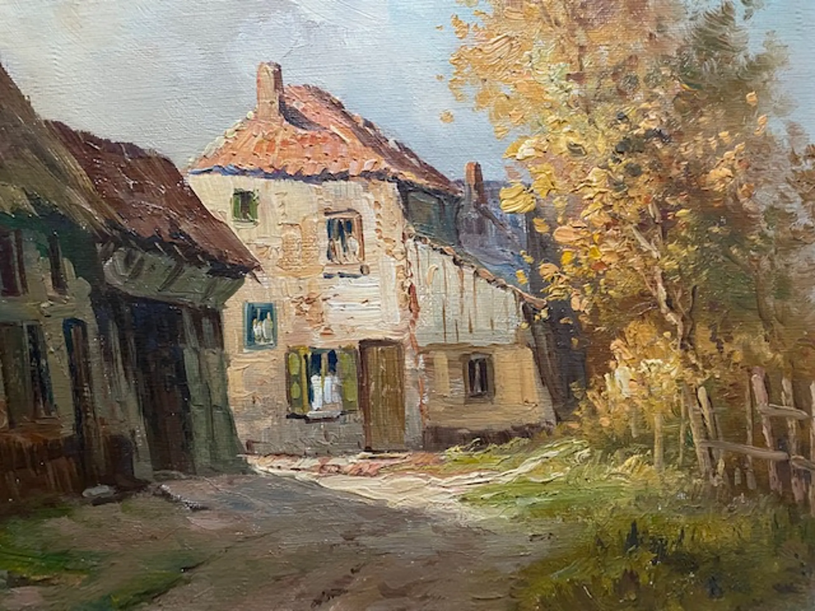 Gustave Pynaert (1900-1968) - de witte hoeve Olieverf op doek - Handgesigneerd Gustave Pynaert uit het Belgische Menen schilderde Vlaamse landschappen, landelijke gezichten met hoevetjes, beekjes en boompartijen. Zijn werken ademen stilte, poëzie en romantiek. Staat vermeld in Piron.