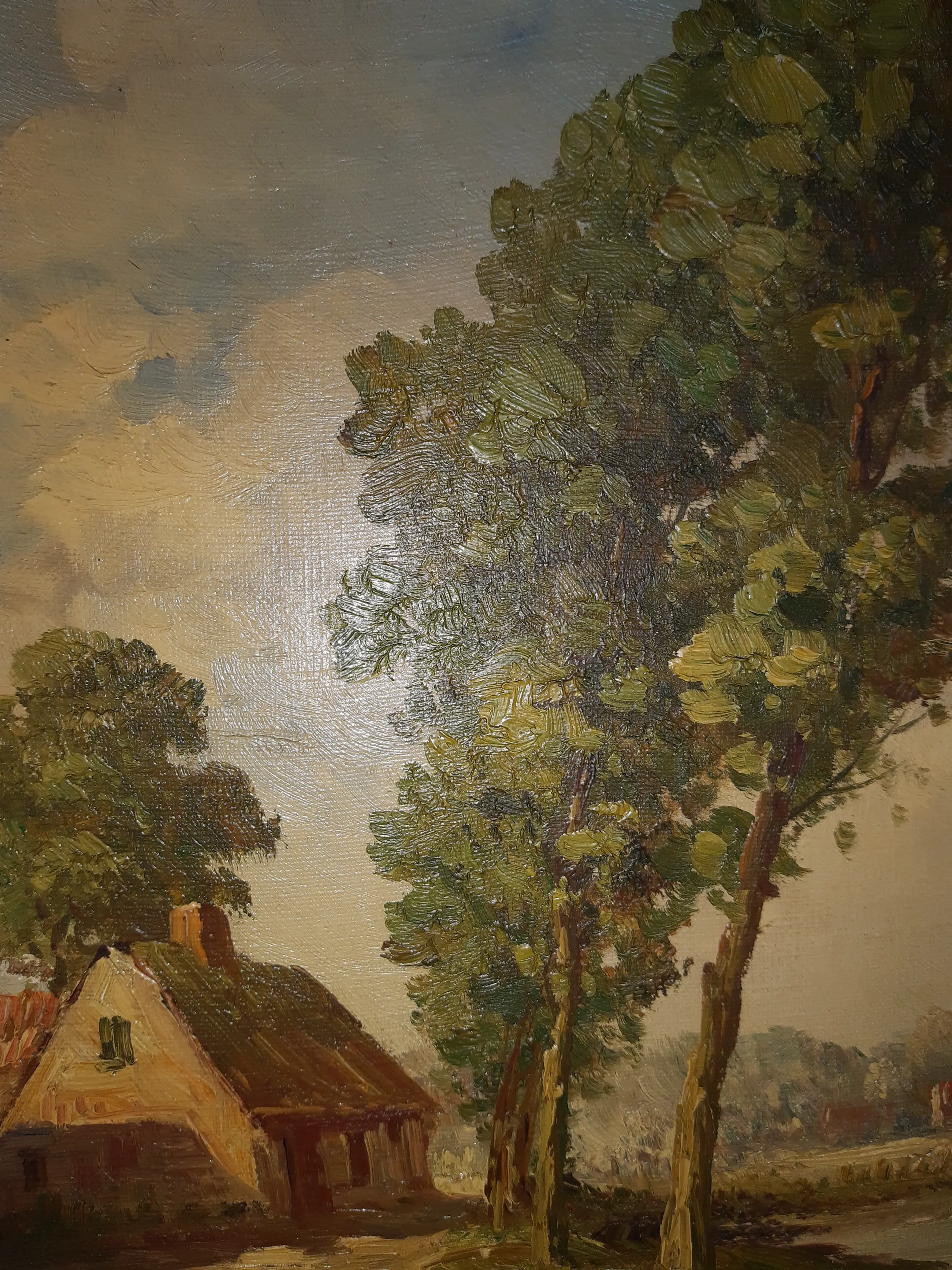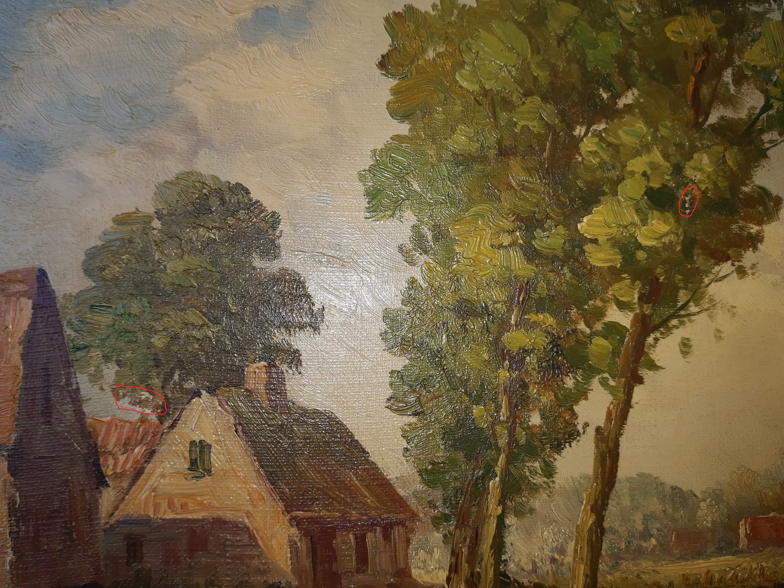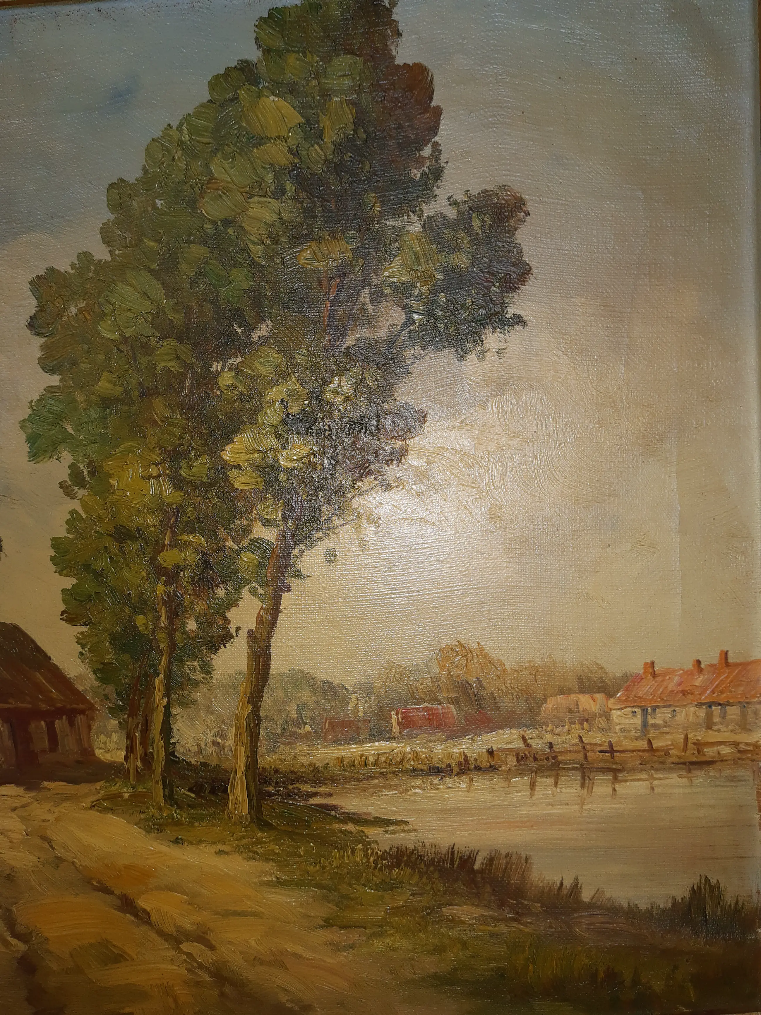 ATTENTIE: Over het algemeen een zeer mooi schilderij, enkel zijn er 2 kleine plekjes op het schilderij waar de verf iets heeft losgelaten. Dit is enkel te zien als je het tegen het licht hou (zie detailfotos: de boom tussen de huizen aan het dak , de 1ste grote boom aan het water )