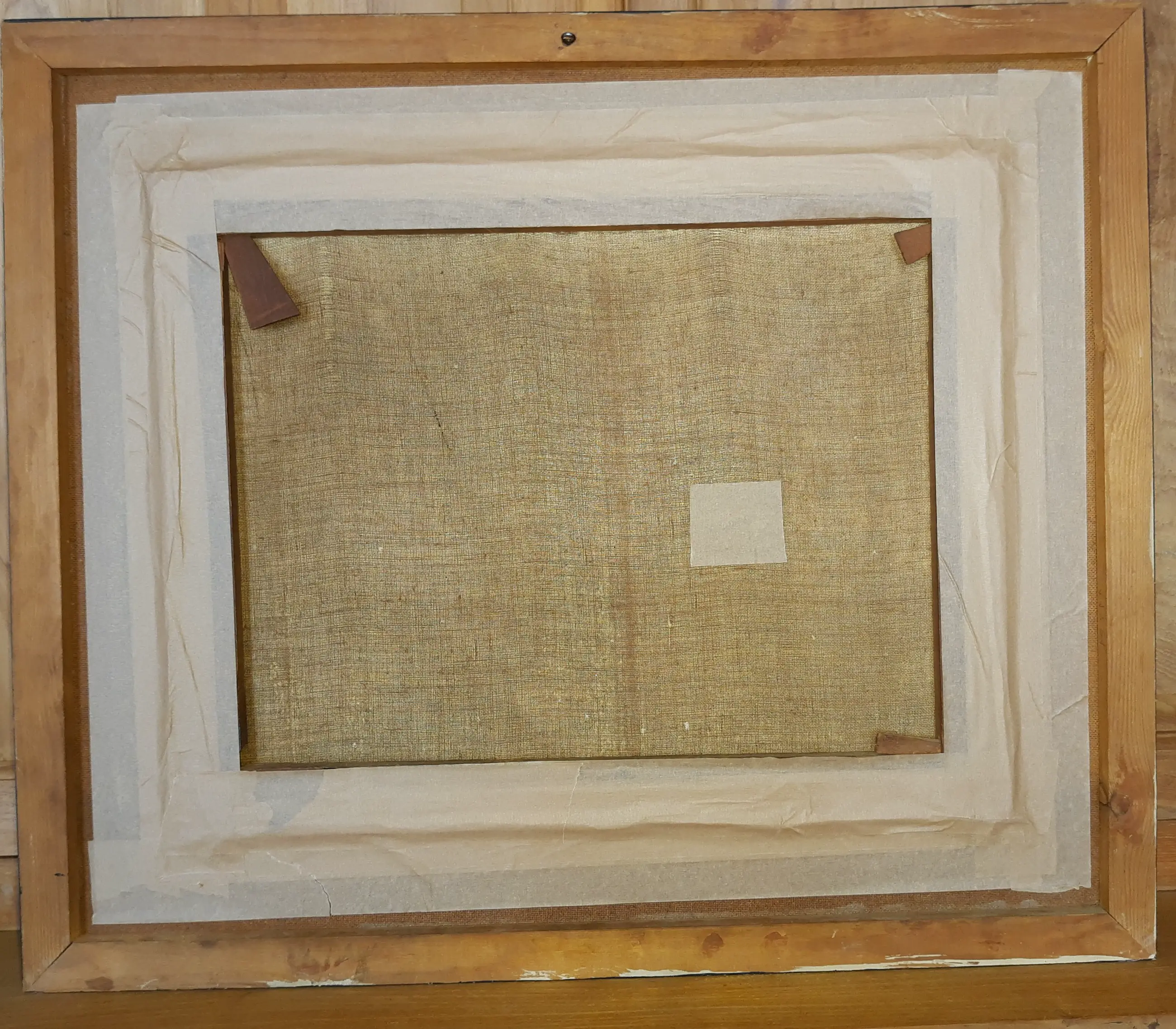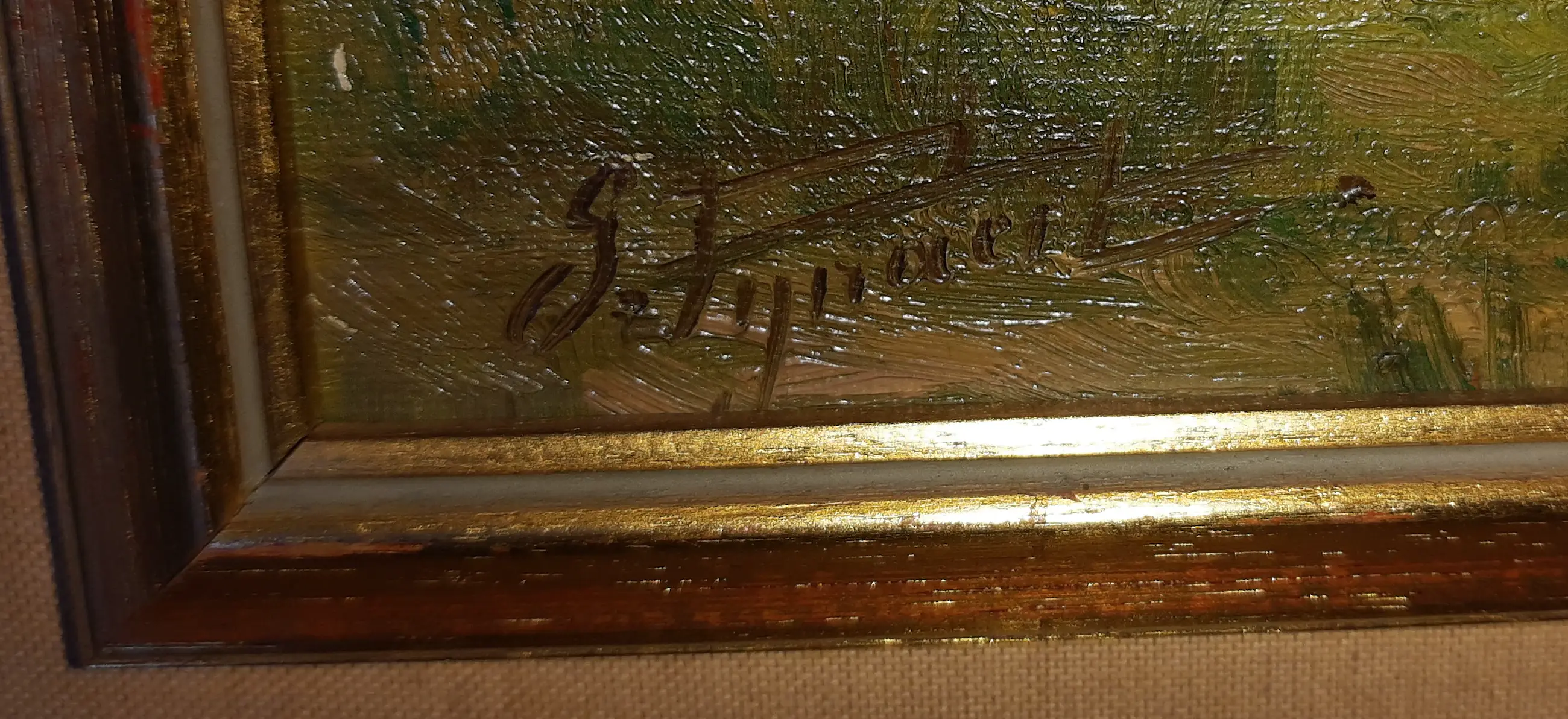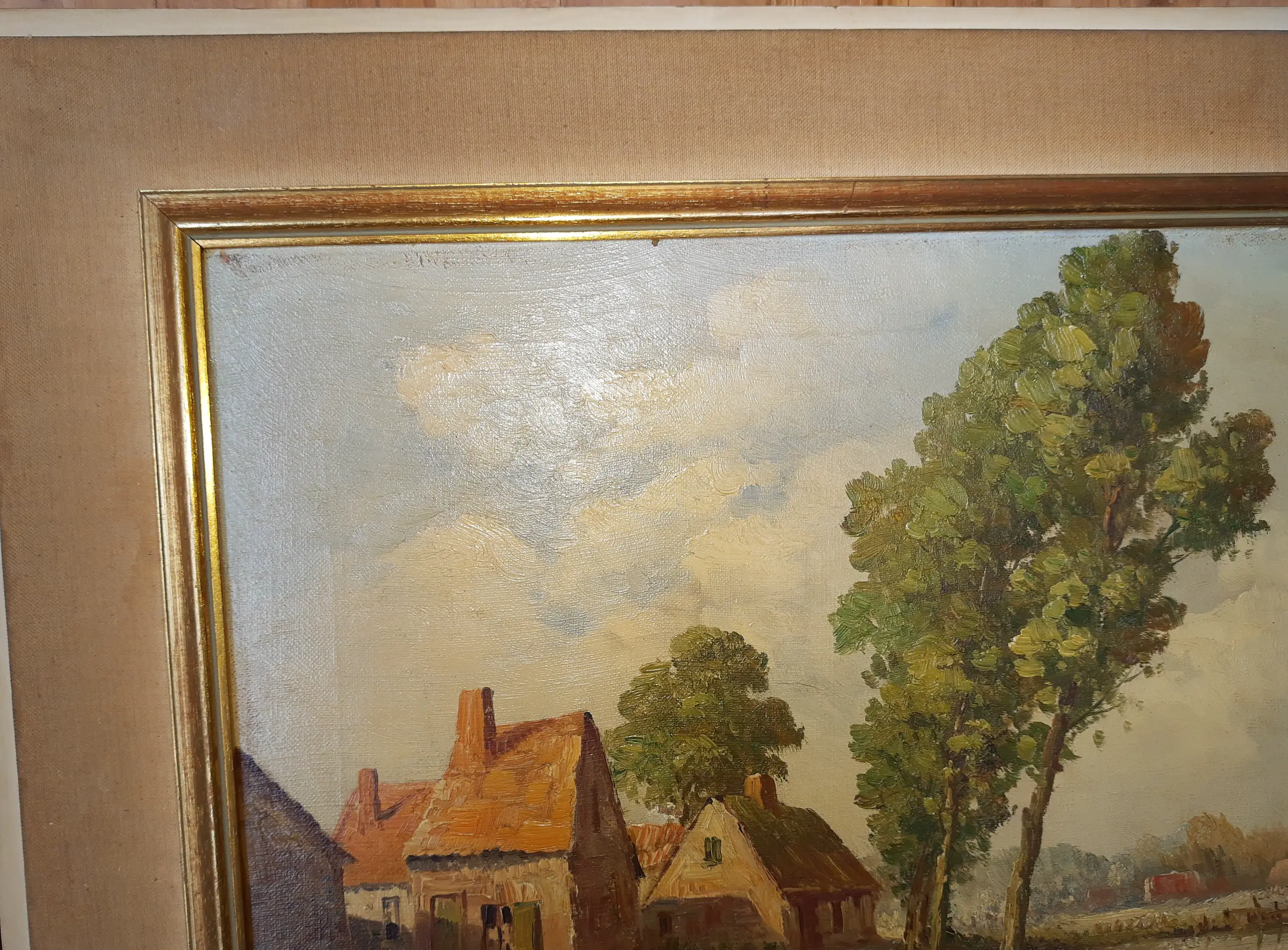 ATTENTIE: Over het algemeen een zeer mooi schilderij, enkel zijn er 2 kleine plekjes op het schilderij waar de verf iets heeft losgelaten. Dit is enkel te zien als je het tegen het licht hou (zie detailfotos: de boom tussen de huizen aan het dak , de 1ste grote boom aan het water )
