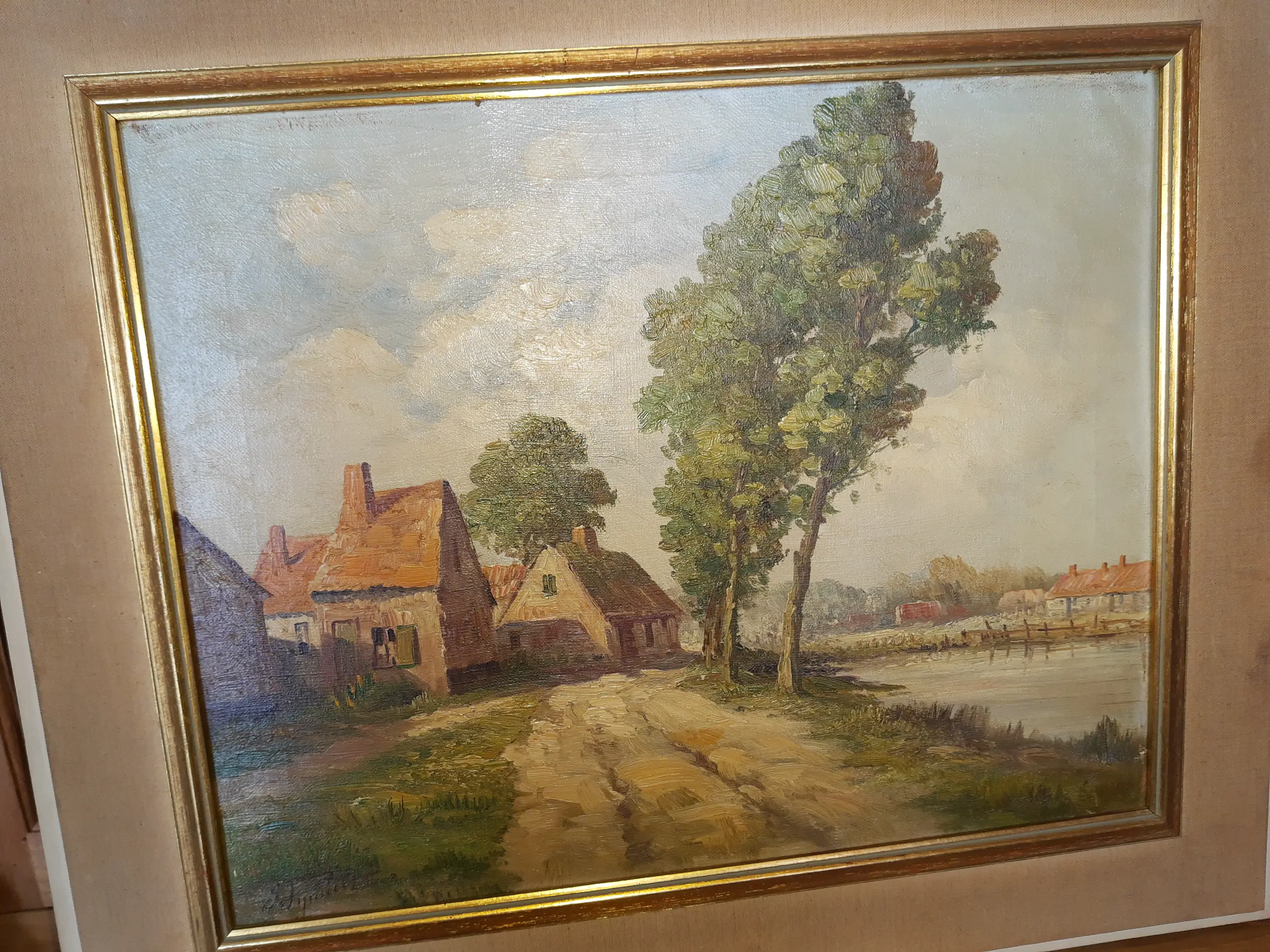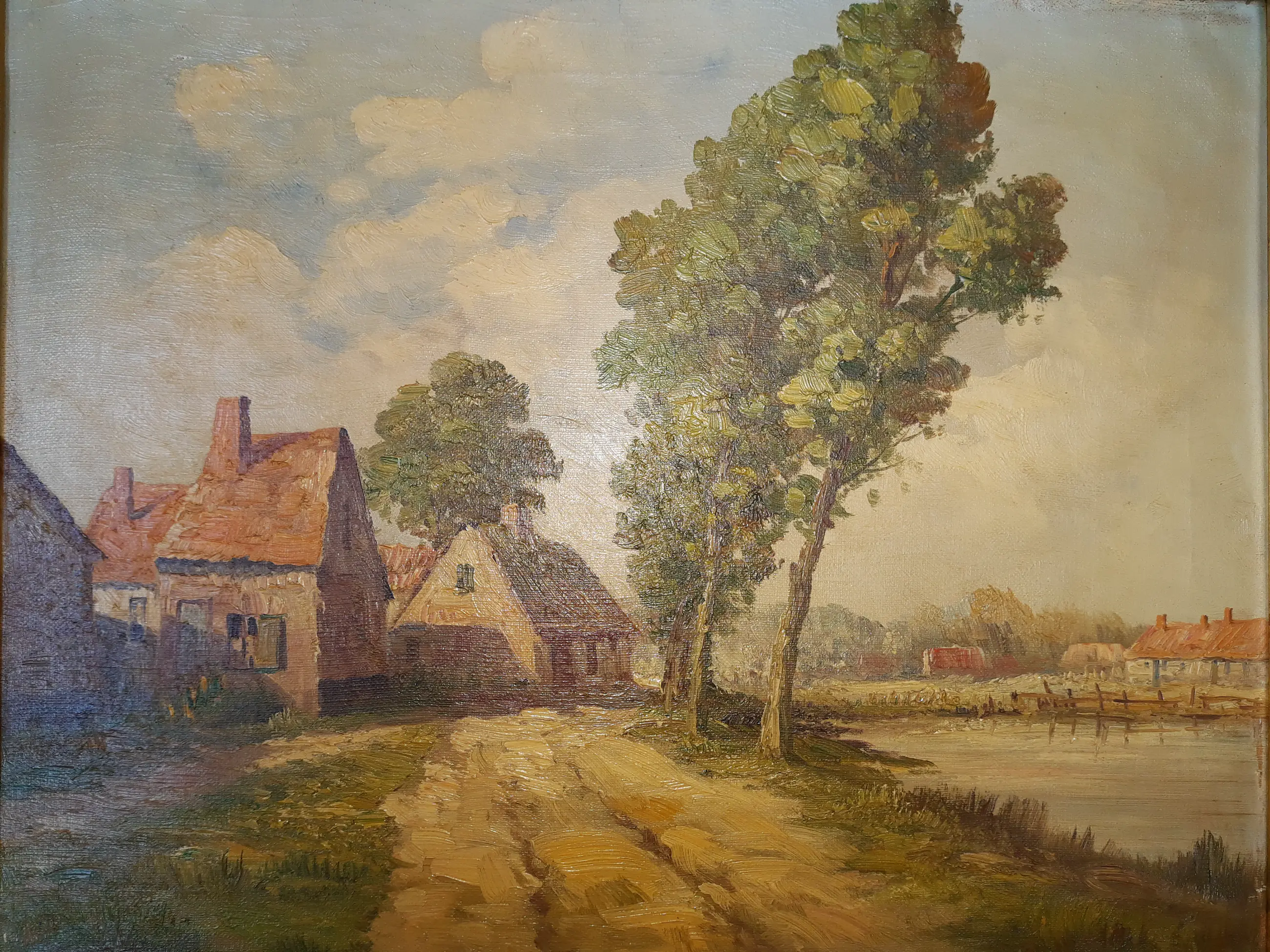 Prachtig olie op doek schilderij van een boerengehucht langs het water van de Vlaamse schilder Gustave Pynaert (1900 - 1968).