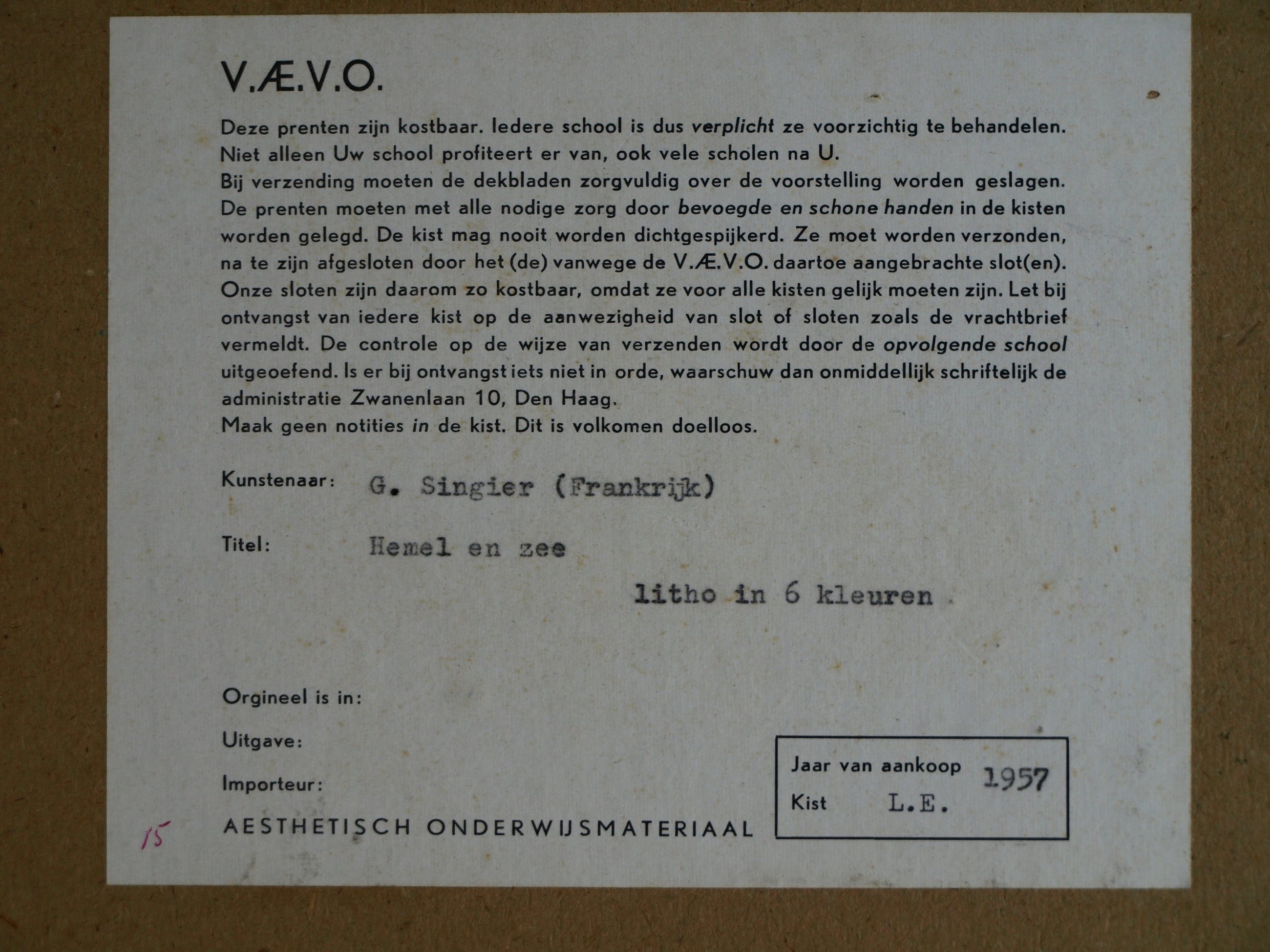 Deze schoolplaten werden niet verkocht aan scholen maar door de V.AE.V.O. in grote kisten aan scholen toegestuurd voor een tijdelijke bruikleen. In de kist zaten 14 wissellijsten en ook een portefeuille met 8 kleinere platen, veelal litho's van moderne en abstracte schilderijen.