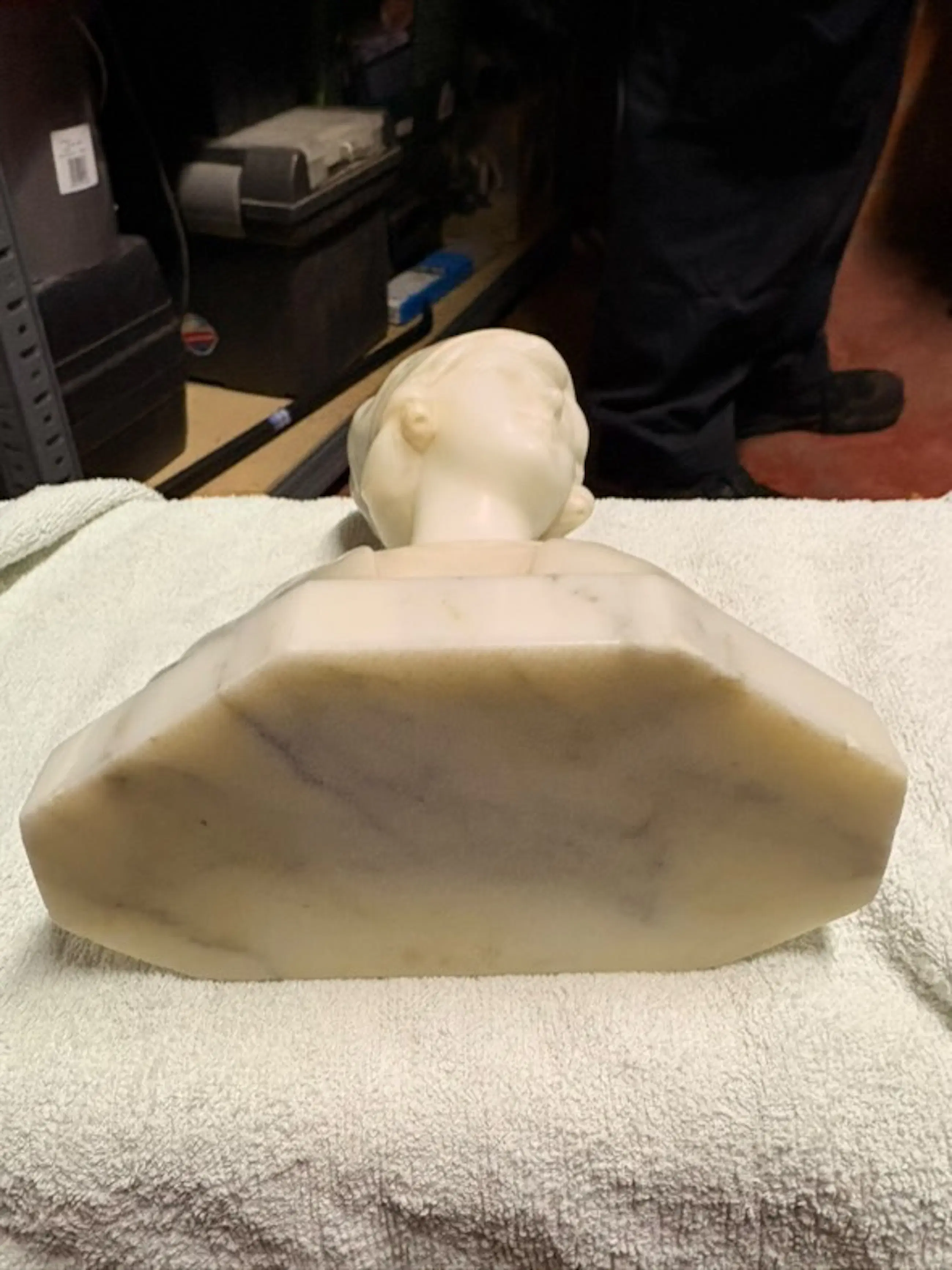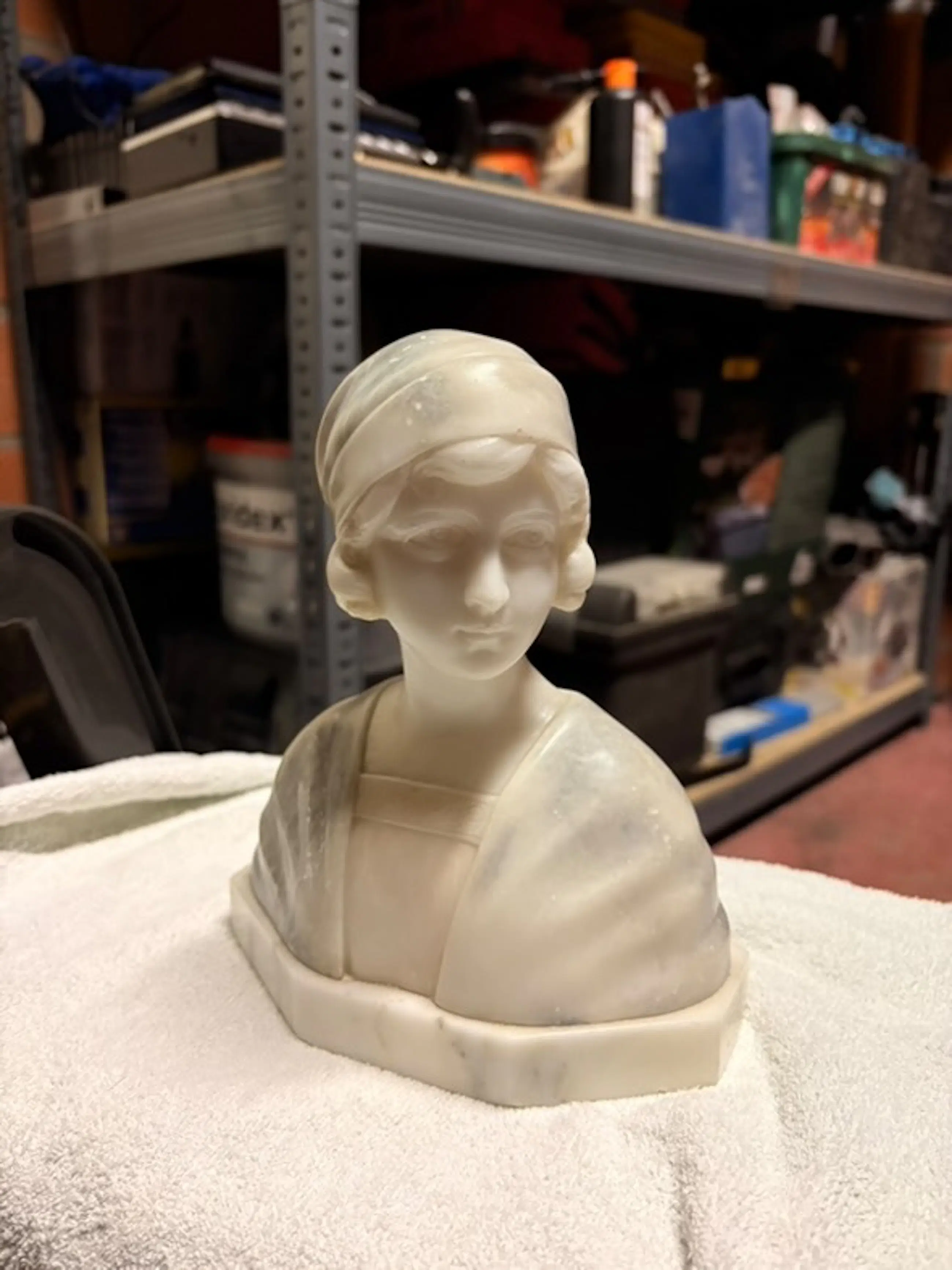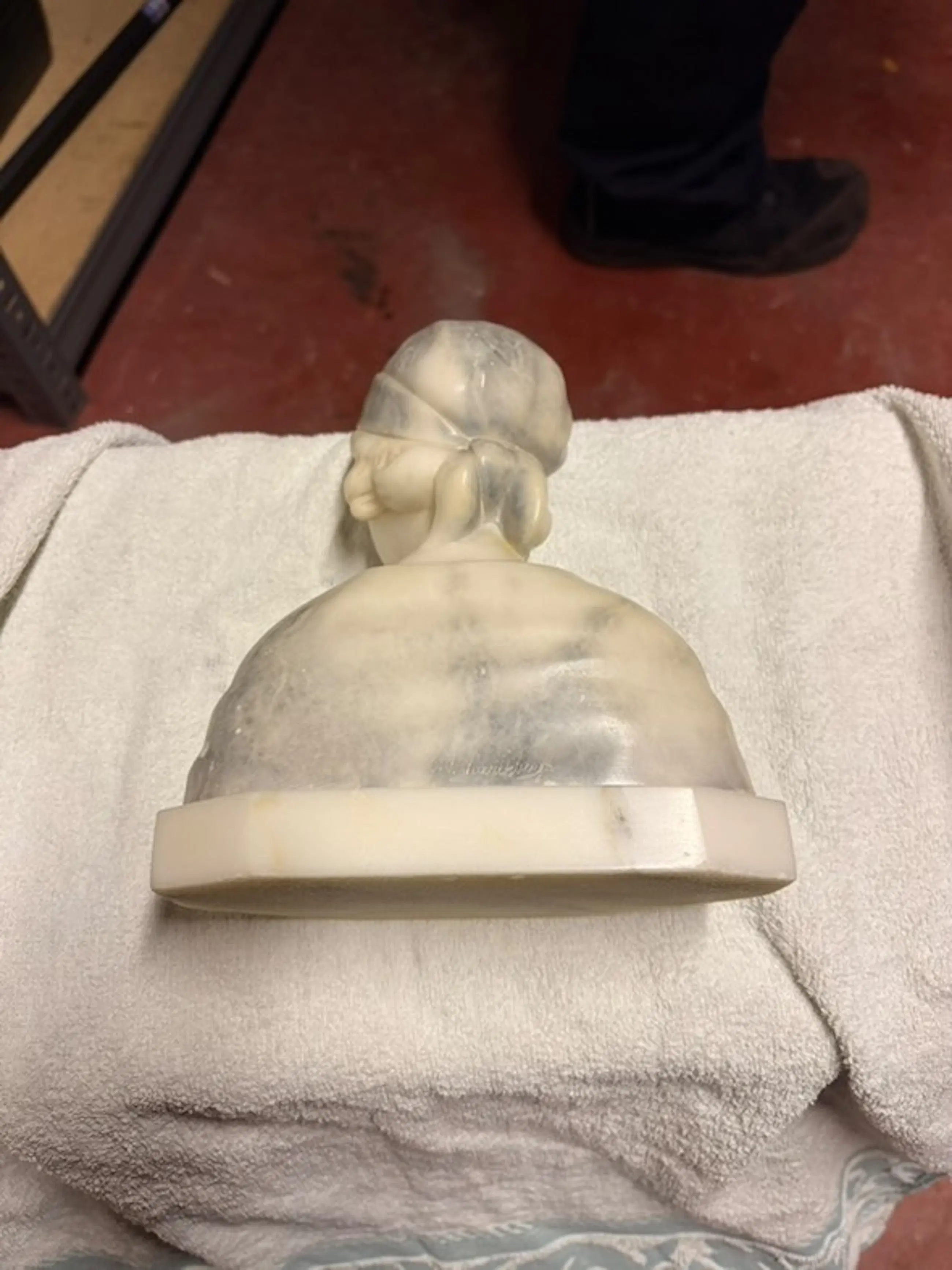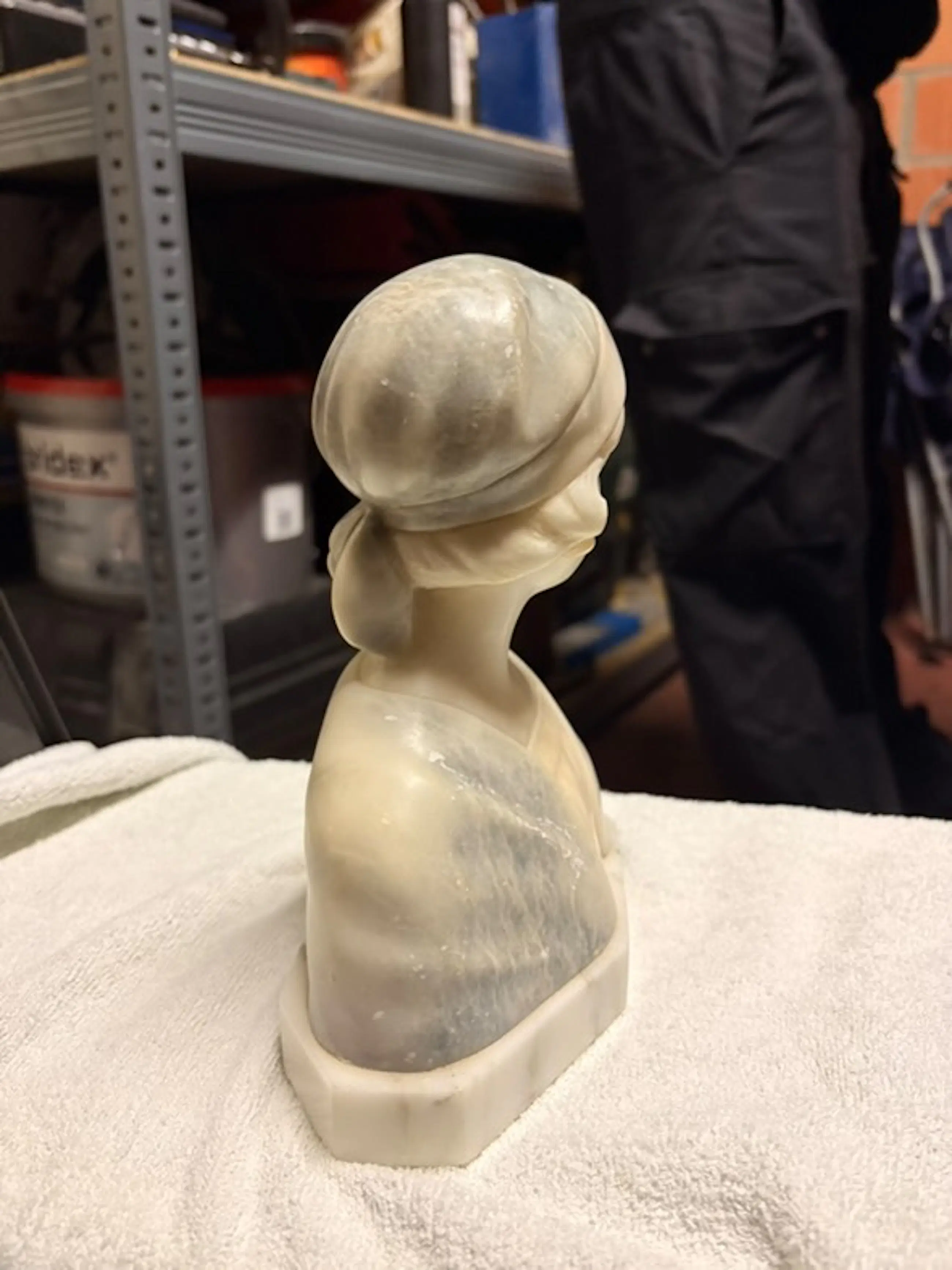 Een antieke albasten buste van een jonge vrouw in witte en grijze tinten.