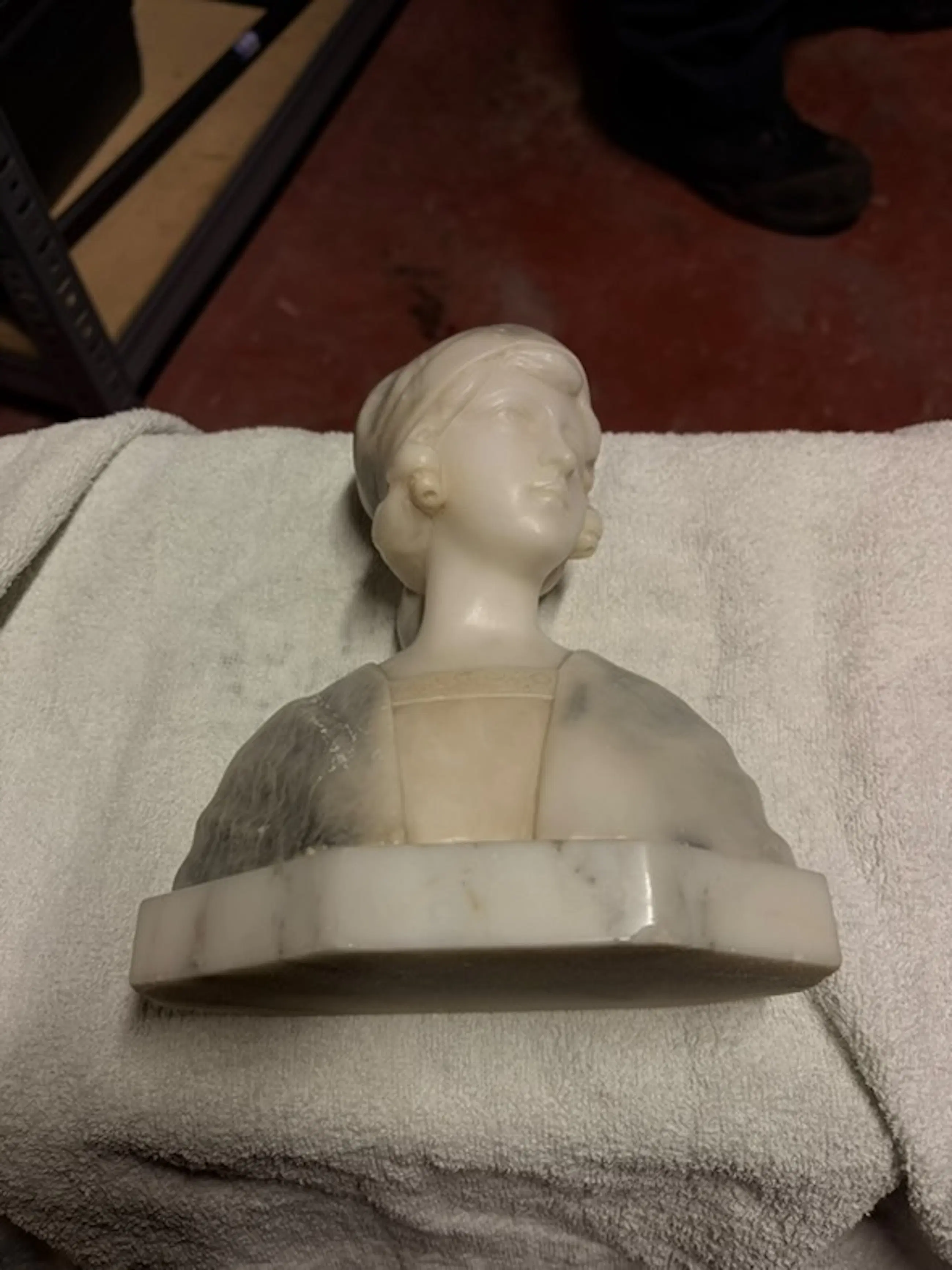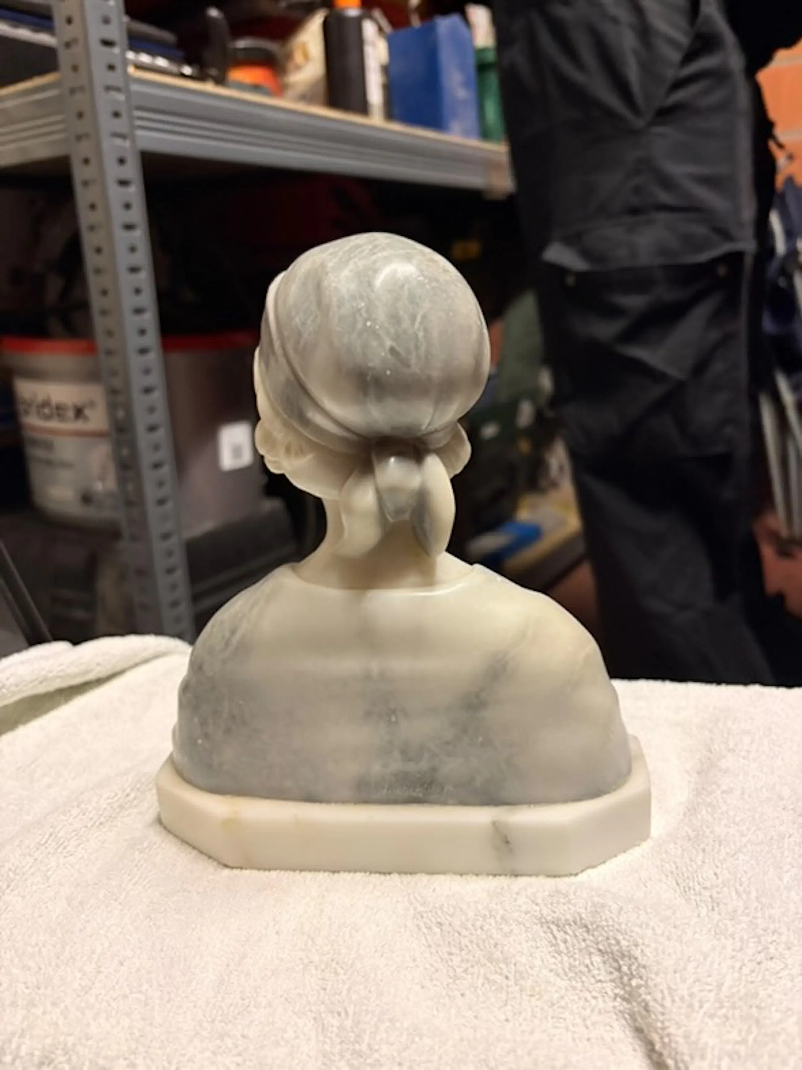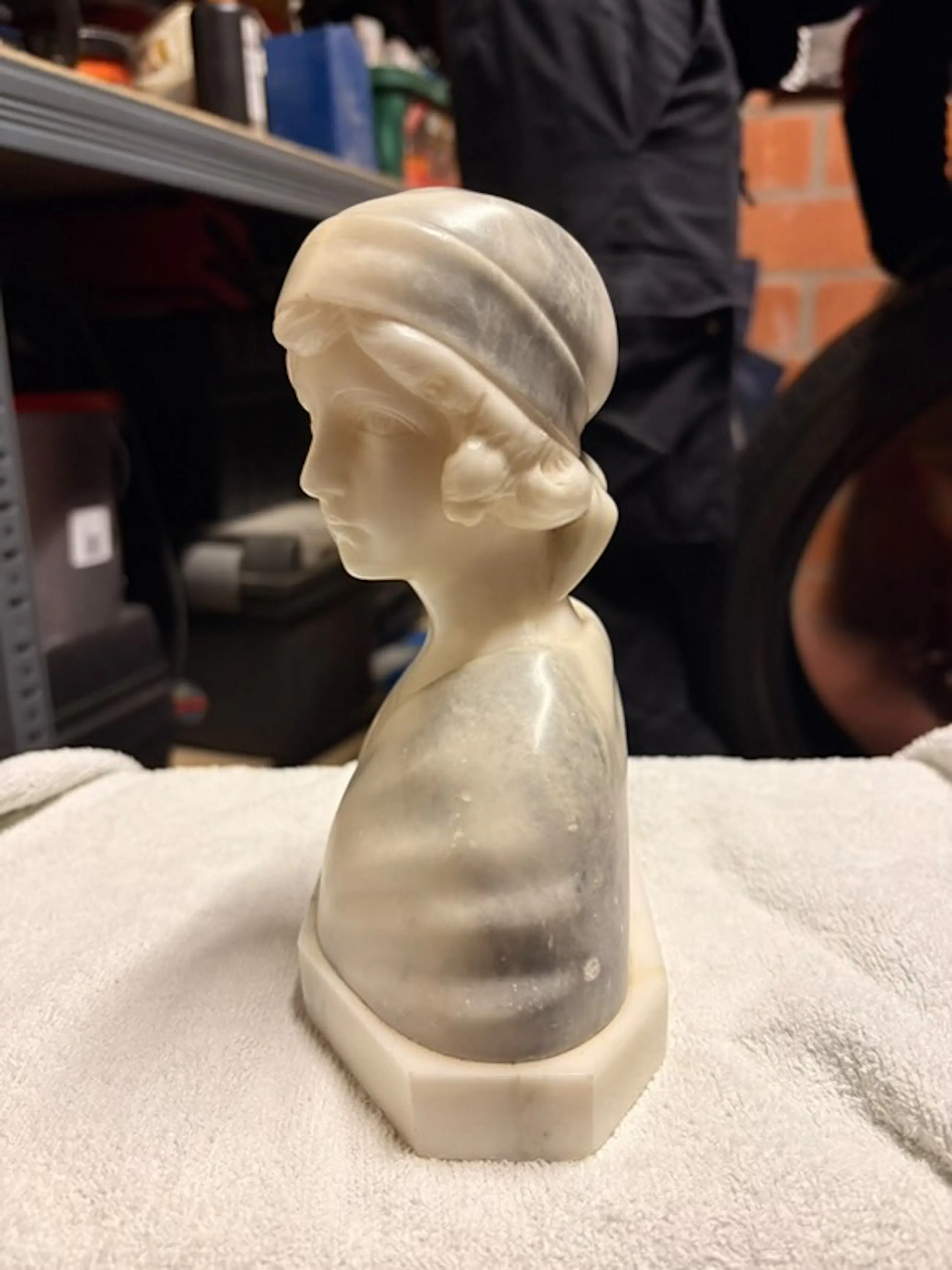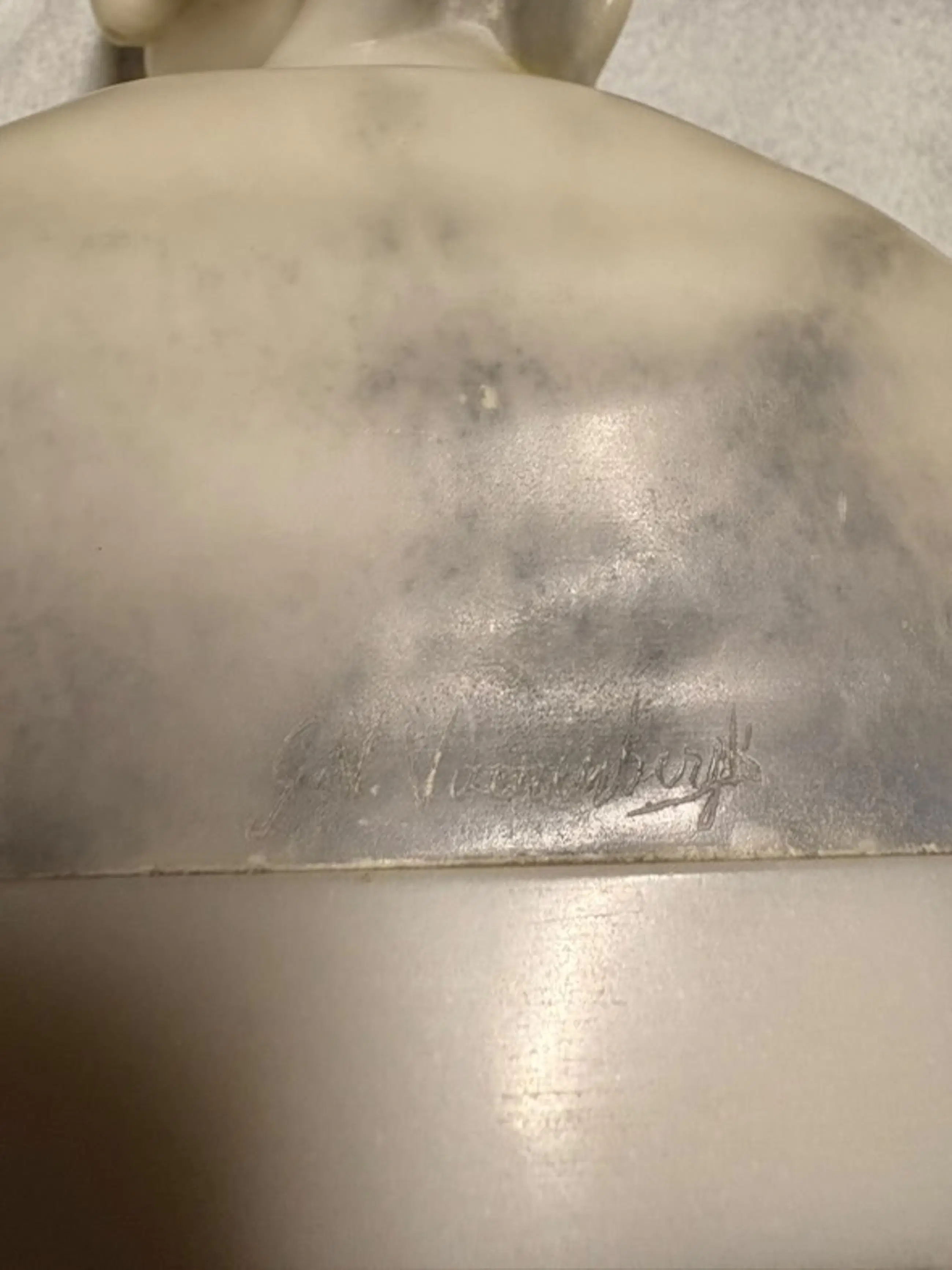 Een antieke albasten buste van een jonge vrouw in witte en grijze tinten.