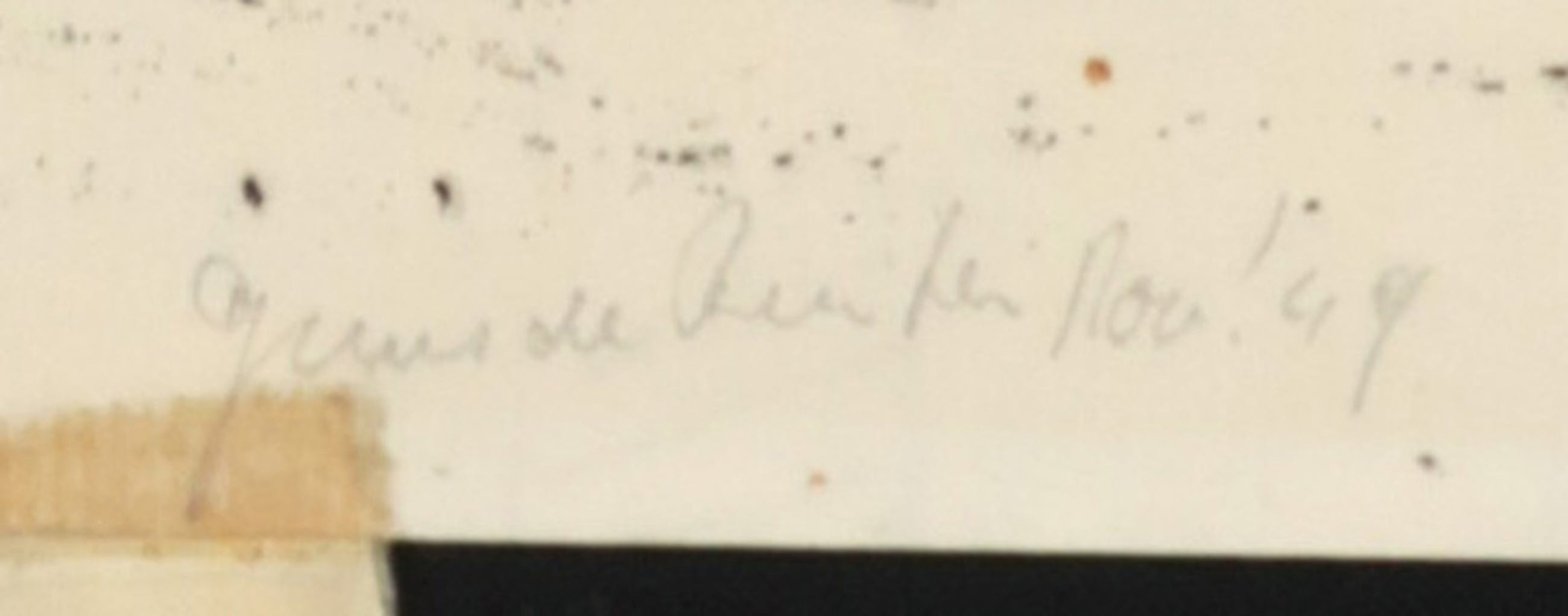 Conditie: In redelijke staat. Het blad is rondom verkleurd door een eerdere inlijsting. Daarnaast is er op de hoeken en het midden van elke zijde verkleuring zichtbaar dat afkomstig is door het gebruik van tape. Aan de bovenkant is het papier gescheurd. Bij opnieuw inlijsten is dit niet meer zichtbaar.