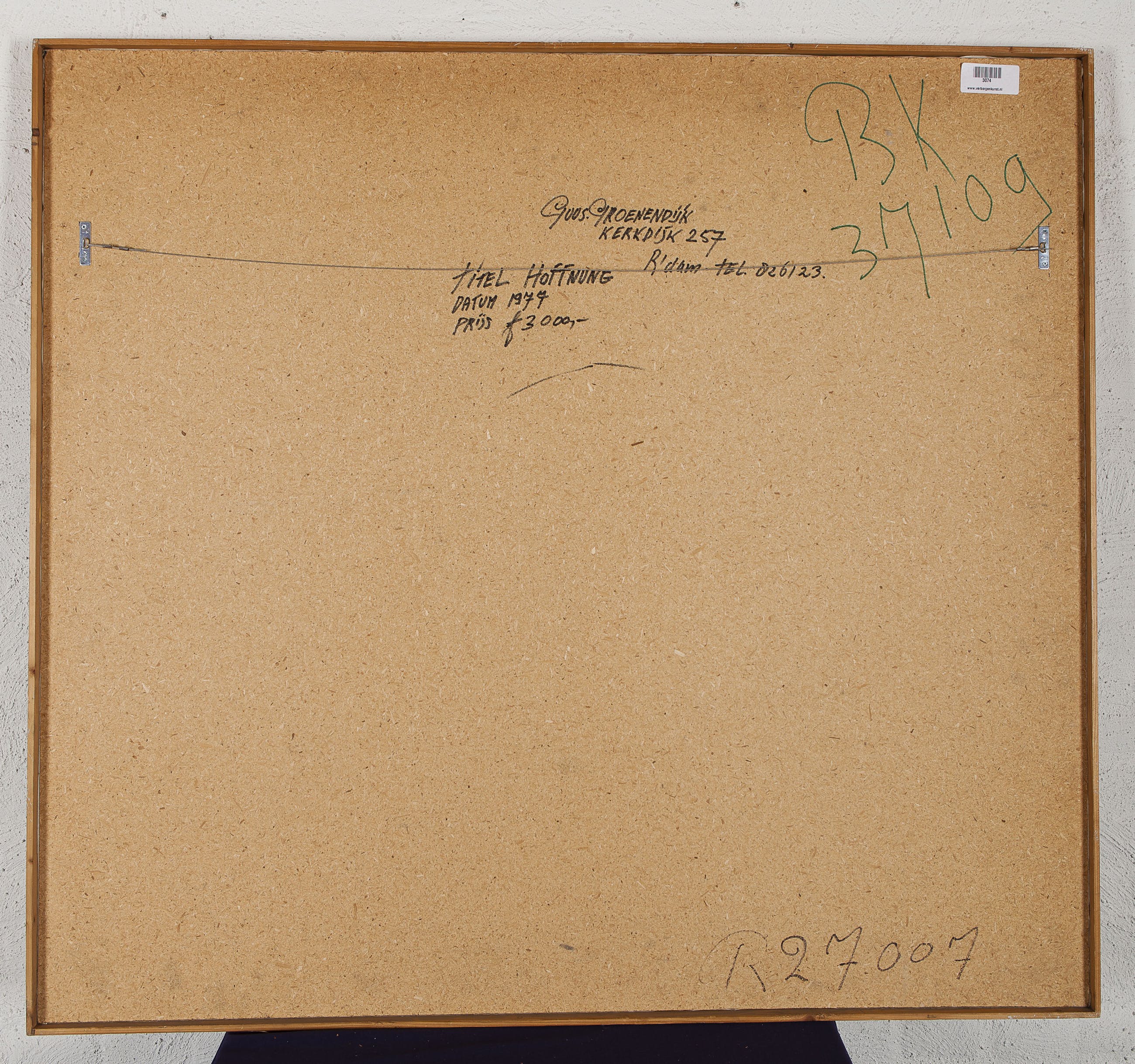| Het doek is in redelijke staat, met uitzondering van enkele lichte beschadigingen aan de randen van het doek. Oorspronkelijke prijs in 1977 zoals vermeld op achterzijde: fl. 3000,- | |