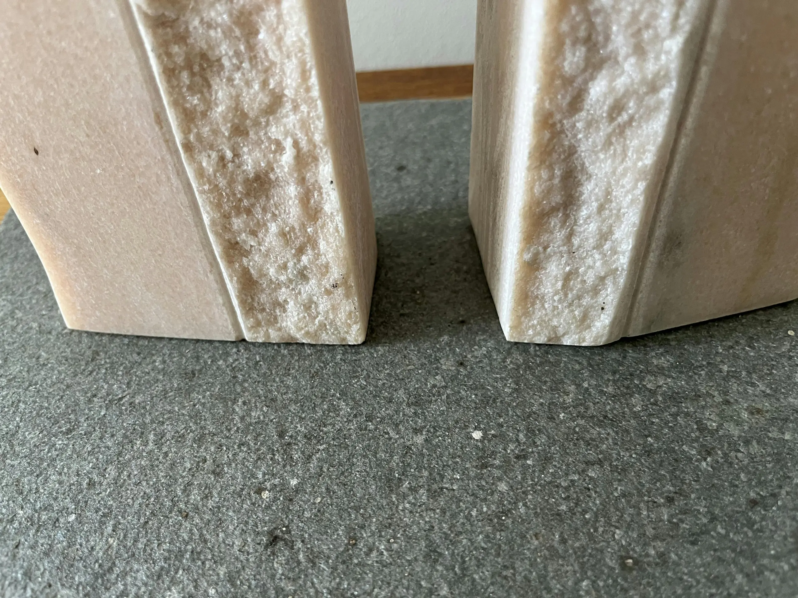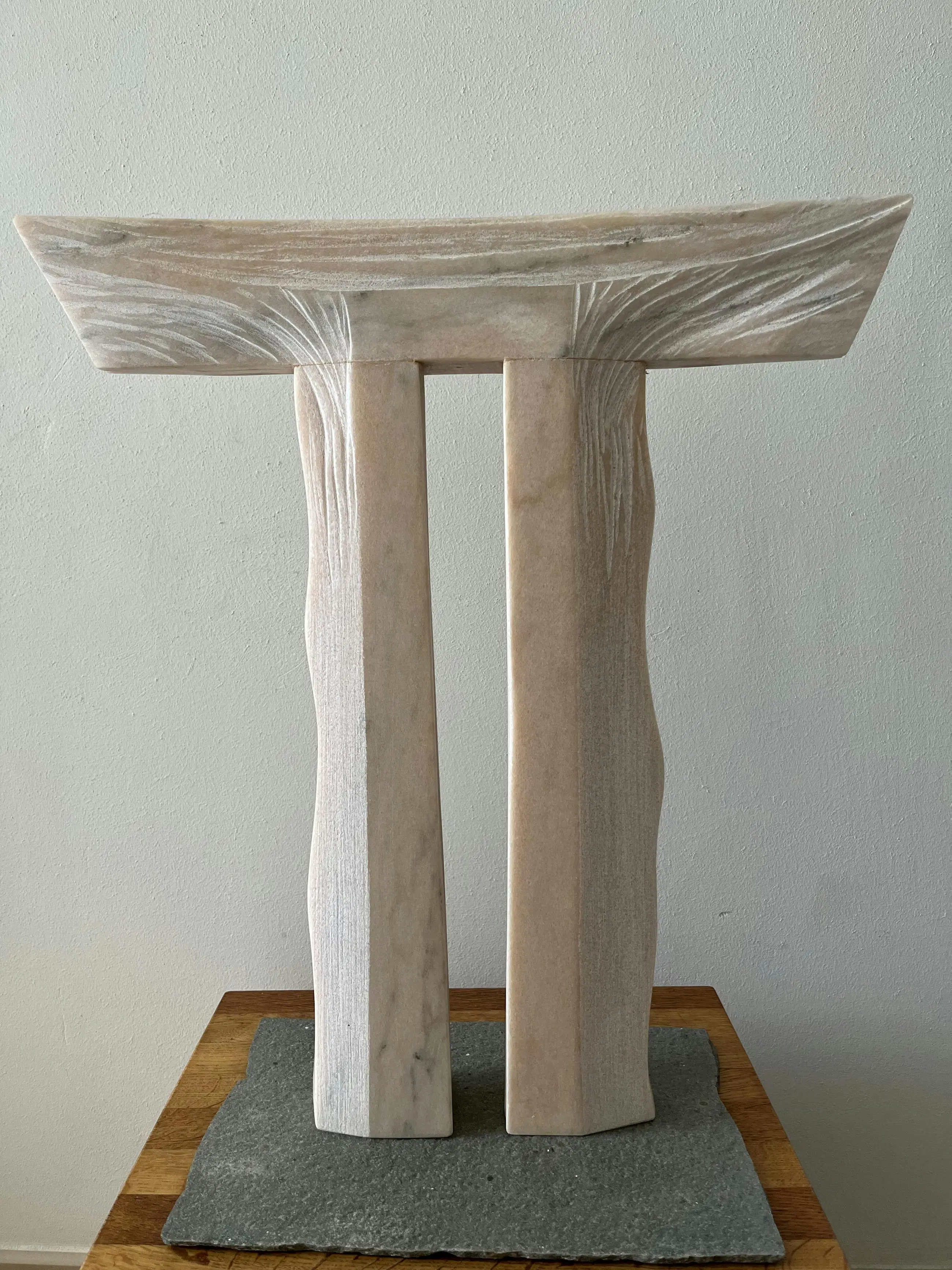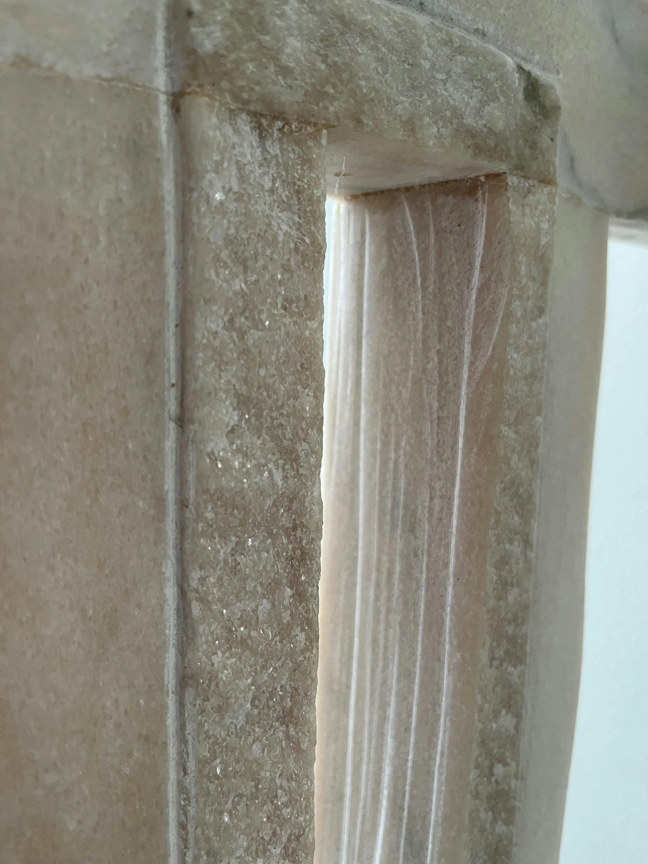 Fraaie poort van rose-witte marmer, vastgeschroeft op een dikke leistenen voet. Heeft twee verschillende kanten. Afmeting beeld 54 x 49 x6,5 cm. Voet 1 x 33,5 x 23 cm. Totale hoogte 55 cm. Gewicht 16,3 kg.