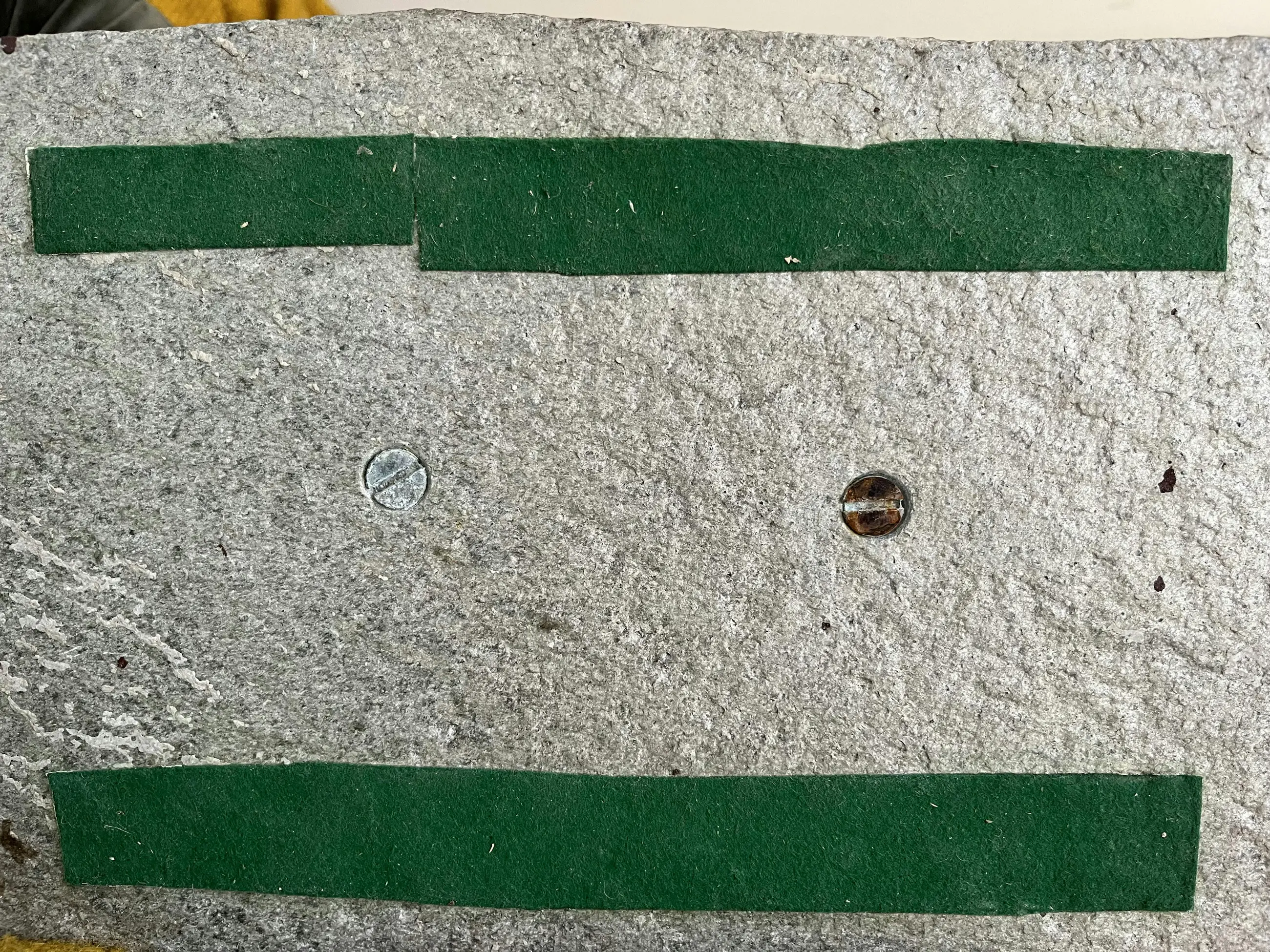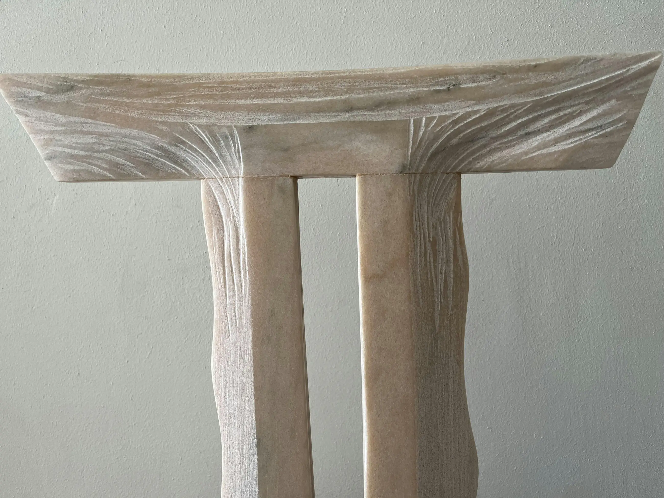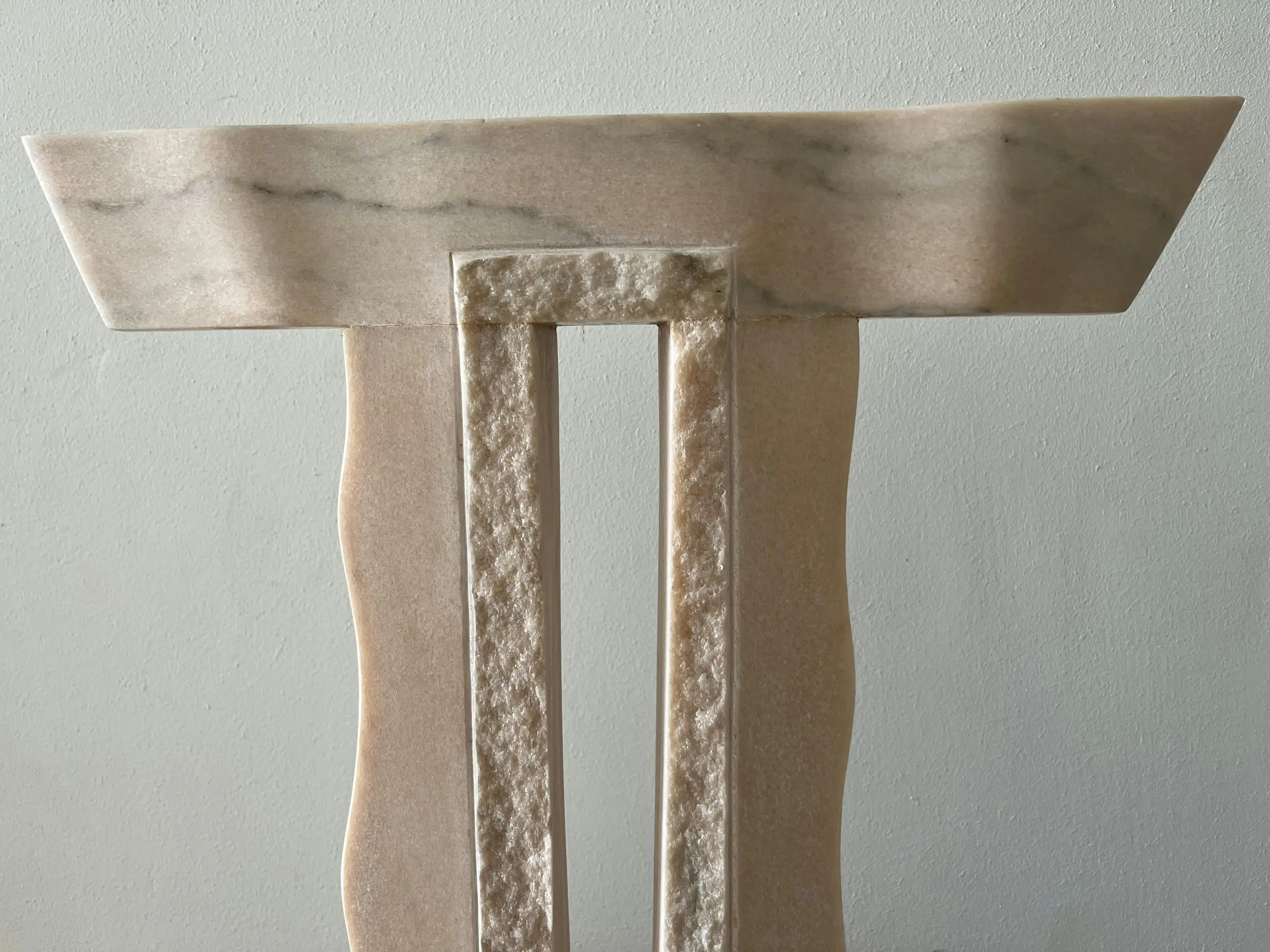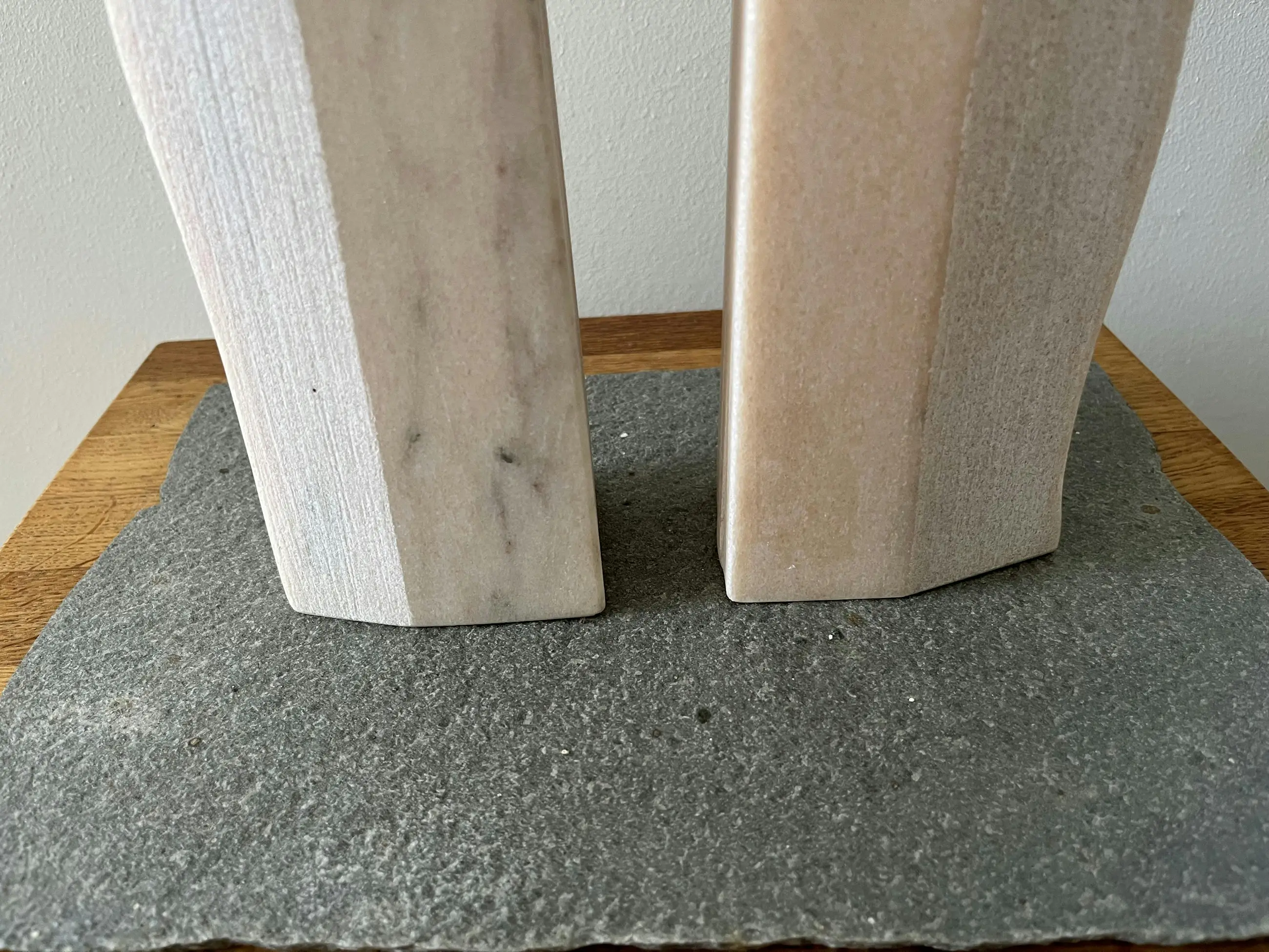 Fraaie poort van rose-witte marmer, vastgeschroeft op een dikke leistenen voet. Heeft twee verschillende kanten. Afmeting beeld 54 x 49 x6,5 cm. Voet 1 x 33,5 x 23 cm. Totale hoogte 55 cm. Gewicht 16,3 kg.