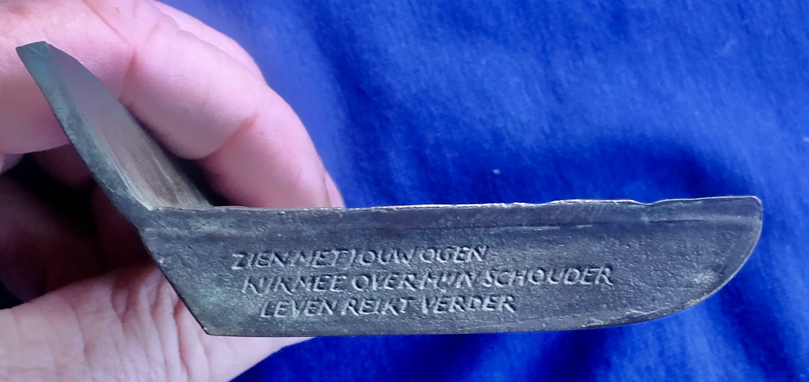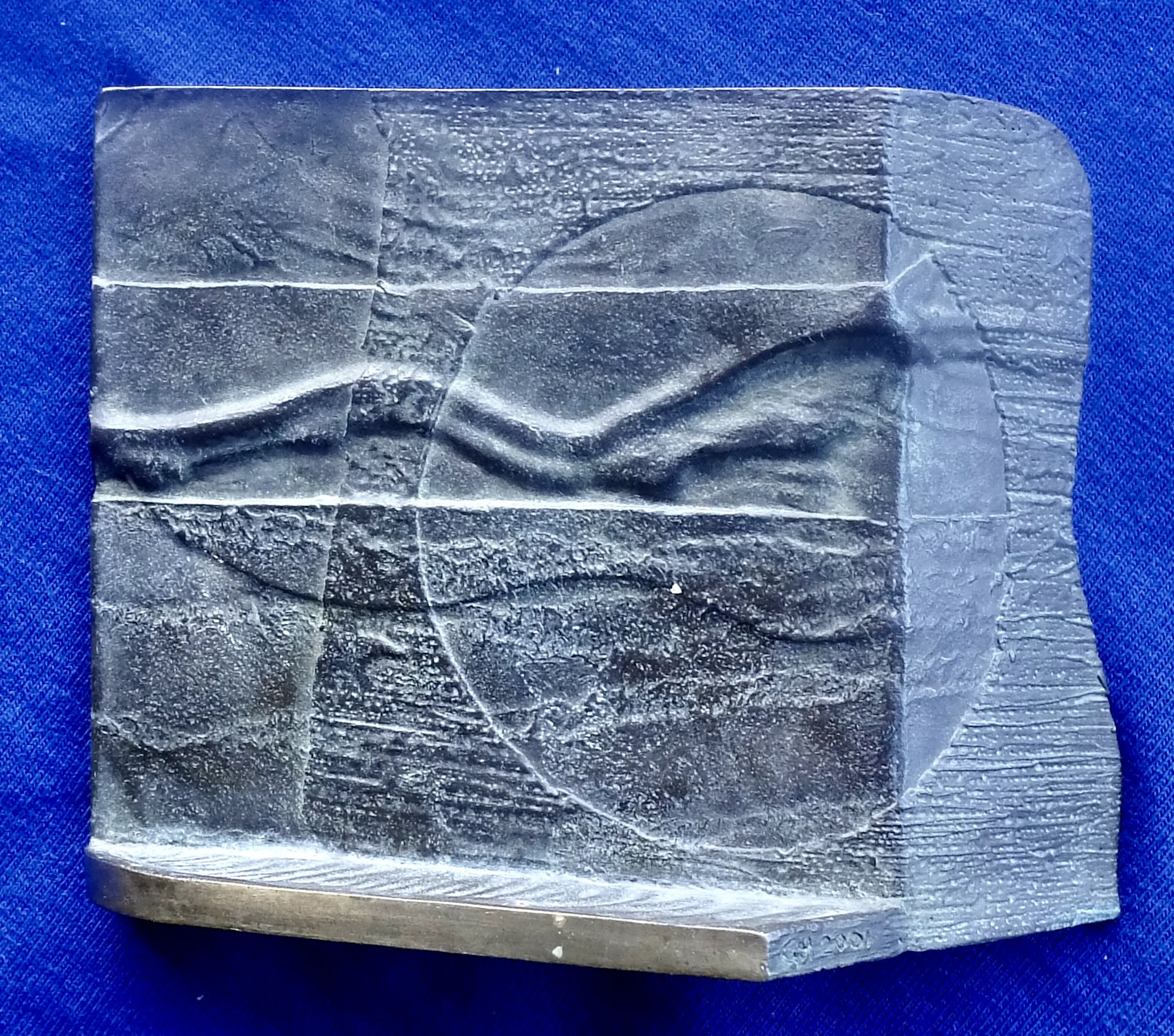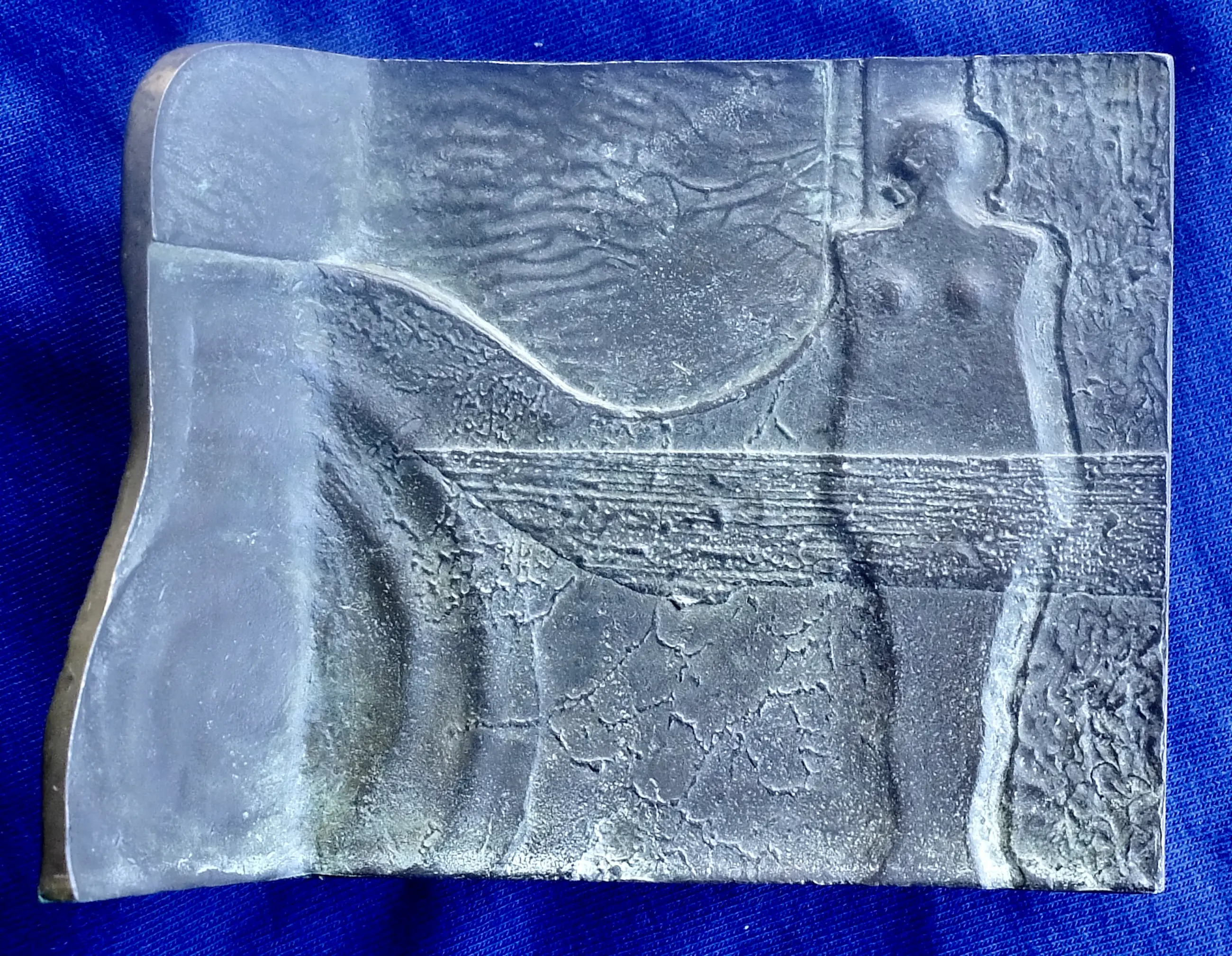 Guus Hellegers [1937-2019] staande bronzen plaquette hoogte 7,15, breedte 9 cm; op de onerkant staat gegraveerd : ‘zien met jouw ogen kijk mee over mijn schouder leven reikt verder’