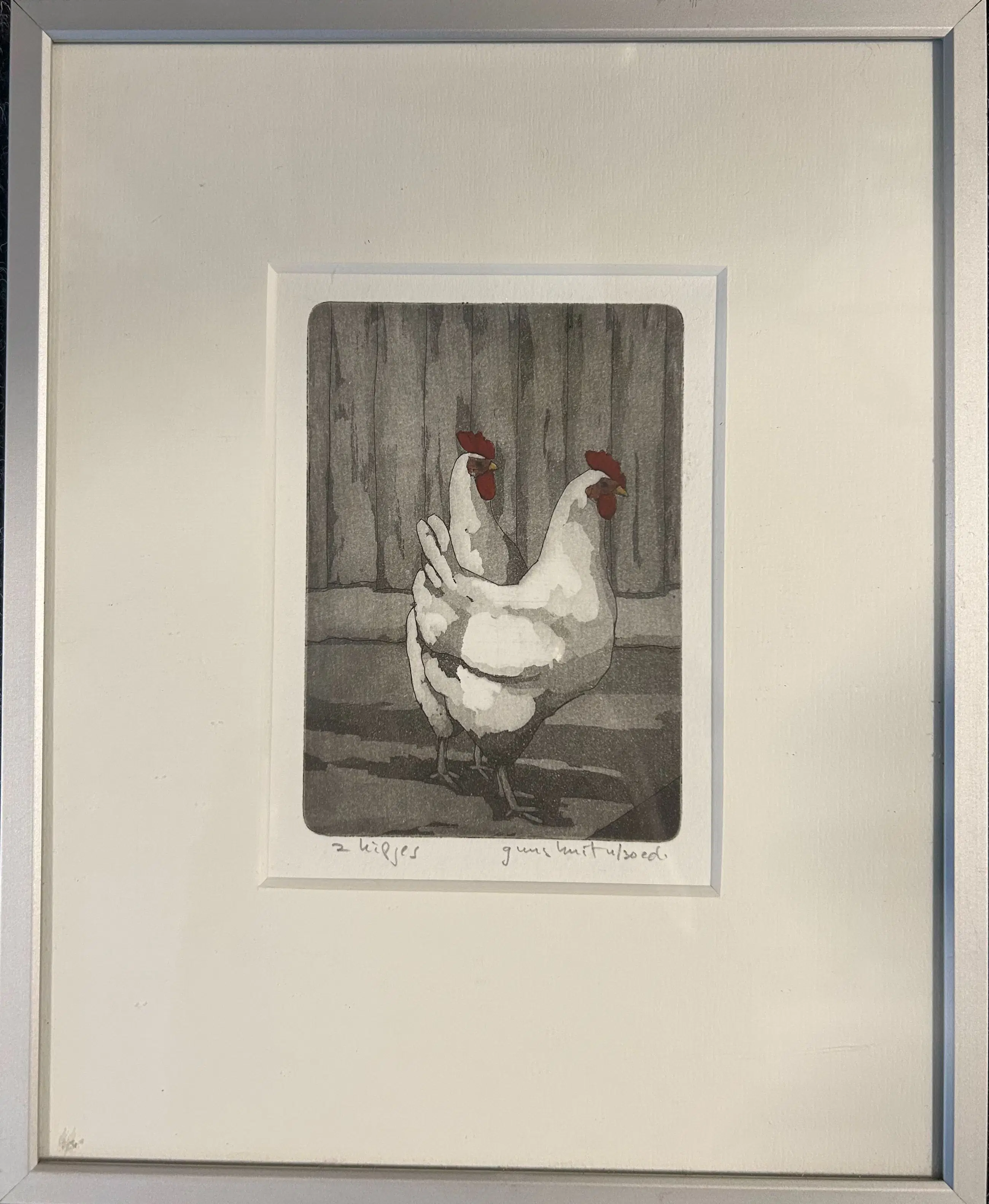 Grafisch werk van Guus Kuit – Twee kipjes Mooi werk van Guus Kuit met een voorstelling van twee kipjes. Het betreft een genummerde oplage, nummer 4 van 30. Het werk verkeert in goede staat, is voorzien van een bijpassende lijst en bevindt zich achter glas. Zie foto’s voor een verdere indruk van het geheel en de staat van het werk.
