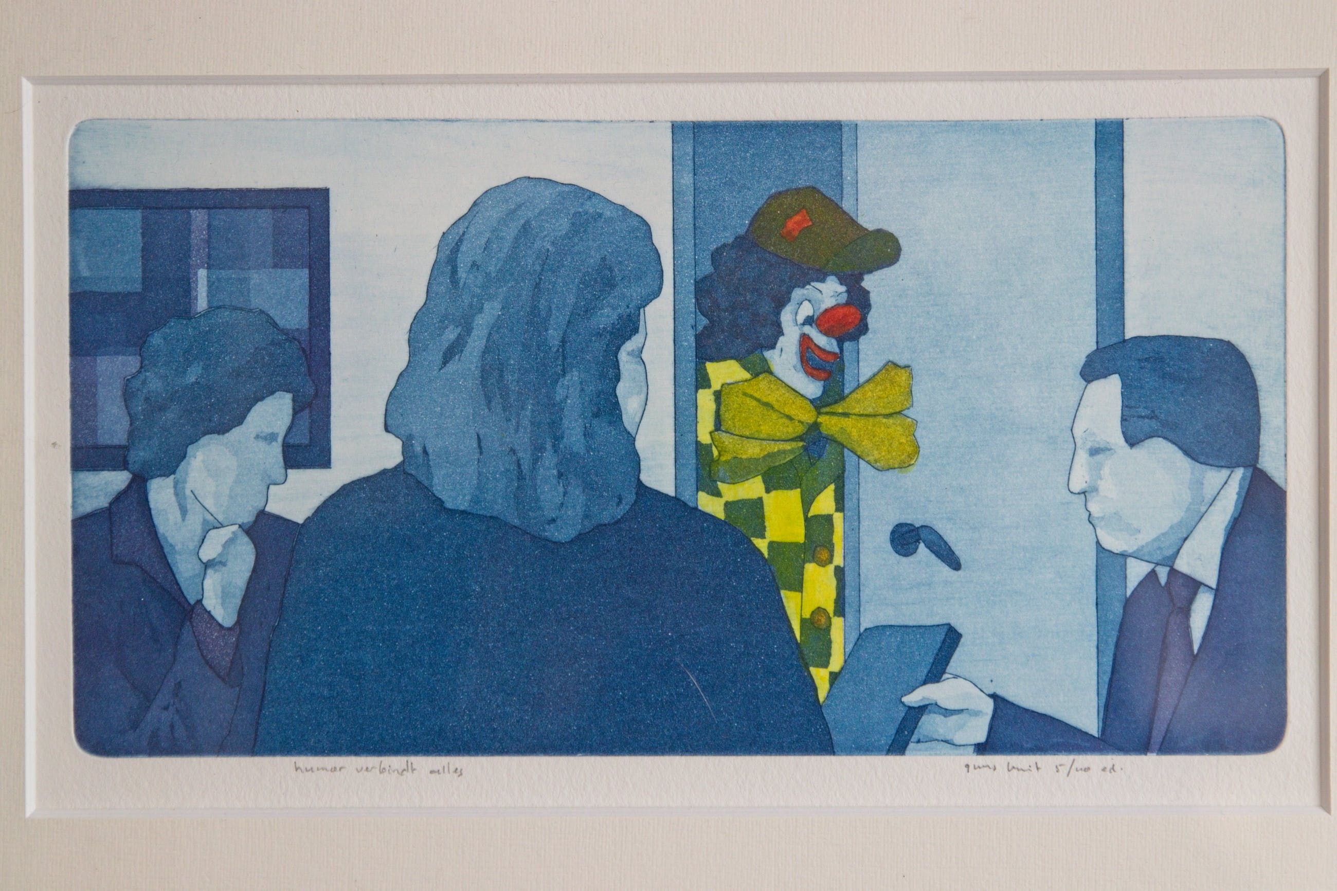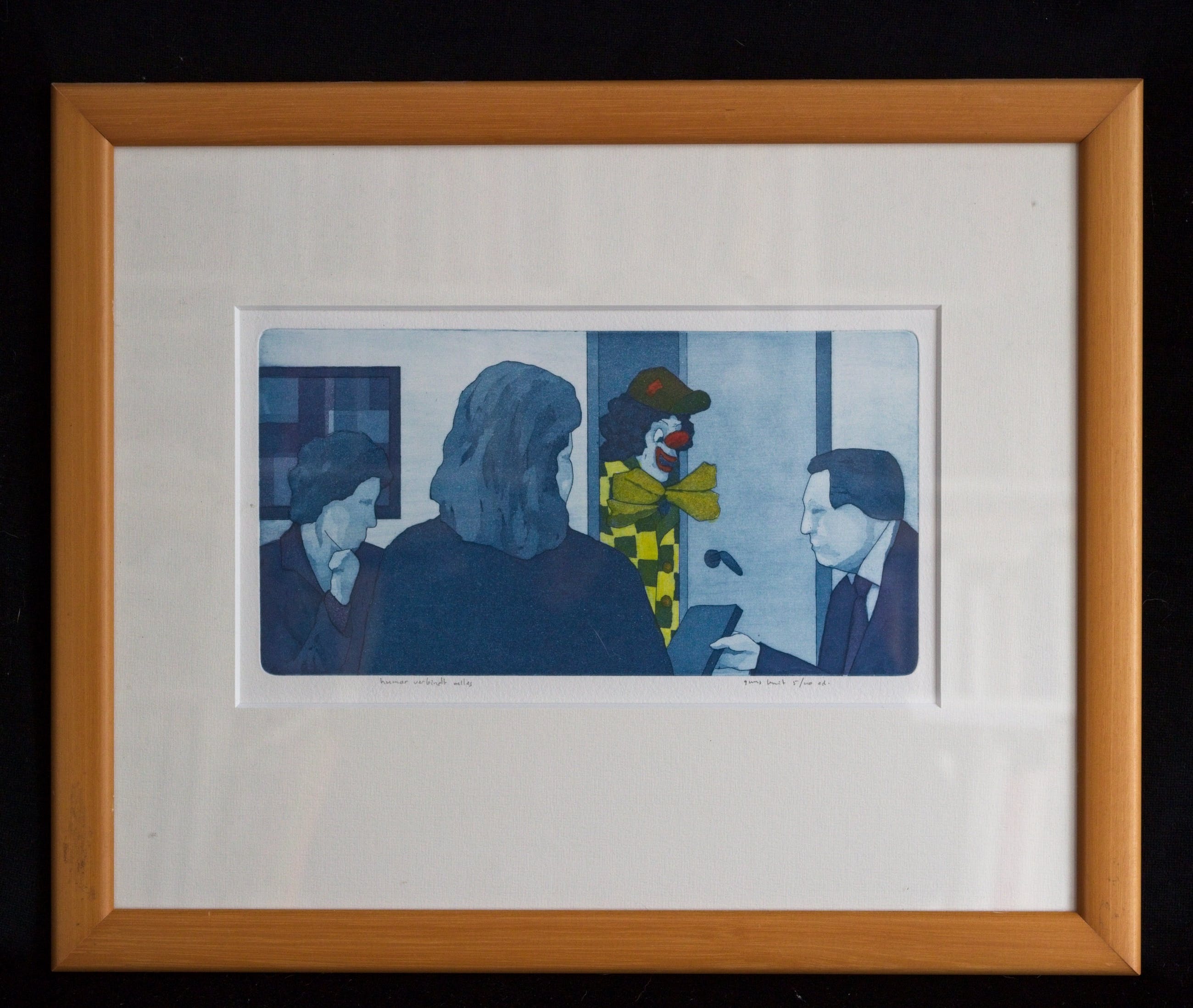 Guus Kuit houdt zich al meer dan dertig jaar bezig met etsen. 'Humor verbindt alles’ lijkt een beetje afwijkend van zijn meer bekende werk waarvoor hij zijn inspiratie haalt uit zijn directe omgeving: het Veluwse platteland, maar is onmiskenbaar een 'Guus Kuit'. Hij is vooral bekend door de subtiele kleuropbouw in zijn werk. Bij het werk ‘Humor verbindt alles’ maar hij daar ook duidelijk gebruik van. Door de sfeervolle vormentaal, rijke kleuropbouw en grote technische vaardigheden zijn de etsen van Guus Kuit herkenbaar. ‘Humor verbindt alles’ vormt daarbij geen uitzondering.