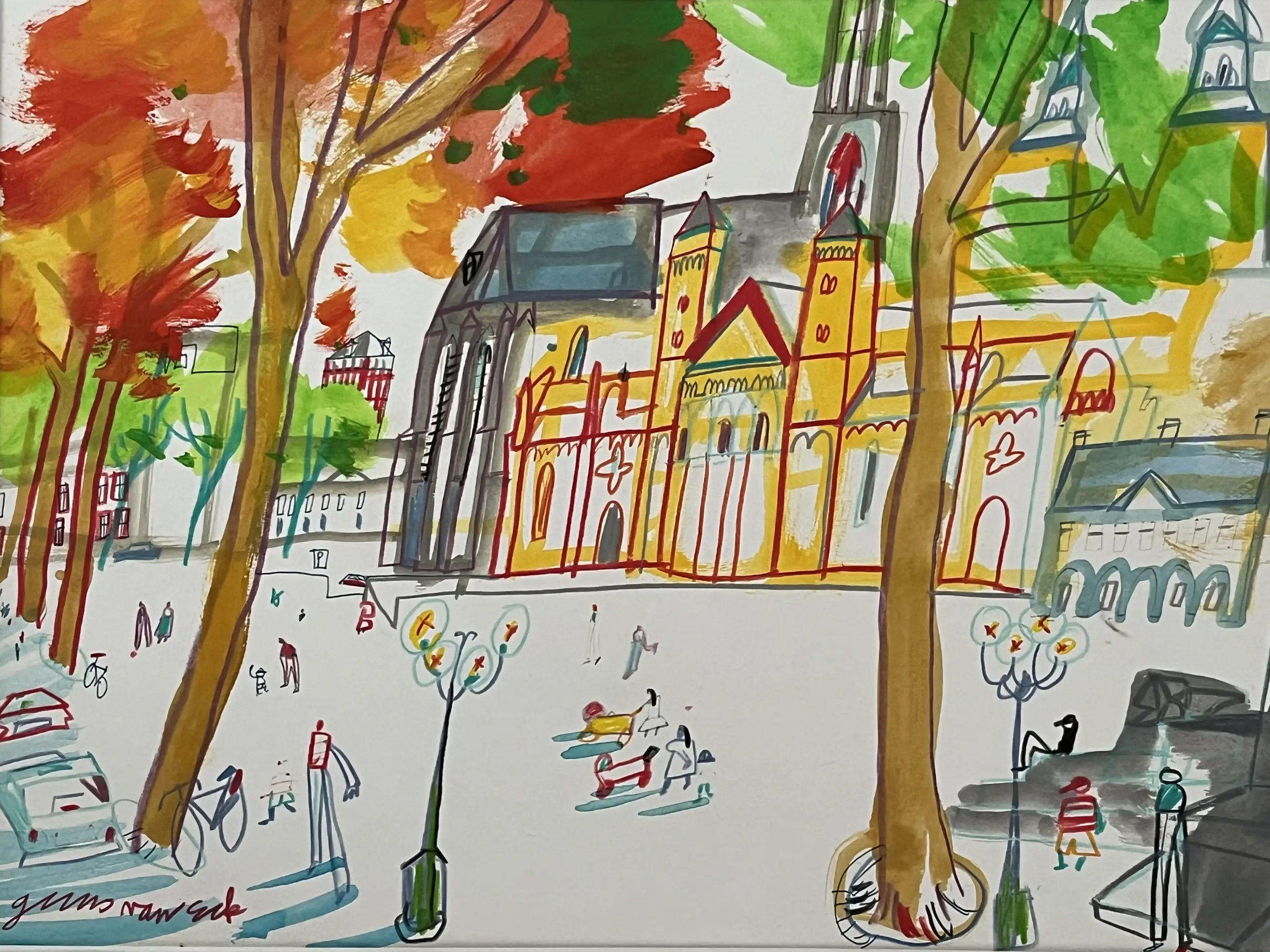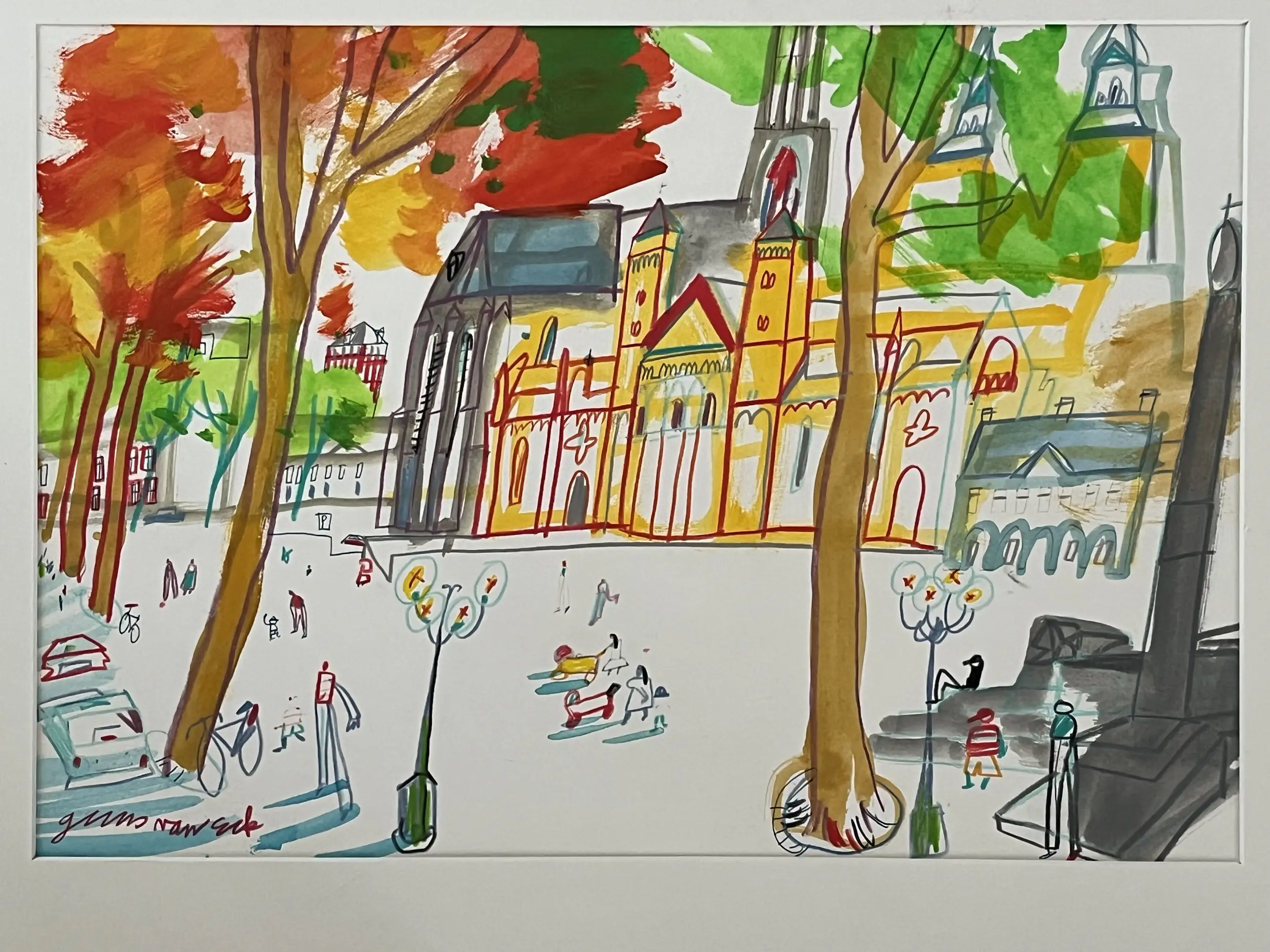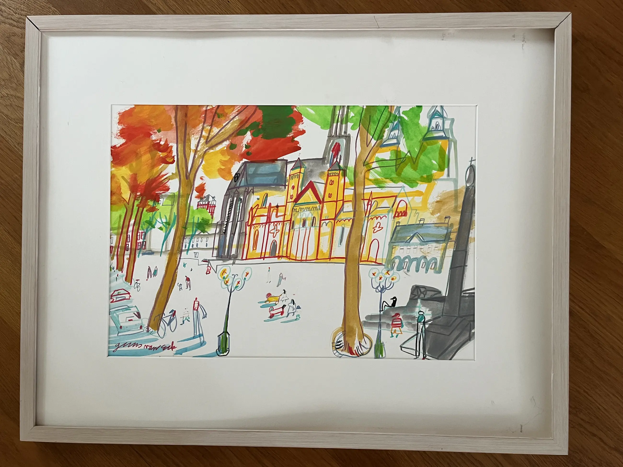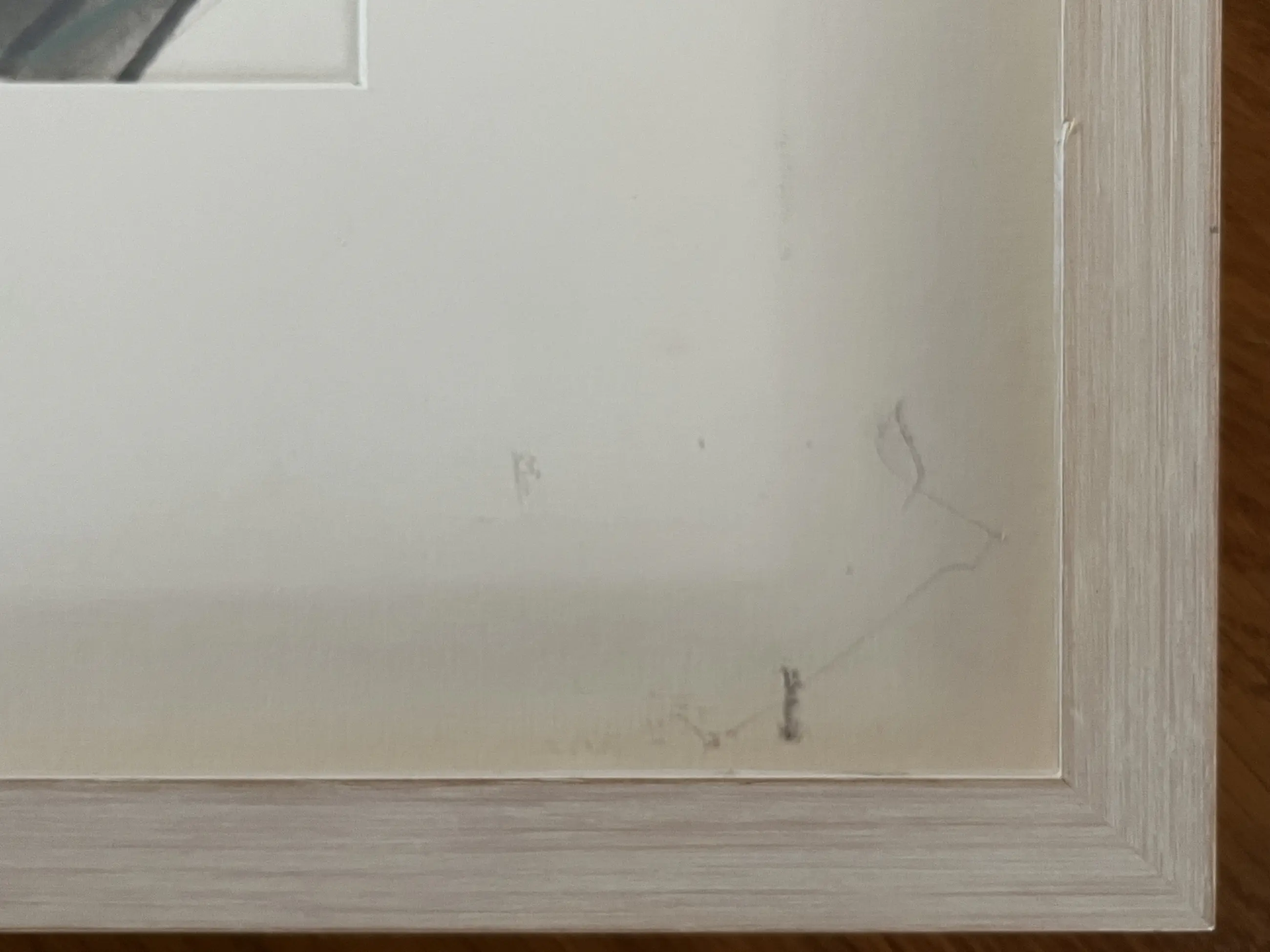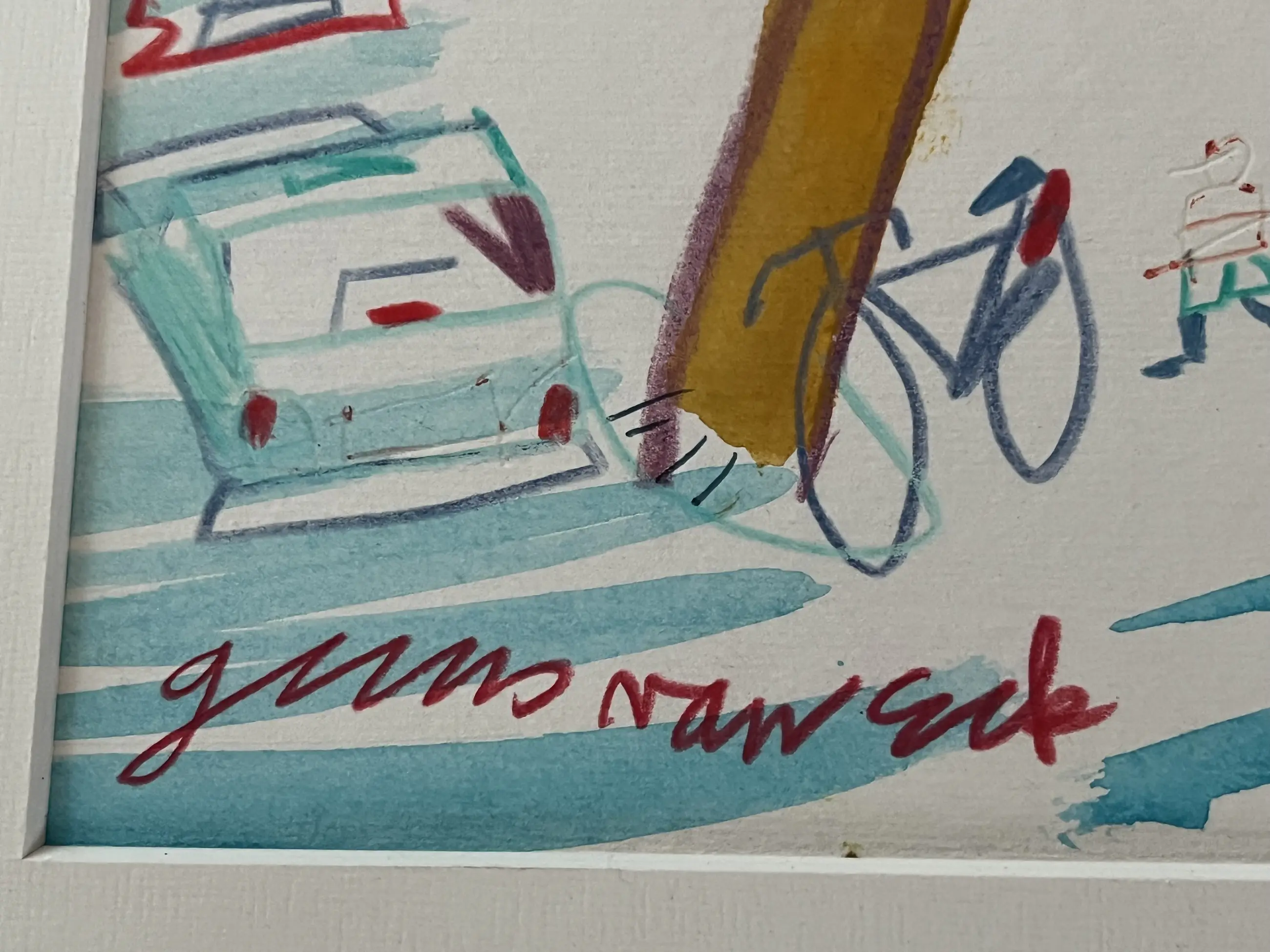 Karakteristiek werk uit 2000. Het werk is gelijst in witgewassen houten lijst, maar er zit GEEN GLAS meer in. Helaas heeft de passe partout ook wat smoezelige plekjes (detailfoto) Afmeting afbeelding 34 x 49 cm. Inclusief lijst 57 x 71,5 cm.