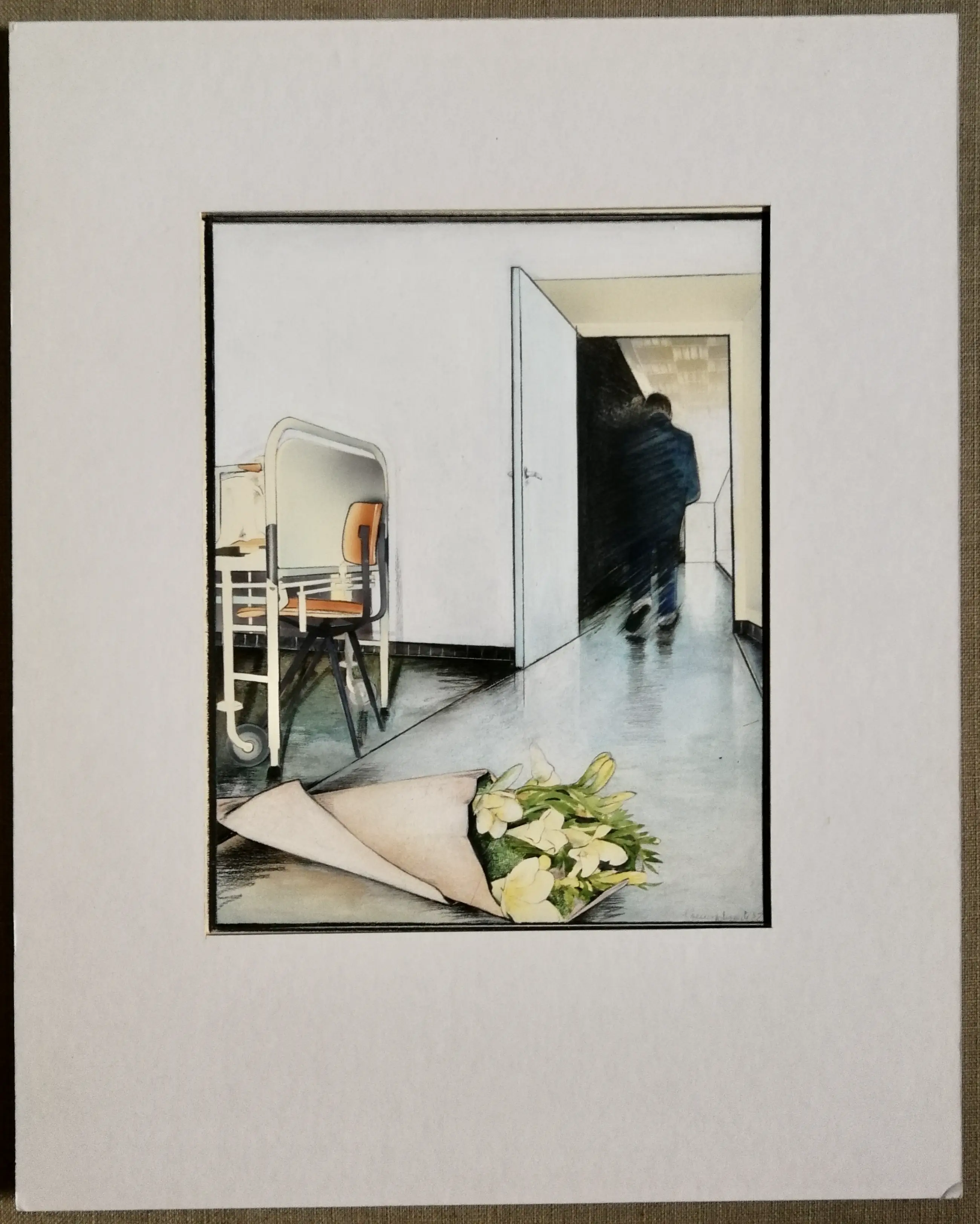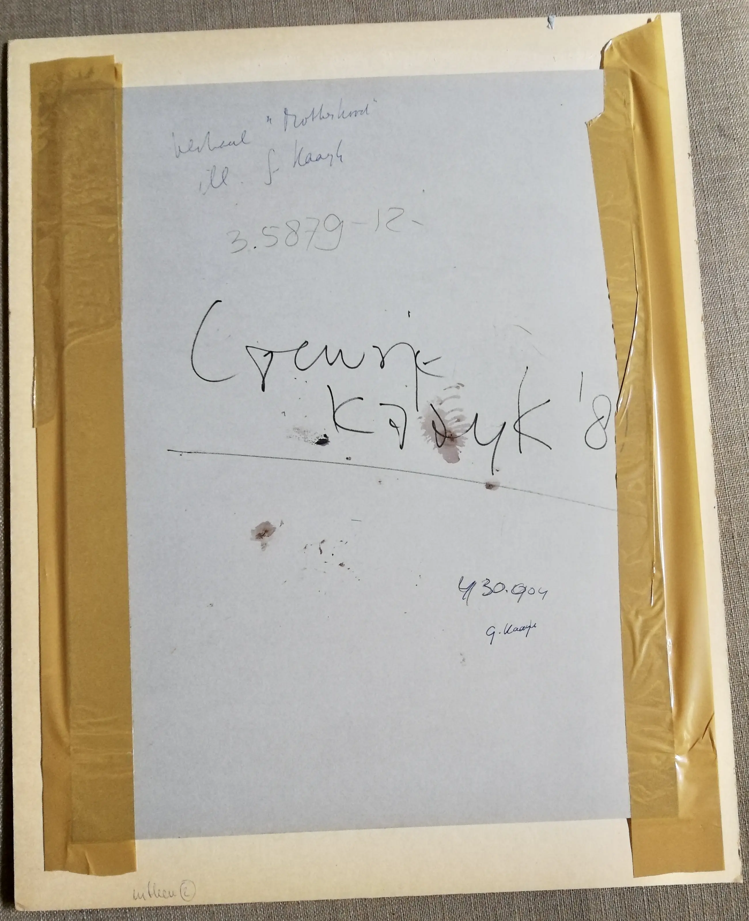 Schilderij op karton van Guusje Kaak, gesigneerd en gedateerd in potlood, geplaatst achter passe-partout. Verzending tussen twee platen, 9,25, aangetekend 11,20