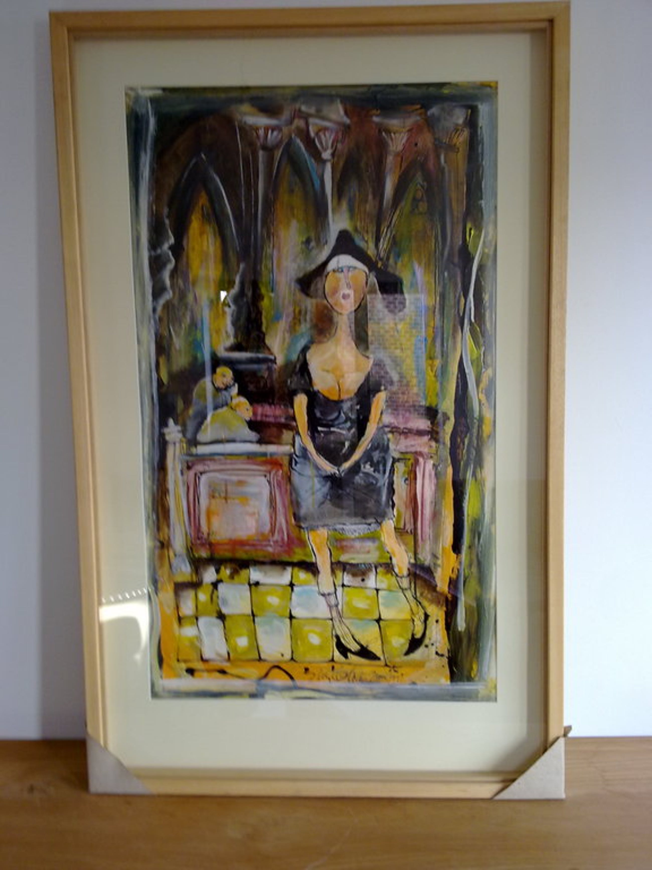Technieken: Gemengde technieken.Olieverf-Acrylverf-Oostindische inkt- potlood- enz.op dik schilderskarton in passe partout achter glas.