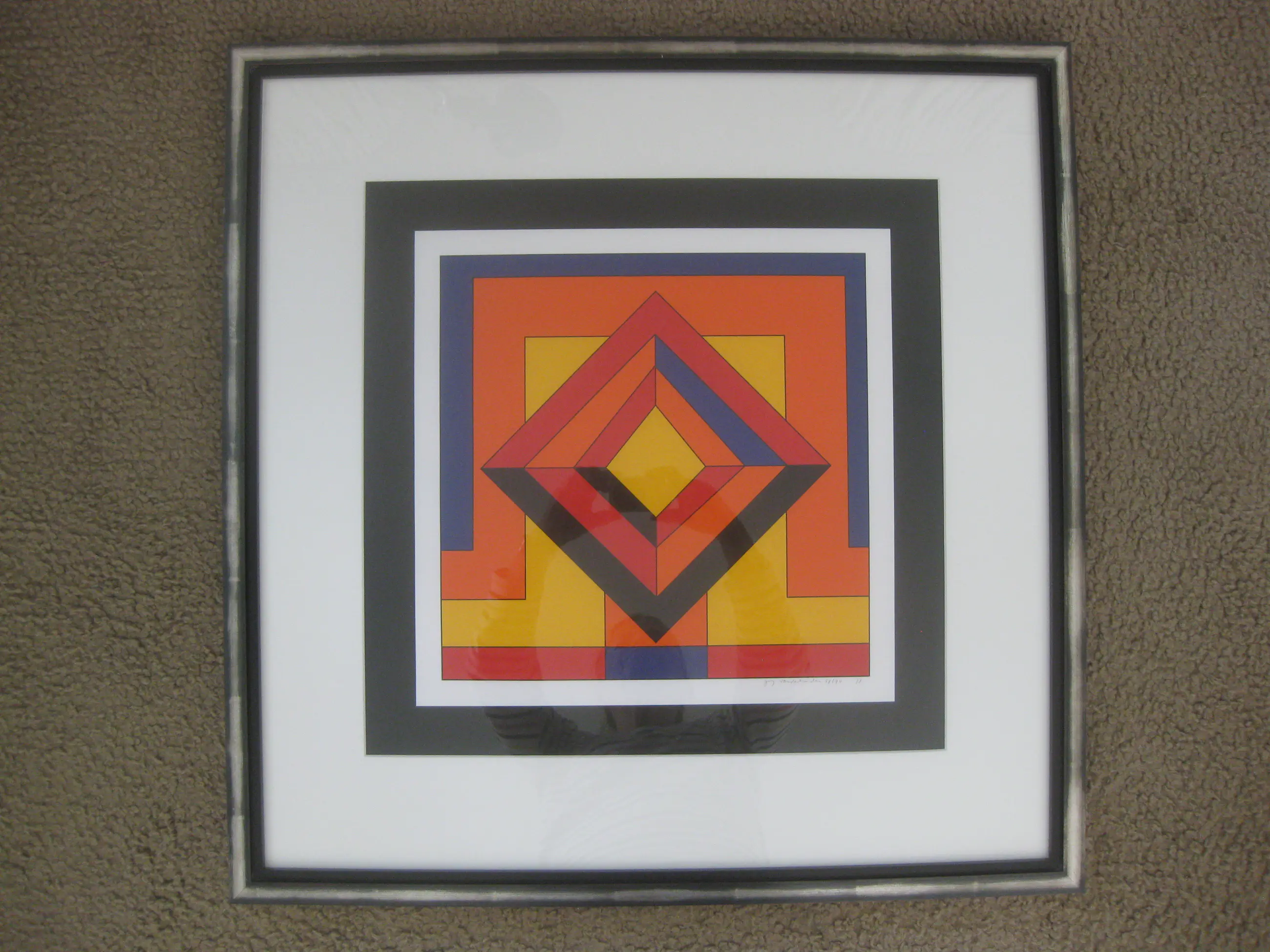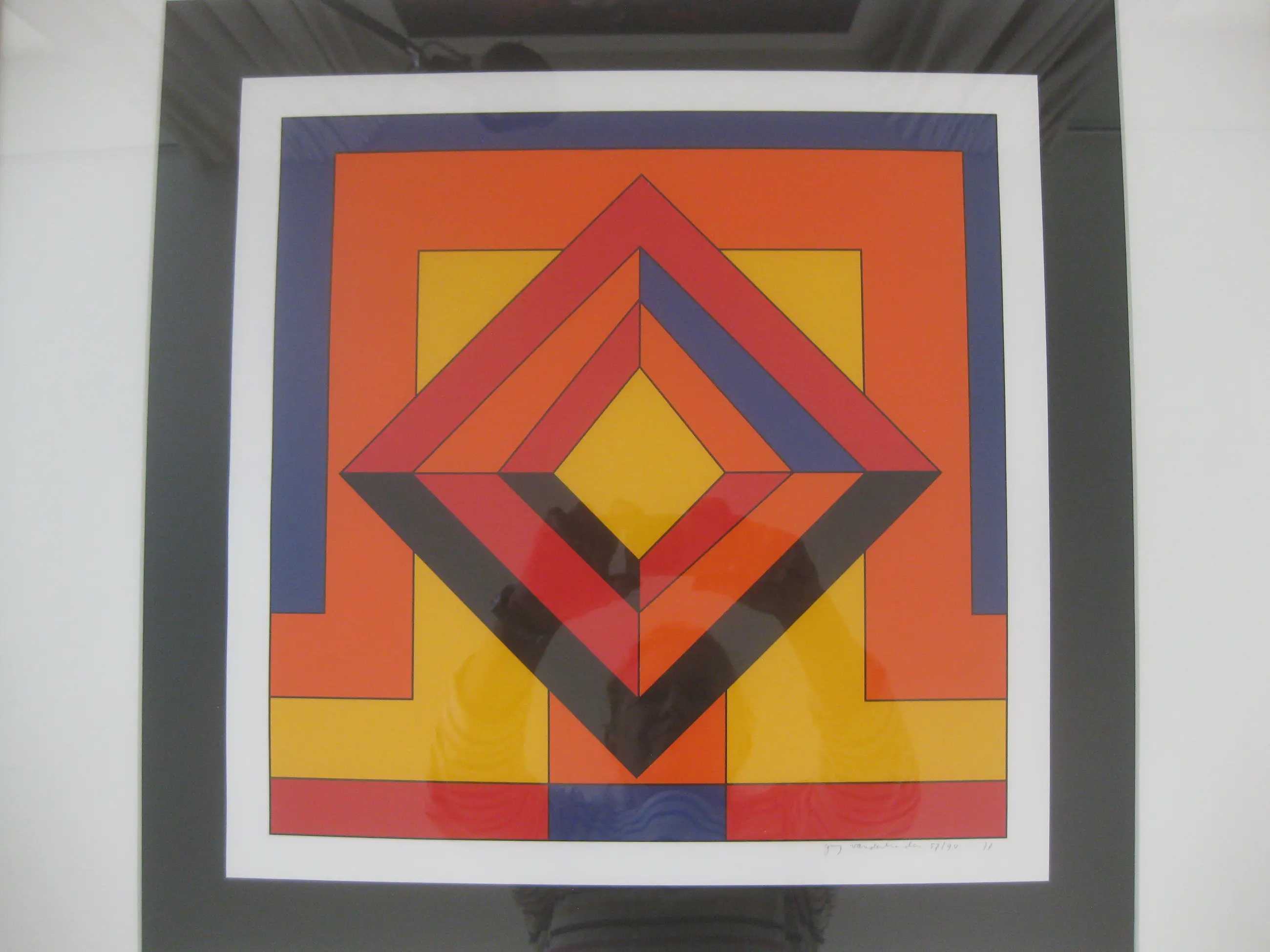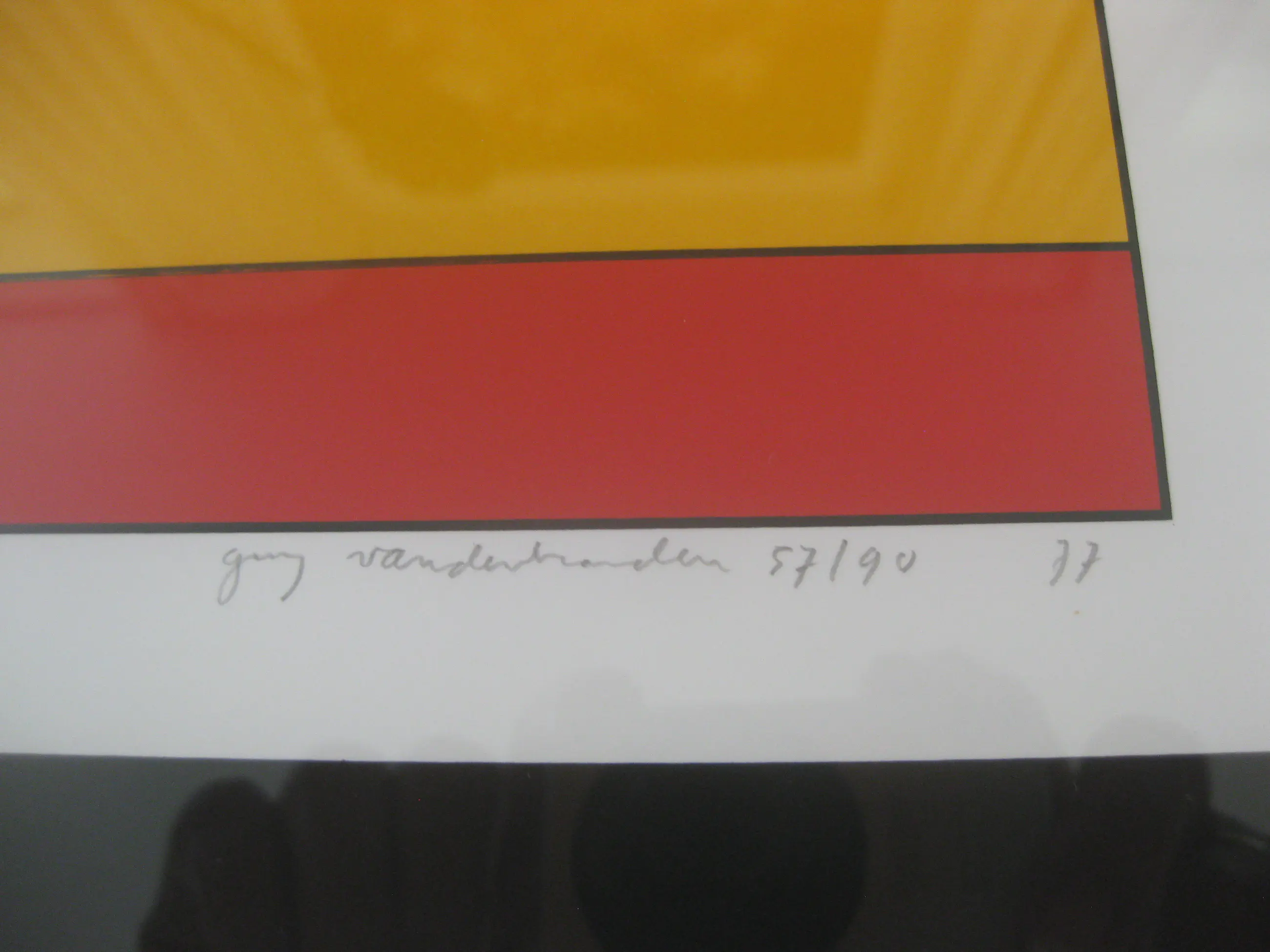 Guy Vandenbranden wordt wel als 1 van de belangrijkste abstracte kunstenaars van België gezien Ook dit werk laat hem weer zien van zijn sterke kant als constructivist Een werk in mooie heldere kleuren voorzien van passe-partout en ingelijst in lijst met inleg De zeefdruk zelf is 55 x 55 cm maar valt gedeeltelijk onder het passe-partout