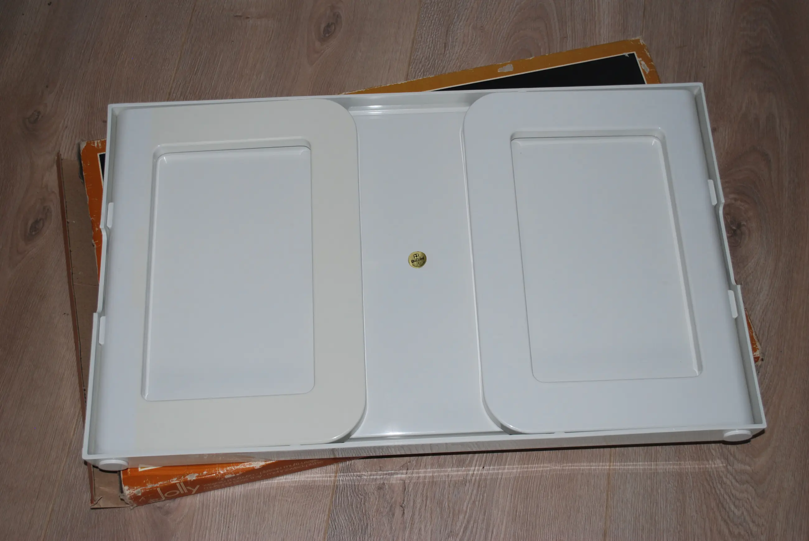 Ca. jaren 70. Kunststof multi-functioneel blad. In prima gebruikte staat, zeer lichte verkleuring aan 1 uitklapdeel zie foto. De doos heeft enige slijtage.