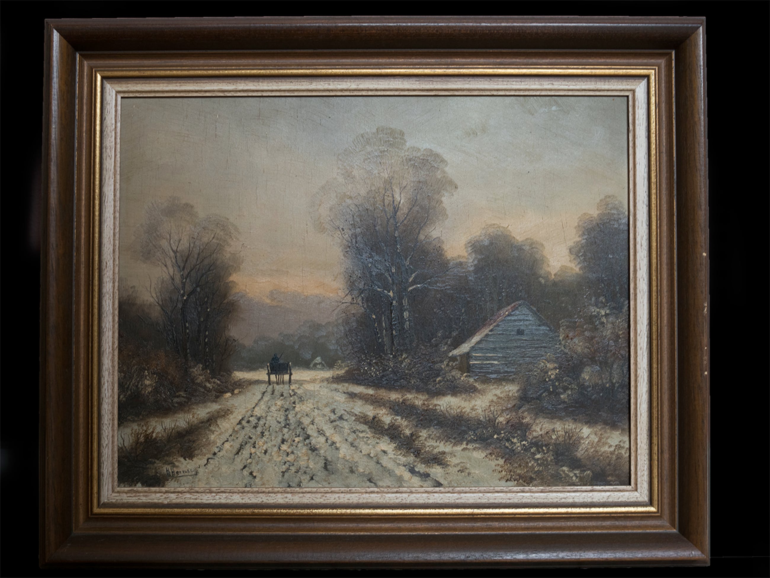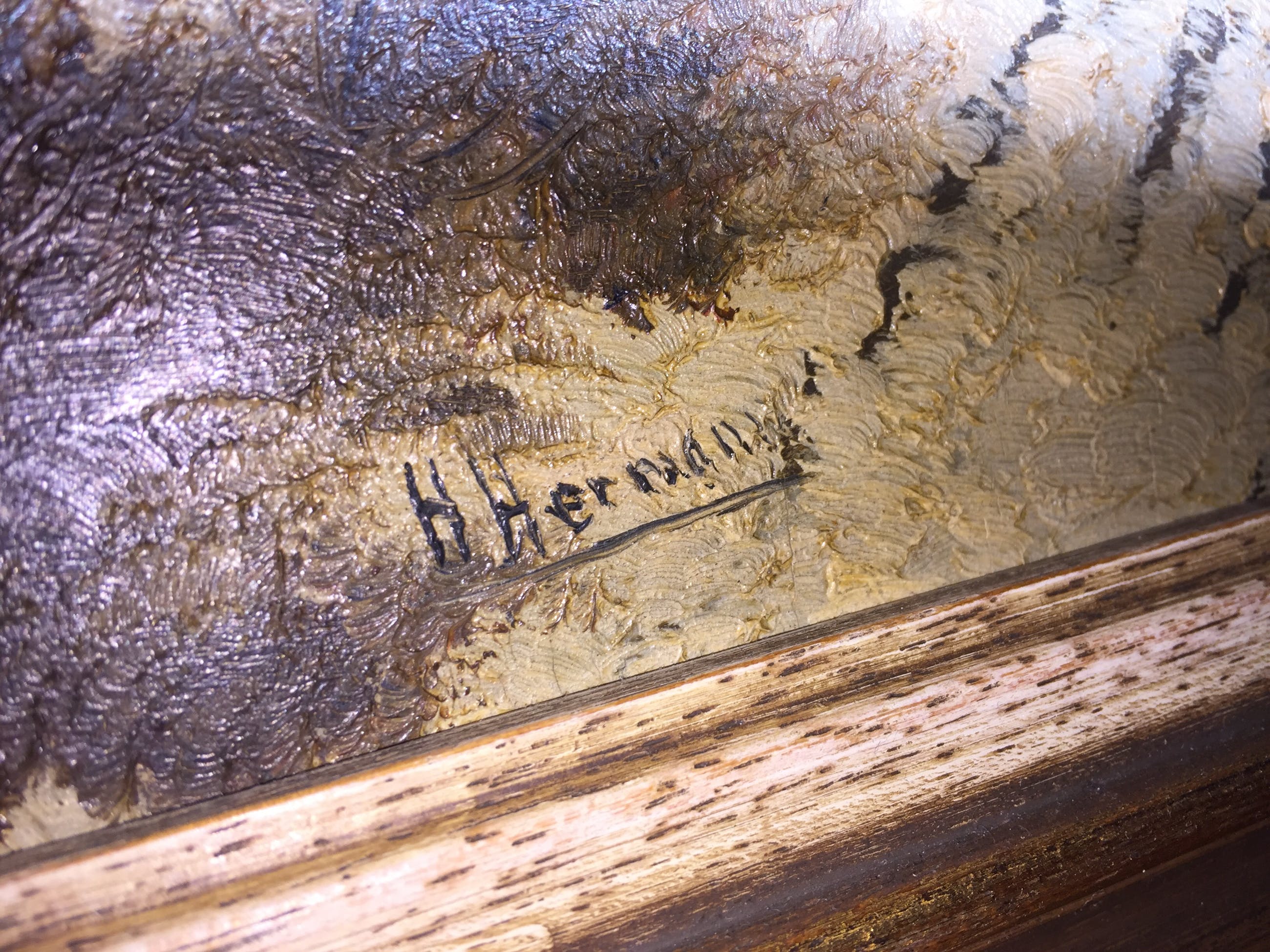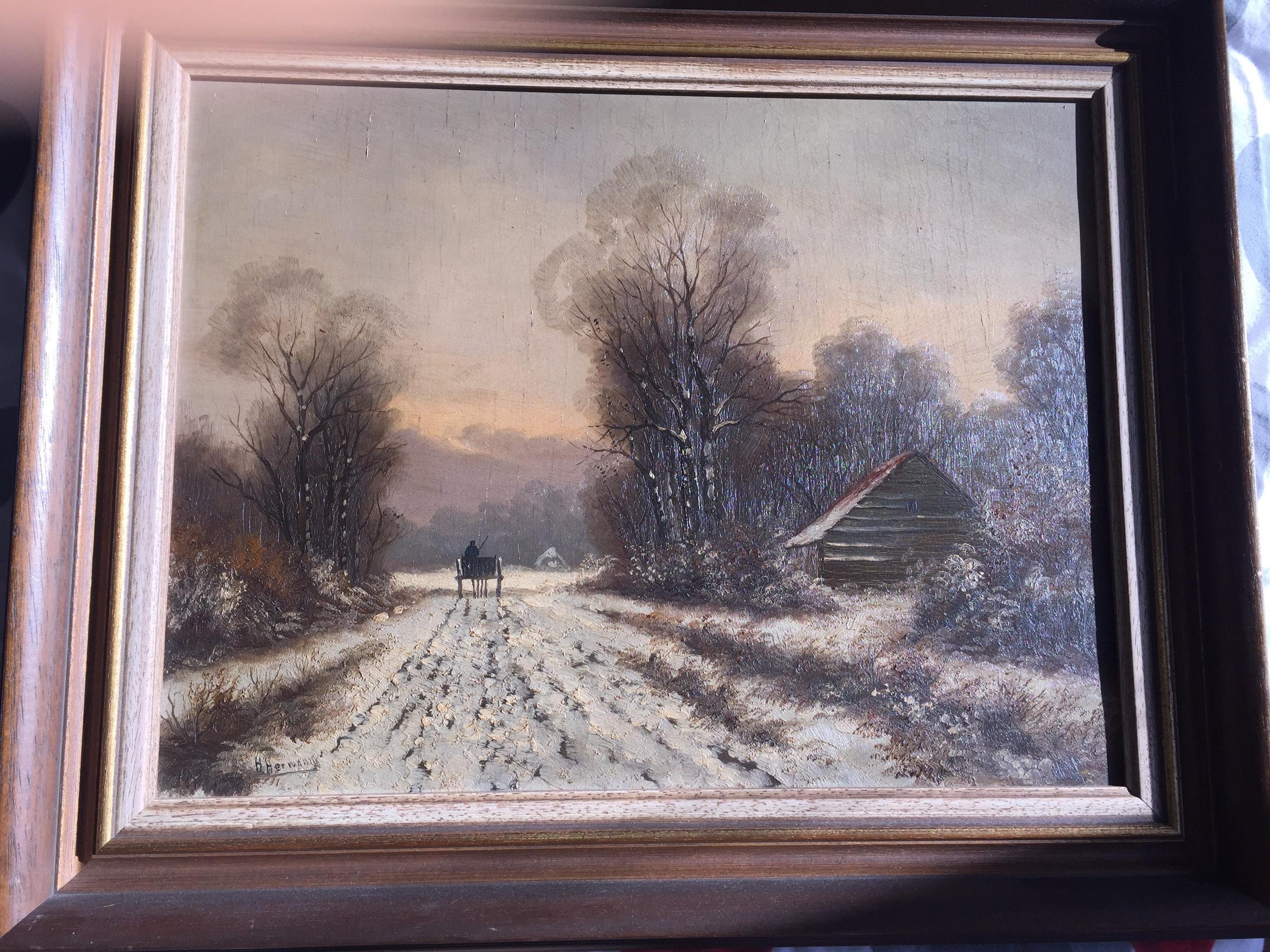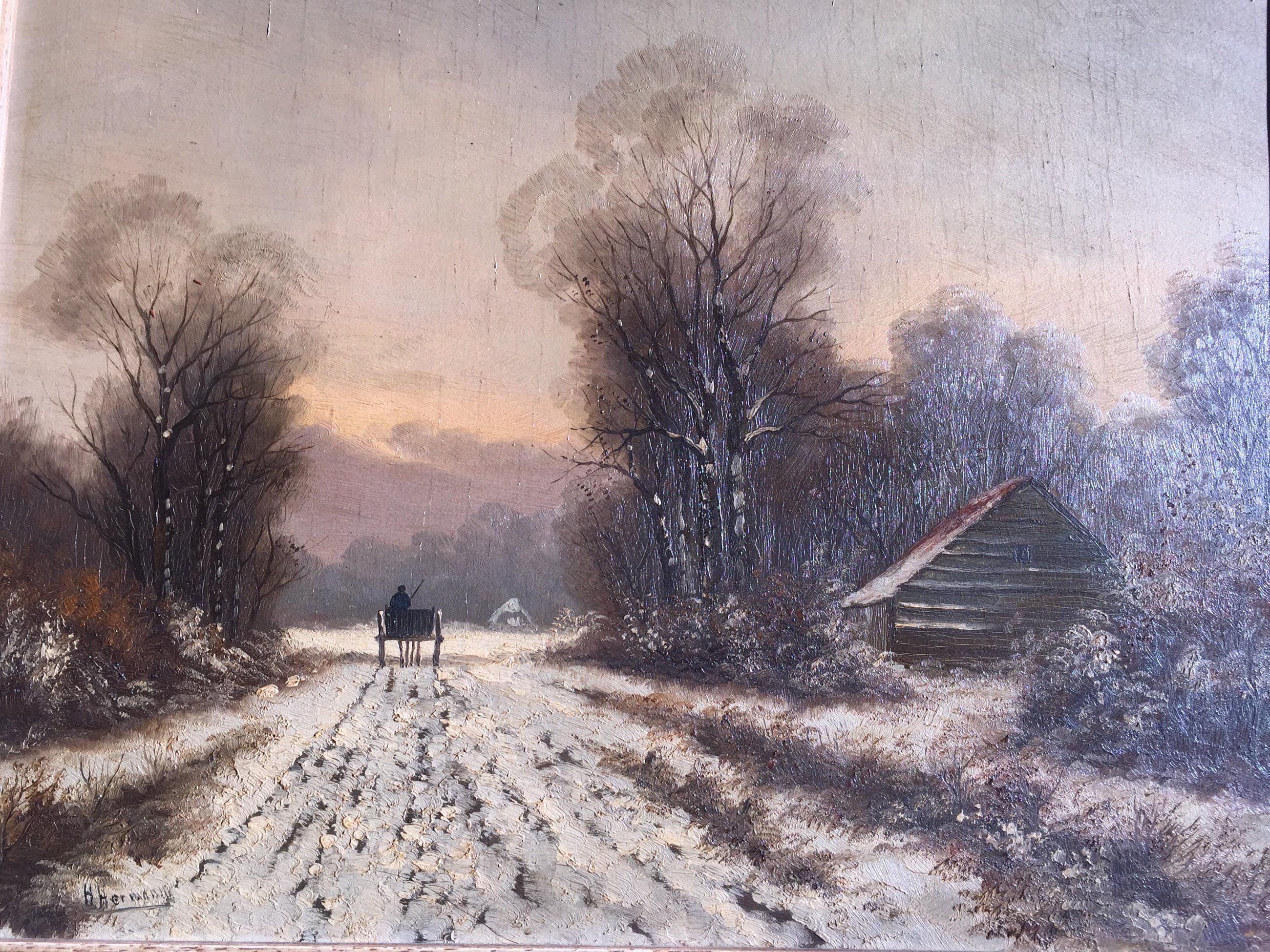 Prachtig oliefverf schilderij op houten paneel, gemaakt rond, eind 19 de eeuw in de trant van de Haagse School, voorstelling sneeuw en zon ondergangslandschap met bomen, koets en koetsier. Gesigneerd linksonder door H. Hermans, in de docuementatie van de RKD staat dat H. Hermans Eindhovense kunstenaar was en navolger van L. Apol. | |||