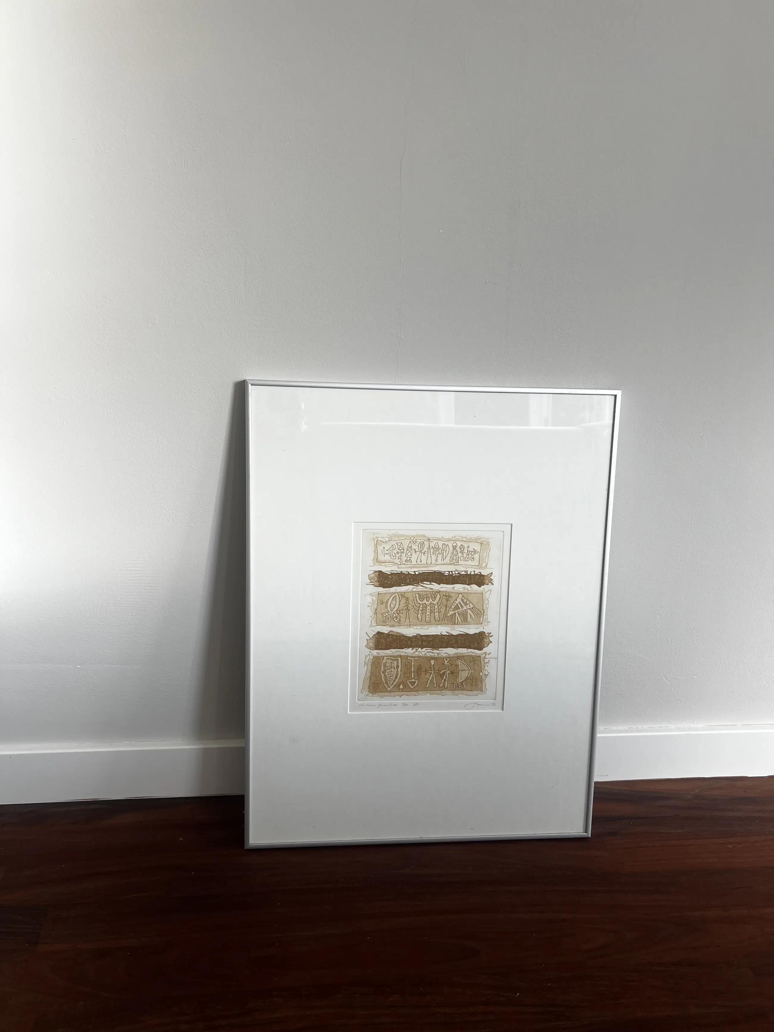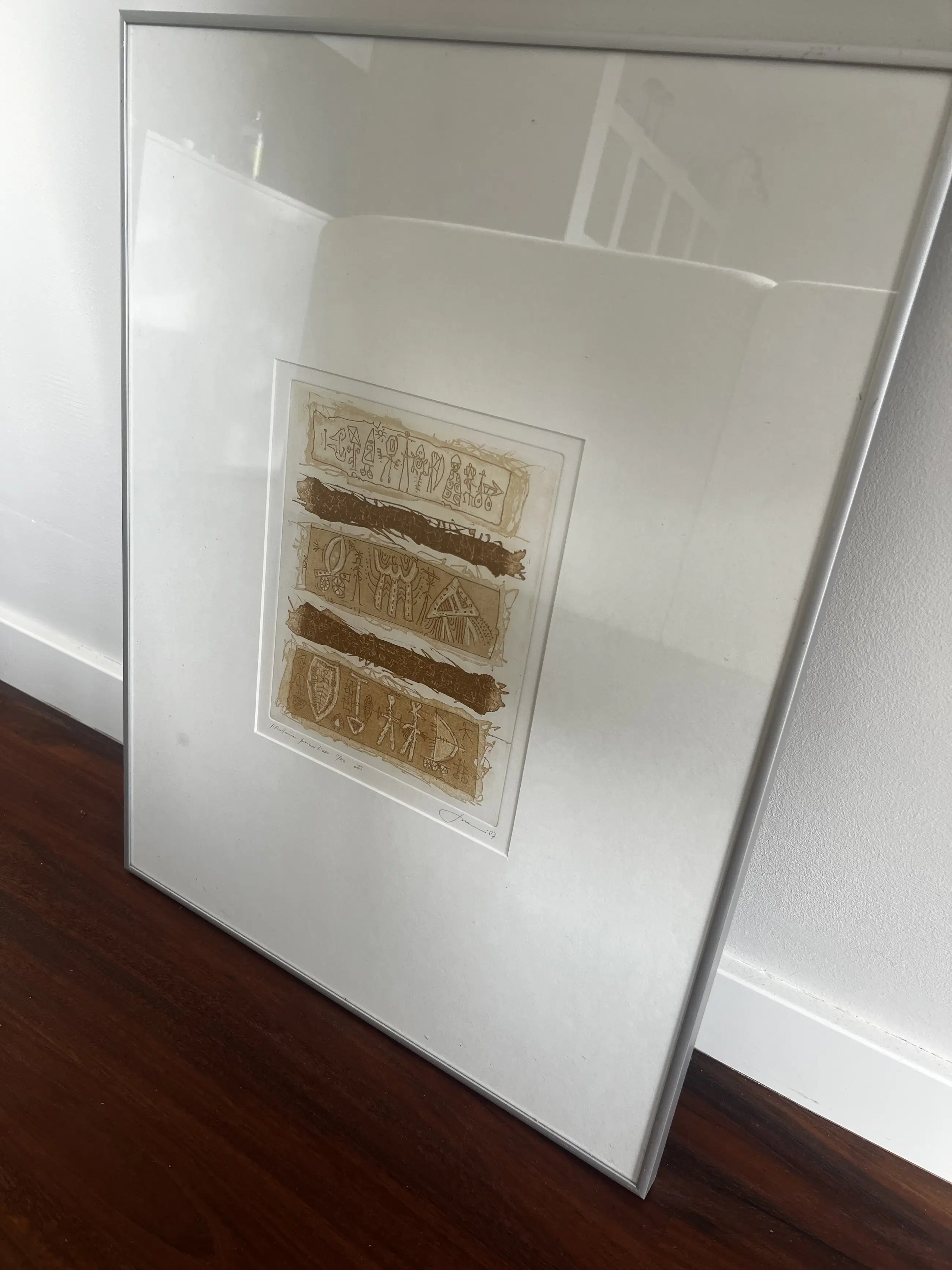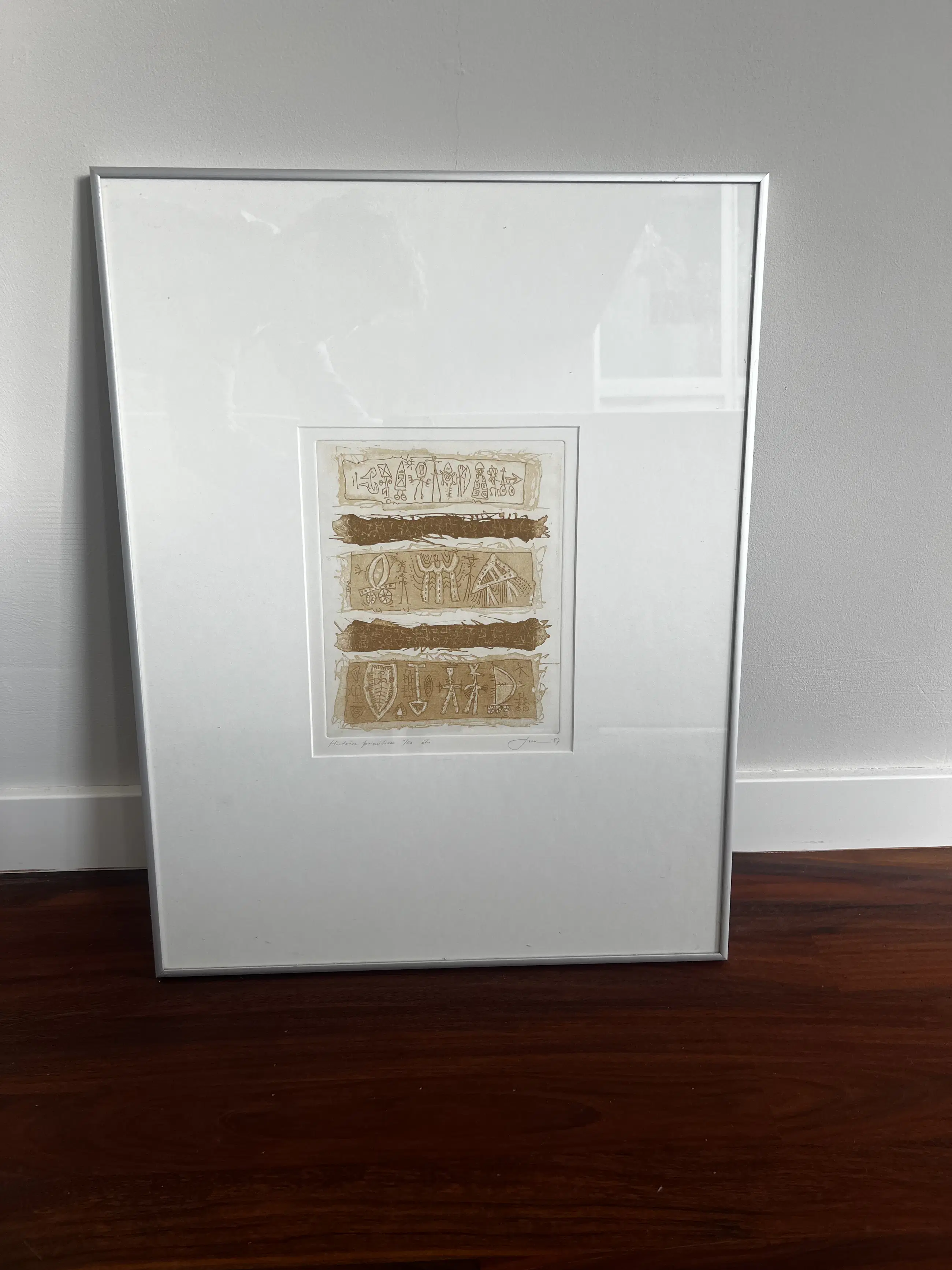 Originele prent van J. van den Berg, getiteld "Histoire primitives". Het betreft een gelimiteerde oplage, genummerd 1/20. De prent is rechtsonder gesigneerd met "J. van den Berg" en gedateerd '07'. De afbeelding bestaat uit drie horizontale panelen met gestileerde figuren en symbolen, gescheiden door donkerbruine, getextureerde balken. De stijl doet denken aan oude grotschilderingen of petrogliefen. Ingelijst. 50x65.
