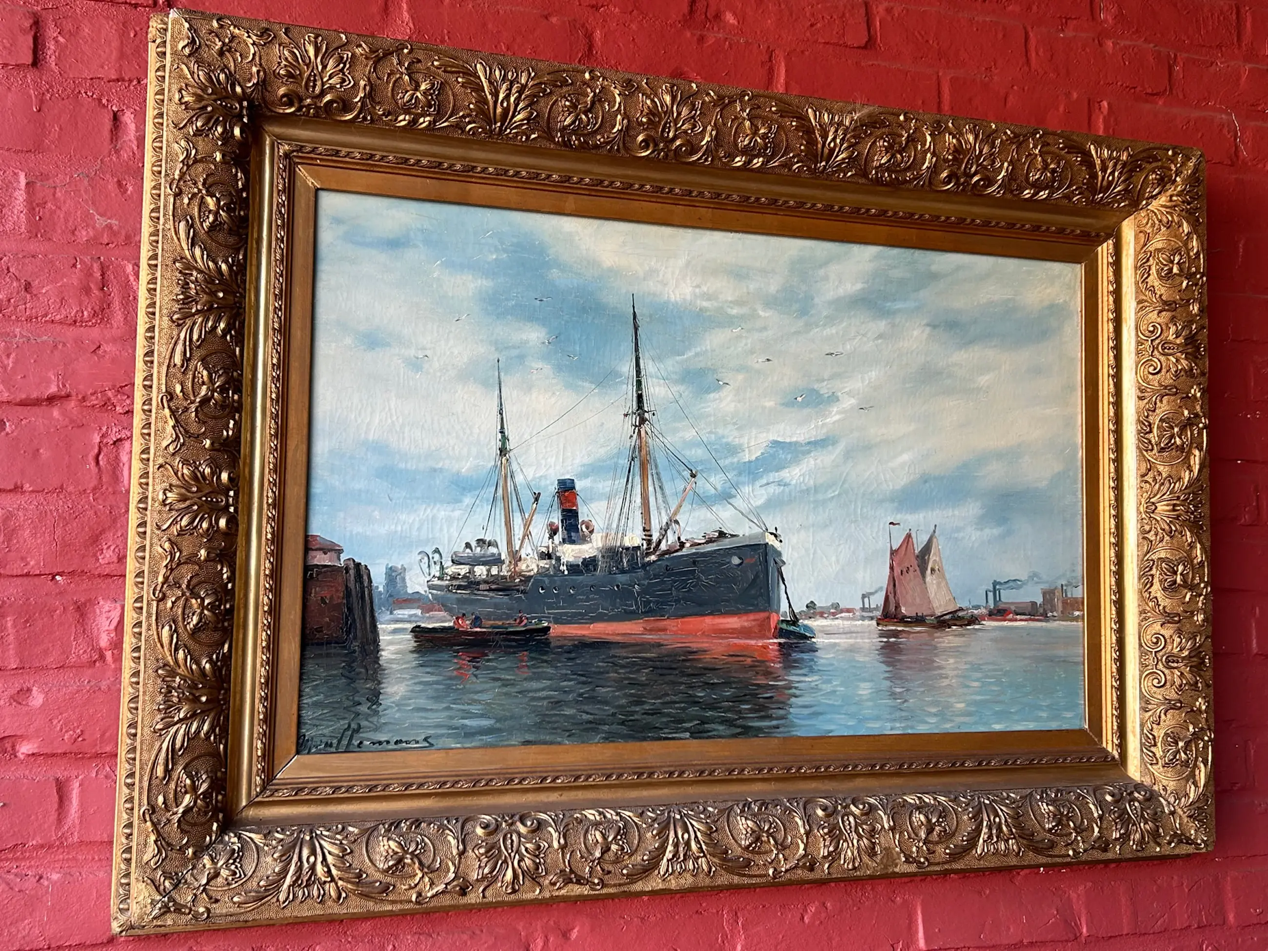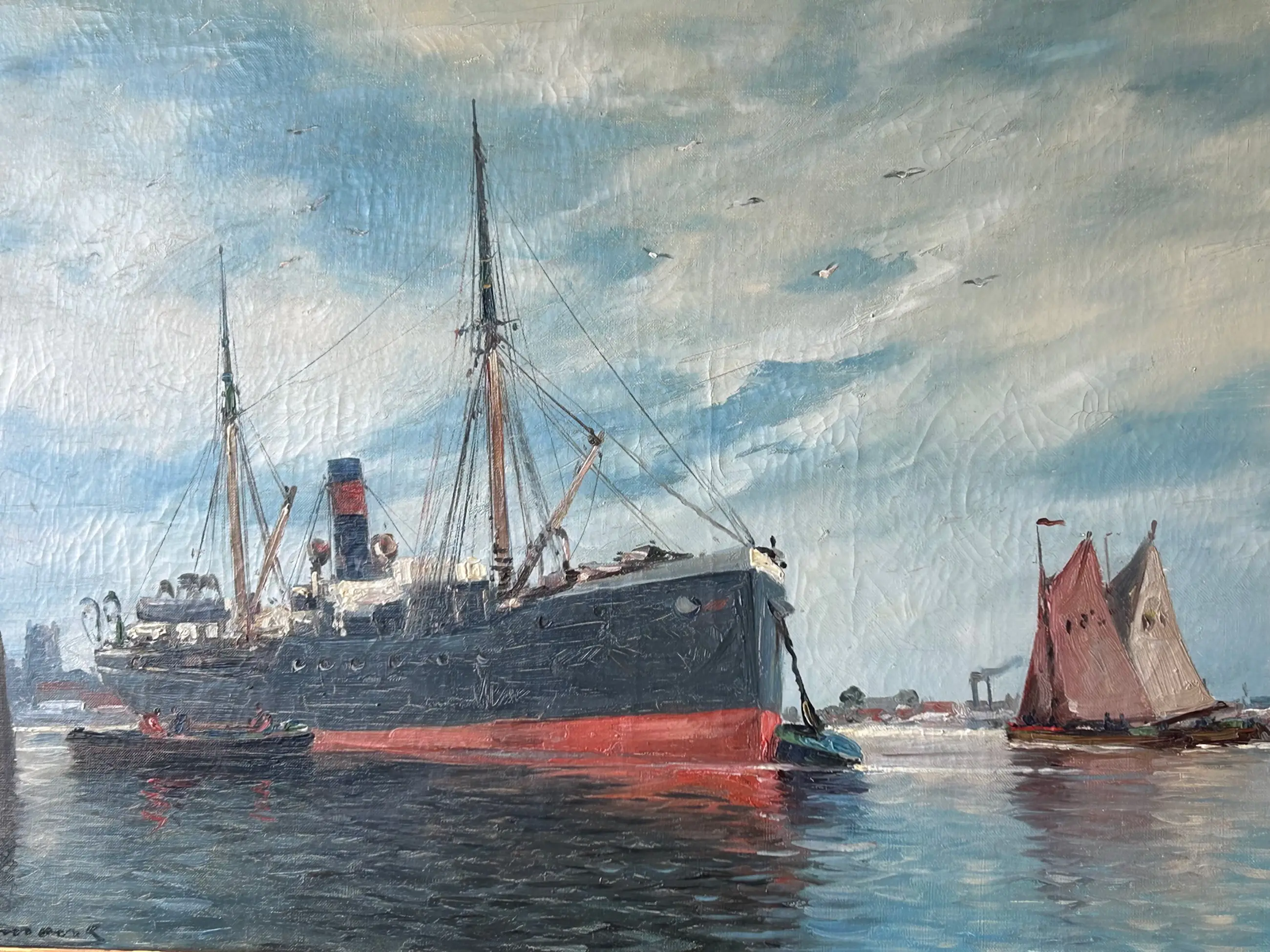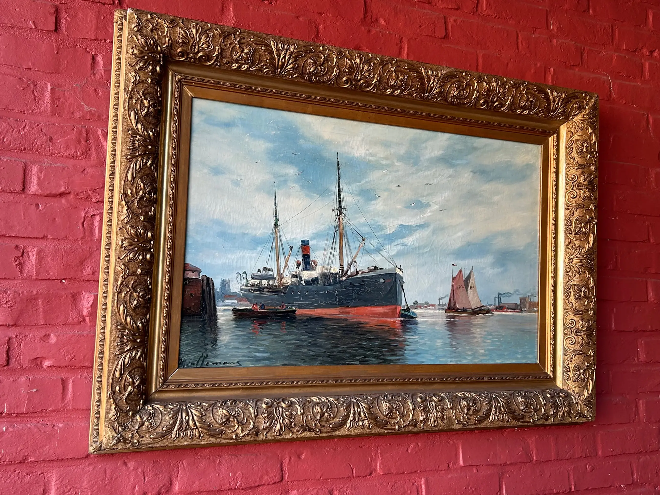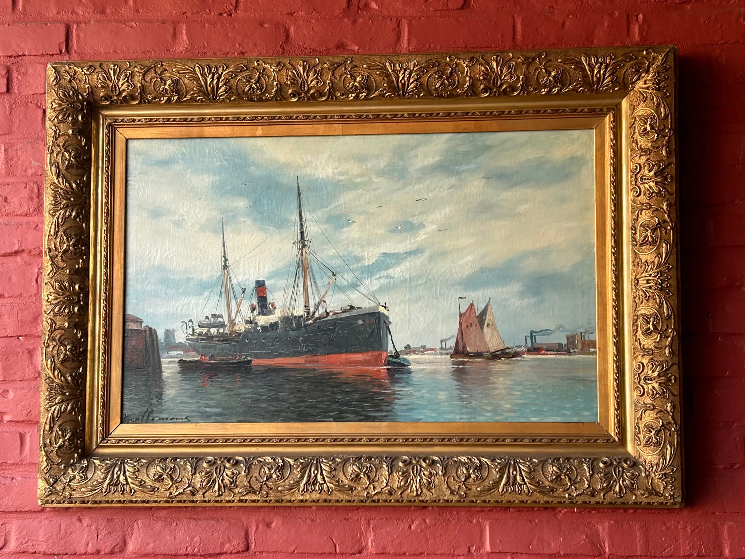Prachtig werk met eigentijdse kader. Circa 1900-1910 Komt uit de tijd van de industriële revolutie waar stoomboten een belangrijke rol speelden als transportmiddel. Op de achtergrond zien we fabrieken met rokende schouwen. Prachtige kleuren en sfeer. Zie foto's, ze zijn deel van de beschrijving en toestand. Handgesigneerd.