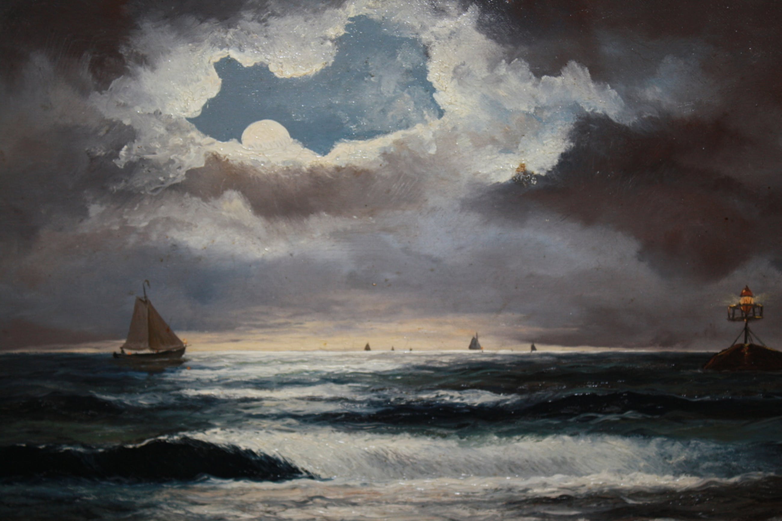 ZEEGEZICHT BIJ MAANLICHT MET GEZICHT OP VUURBOEI
