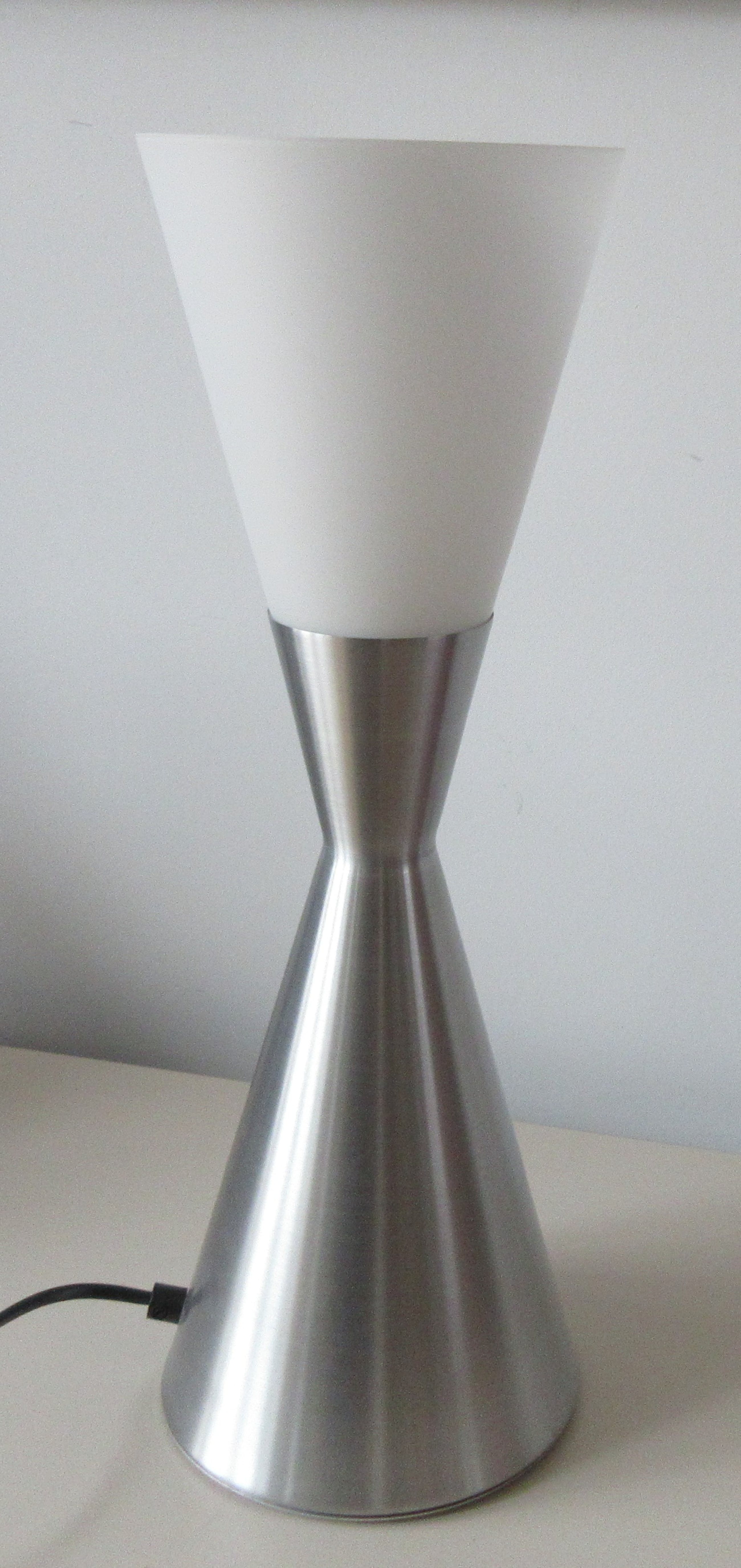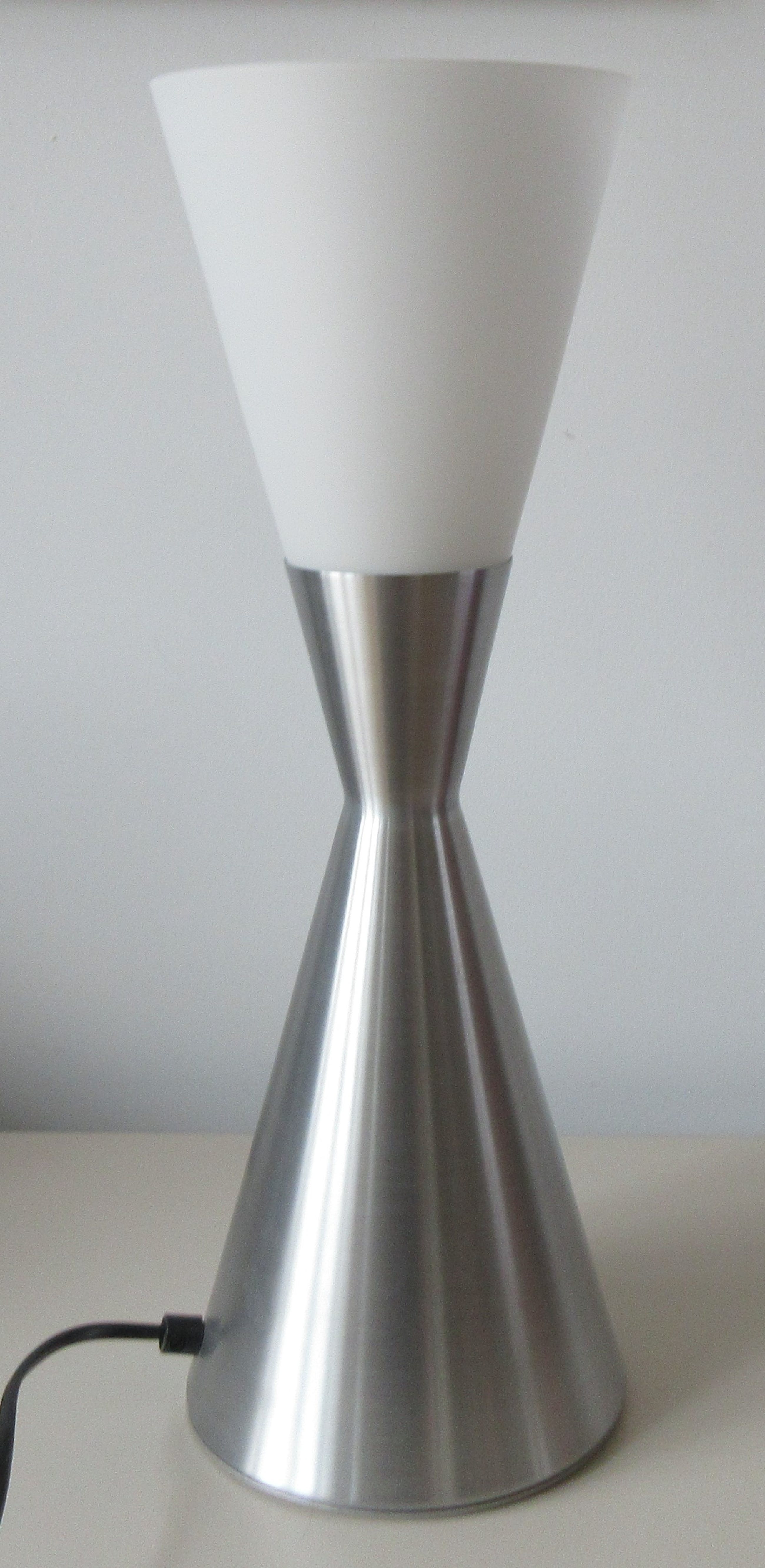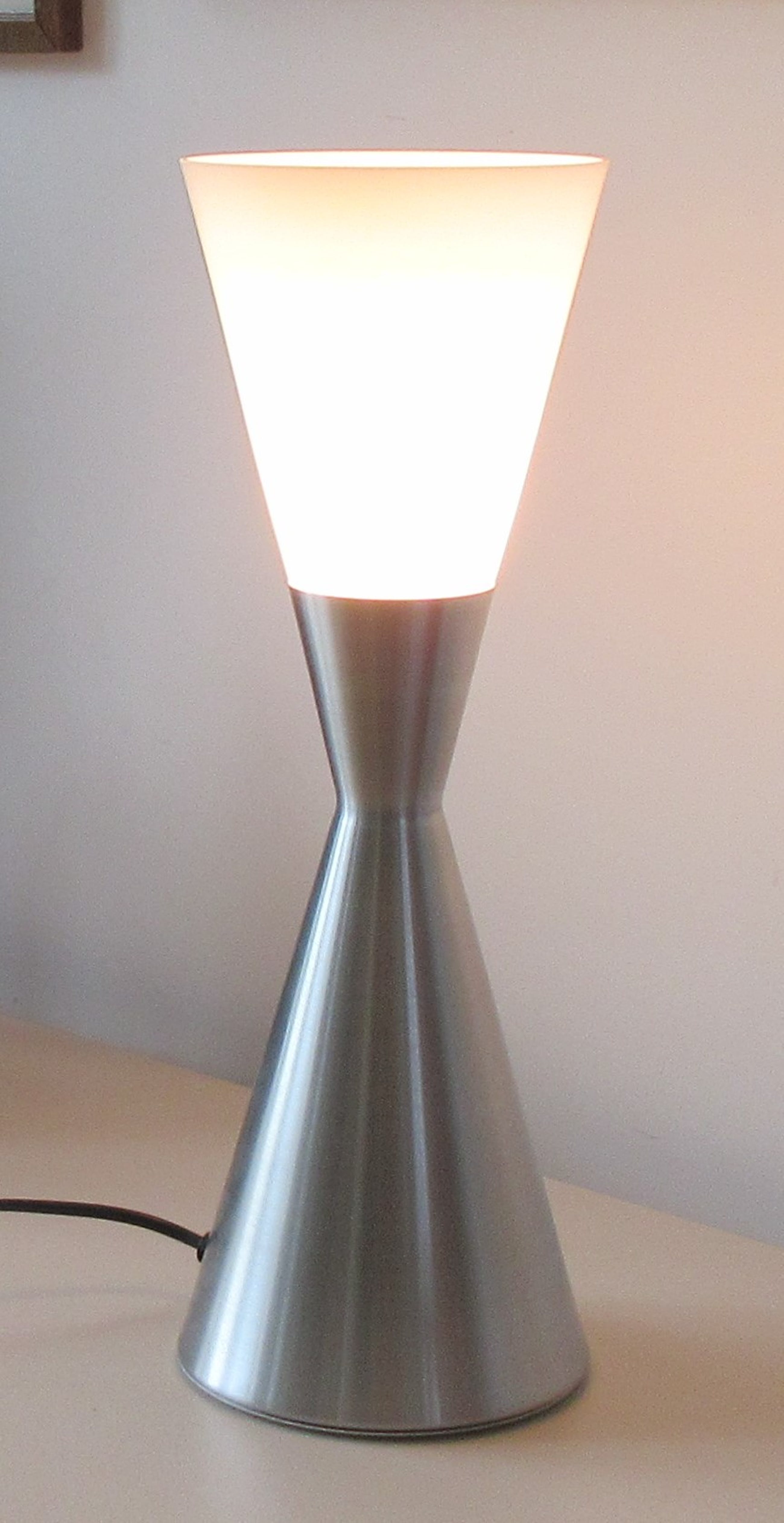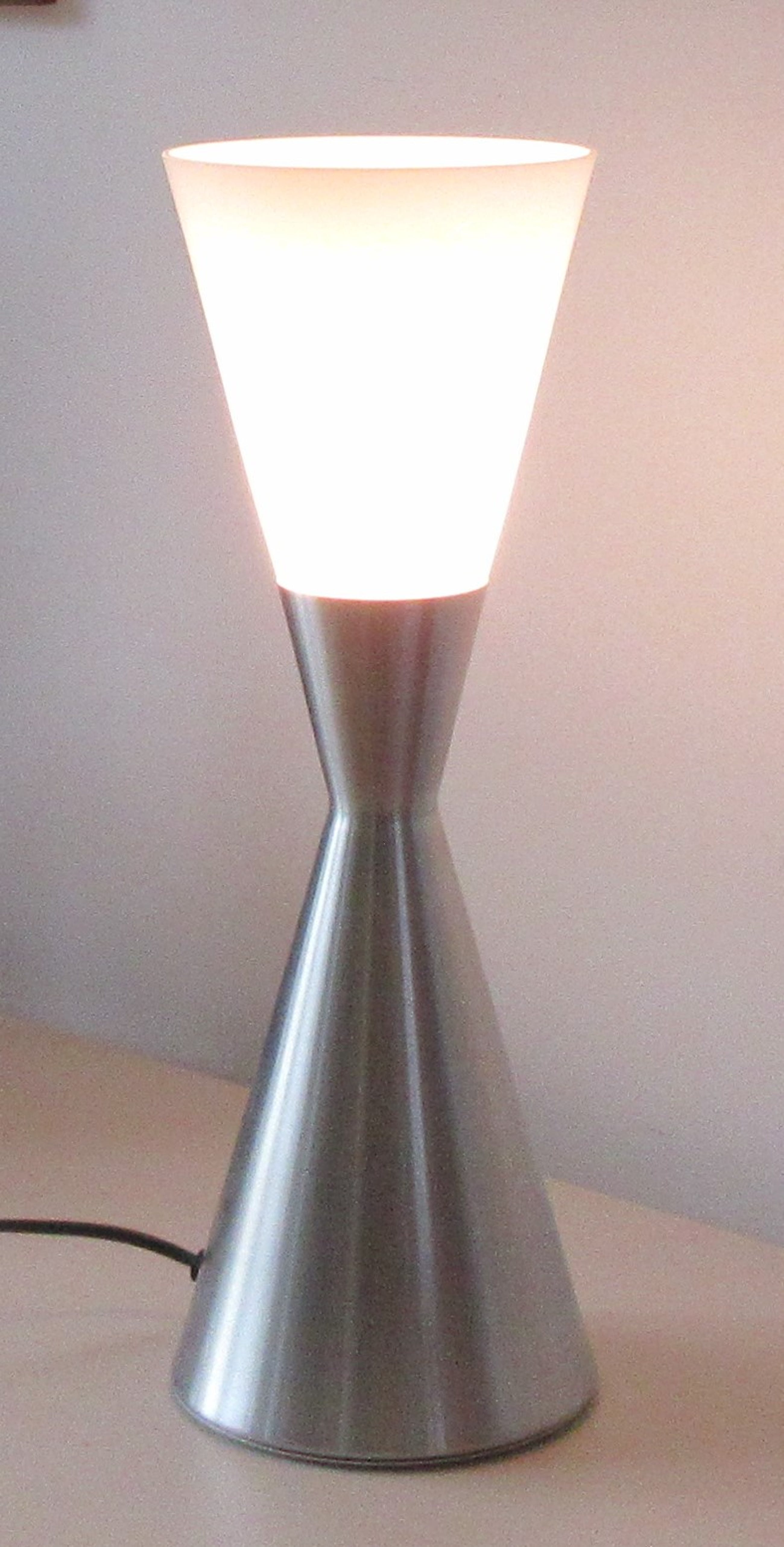 Tafellamp Diabolo van geborsteld staal en satijnen glazen kap, uitgevoerd bij Hala Zeist.