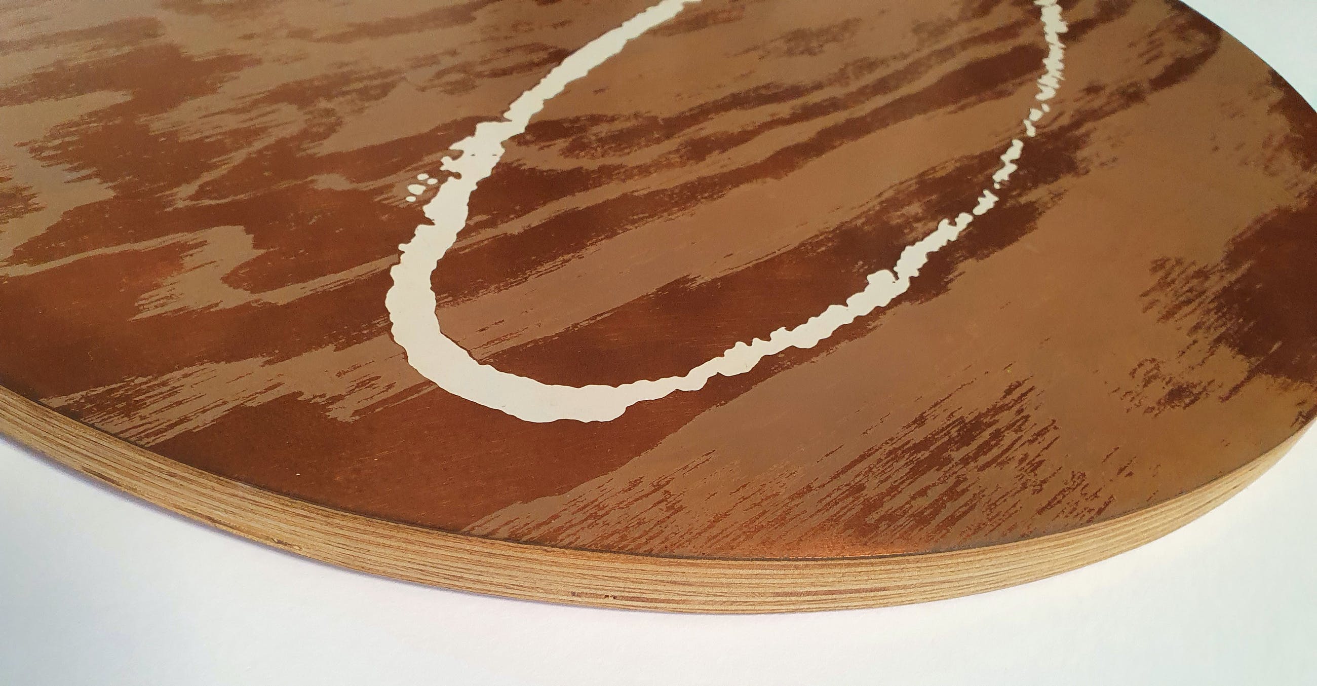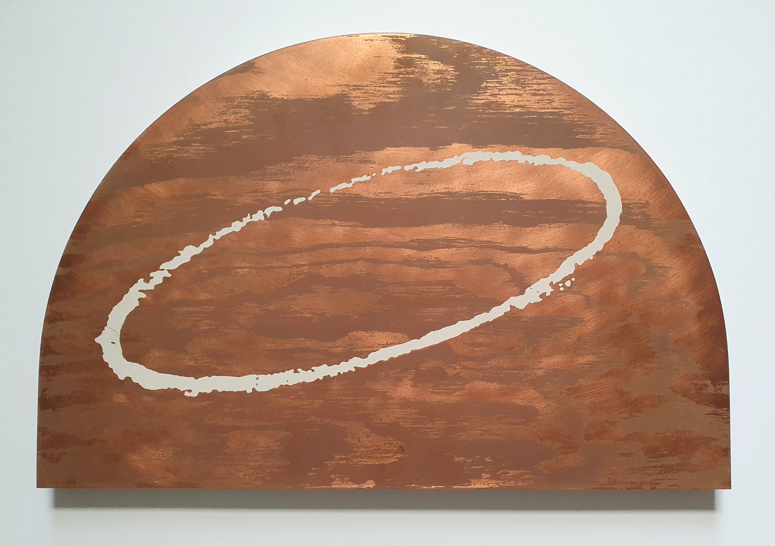 Mooi werk van Han Hoogerbrugge. Muurobject: Zeefdruk op een koperen plaat op een houten bord.