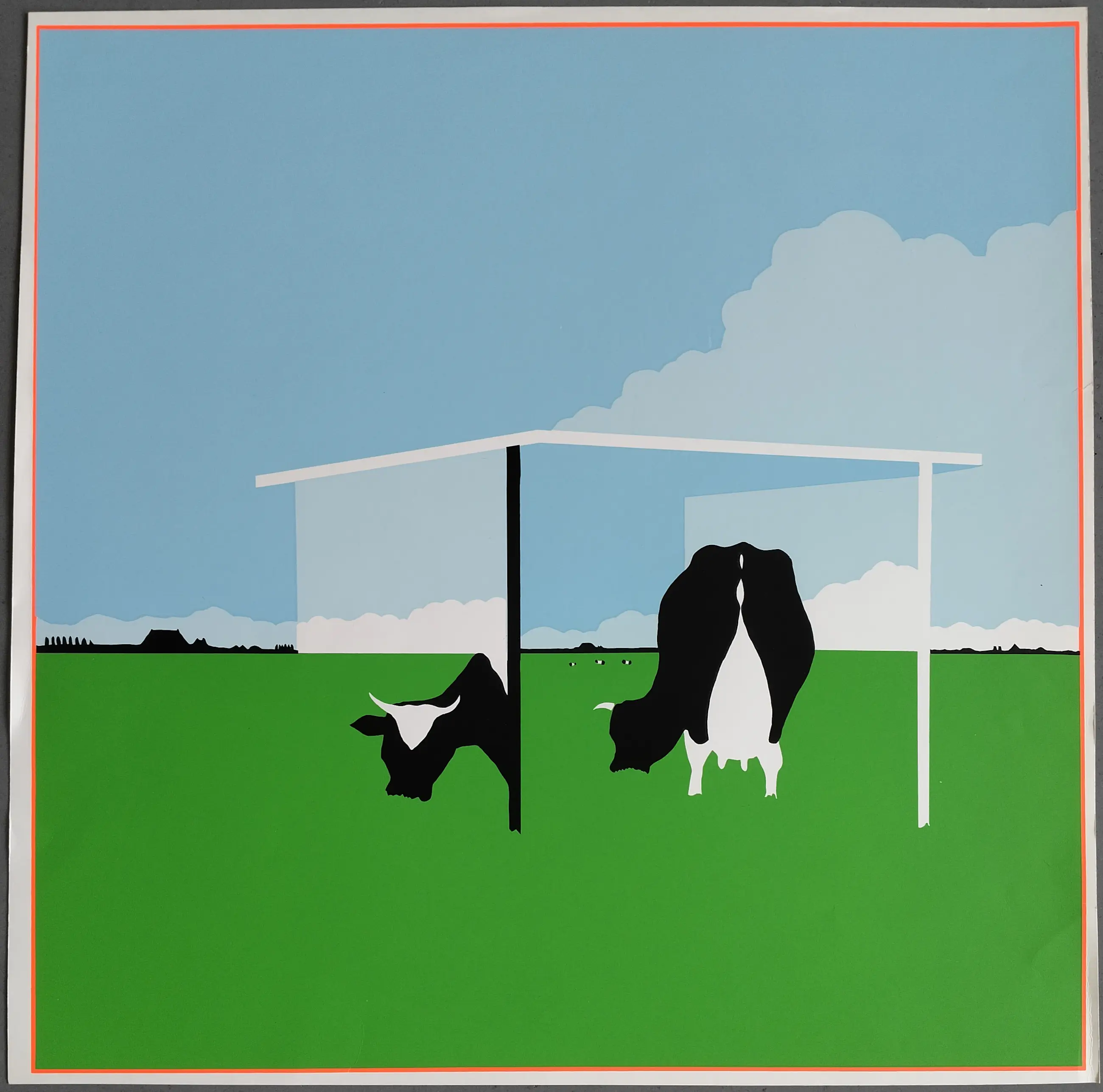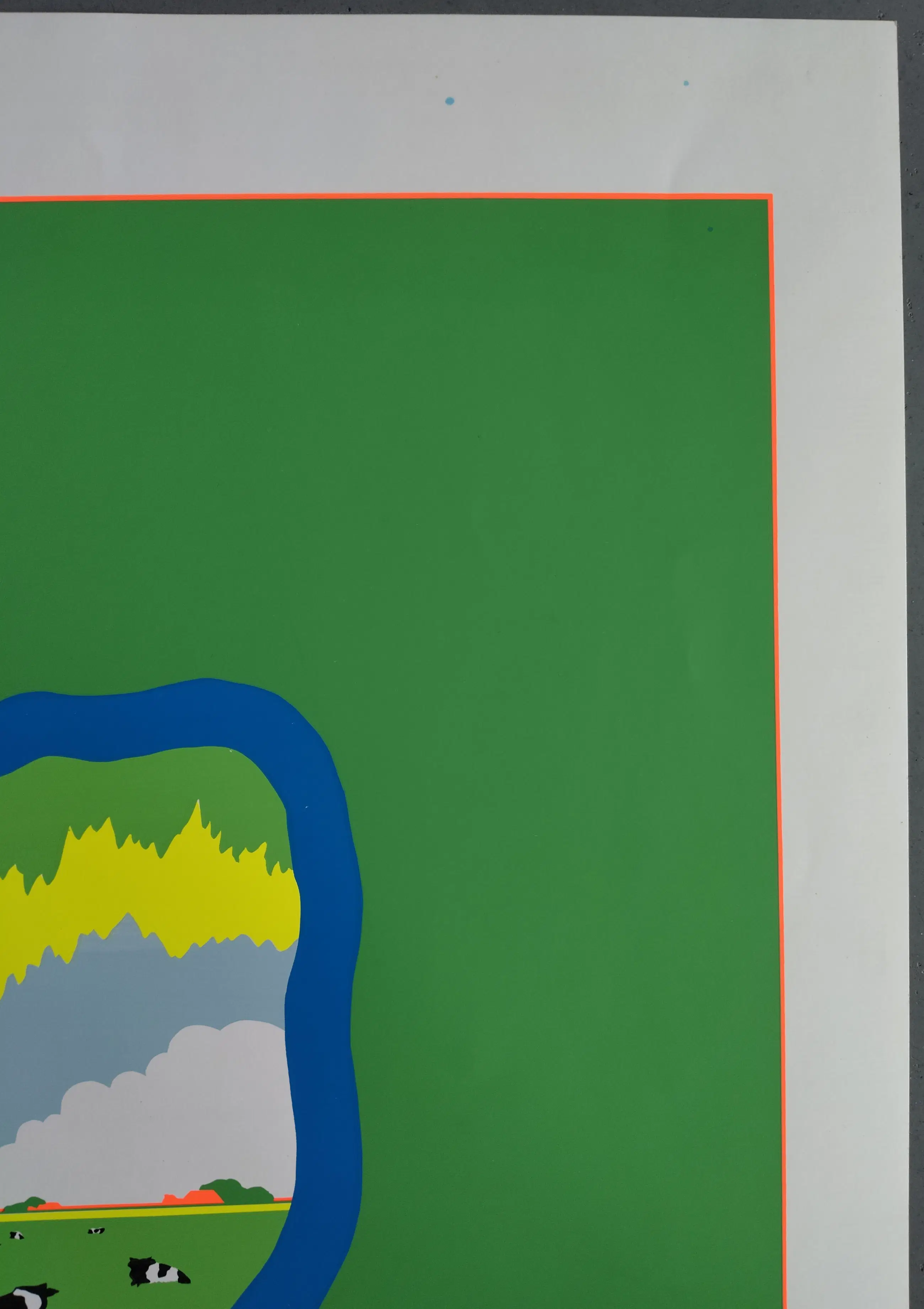 De kleinste zeefdruk heeft langs de randen een aantal vouwtjes. De grootste zeefdruk is met name in de onderste linkerhoek vuil en langs de rand licht vergeeld. In de linker bovenhoek zijn verfstipjes van de druk te zijn. Op een aantal plaatsen is op beide zeefdrukken een kreukje/vouwtje zichtbaar. Verder zijn de zeefdrukken in goede staat. | |||||||||||