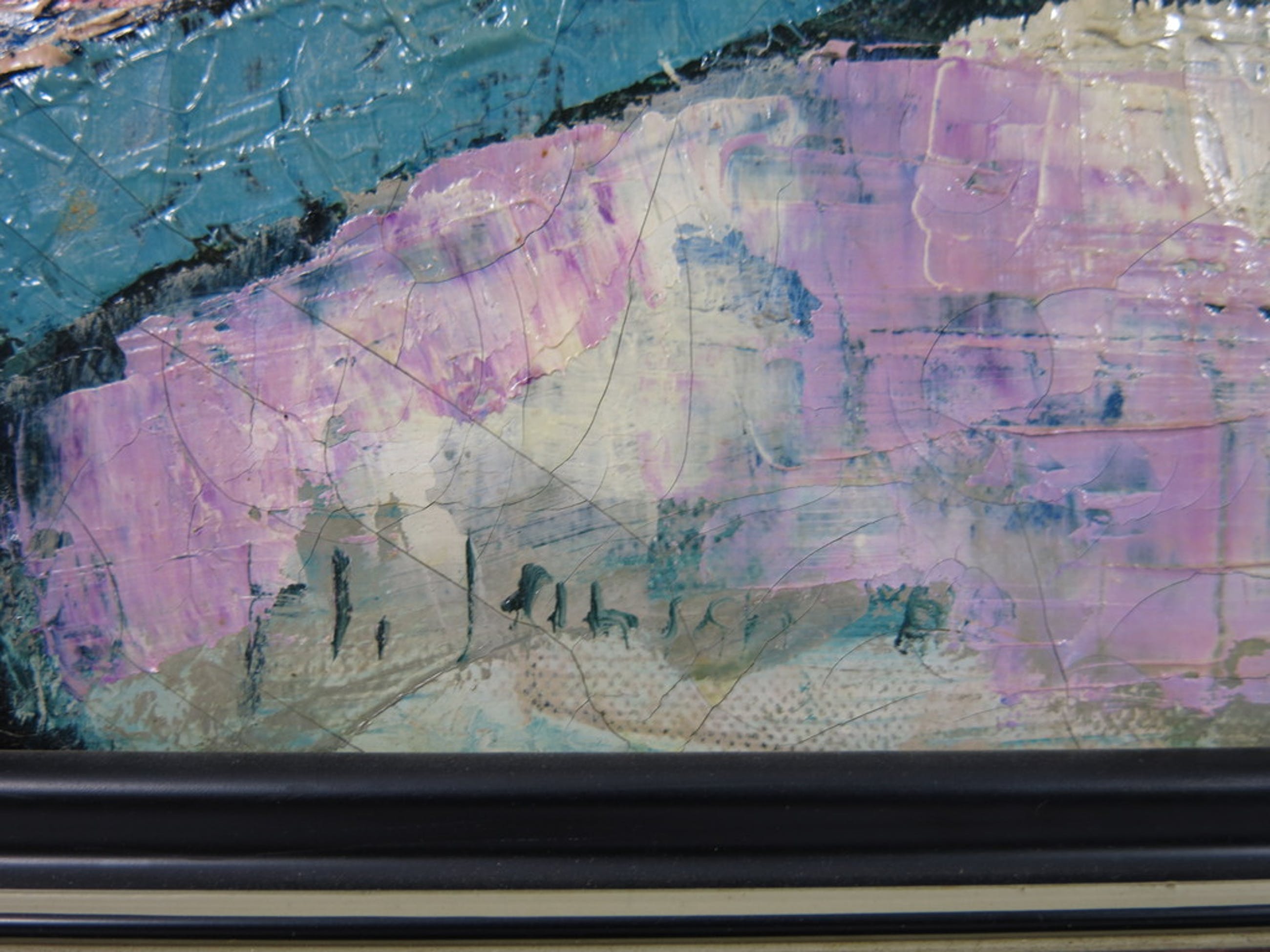 In goede staat, maar het werk heeft een beetje een "dun" doek, met een paar hele kleine gaatjes (als je het tegen het licht houdt). Eventueel goed te restaureren. Op verso is een stukje versteviging aangebracht in de bovenhoek. Als het doek ophangt allemaal gewoon onzichtbaar, maar dient wel vermeld te worden.