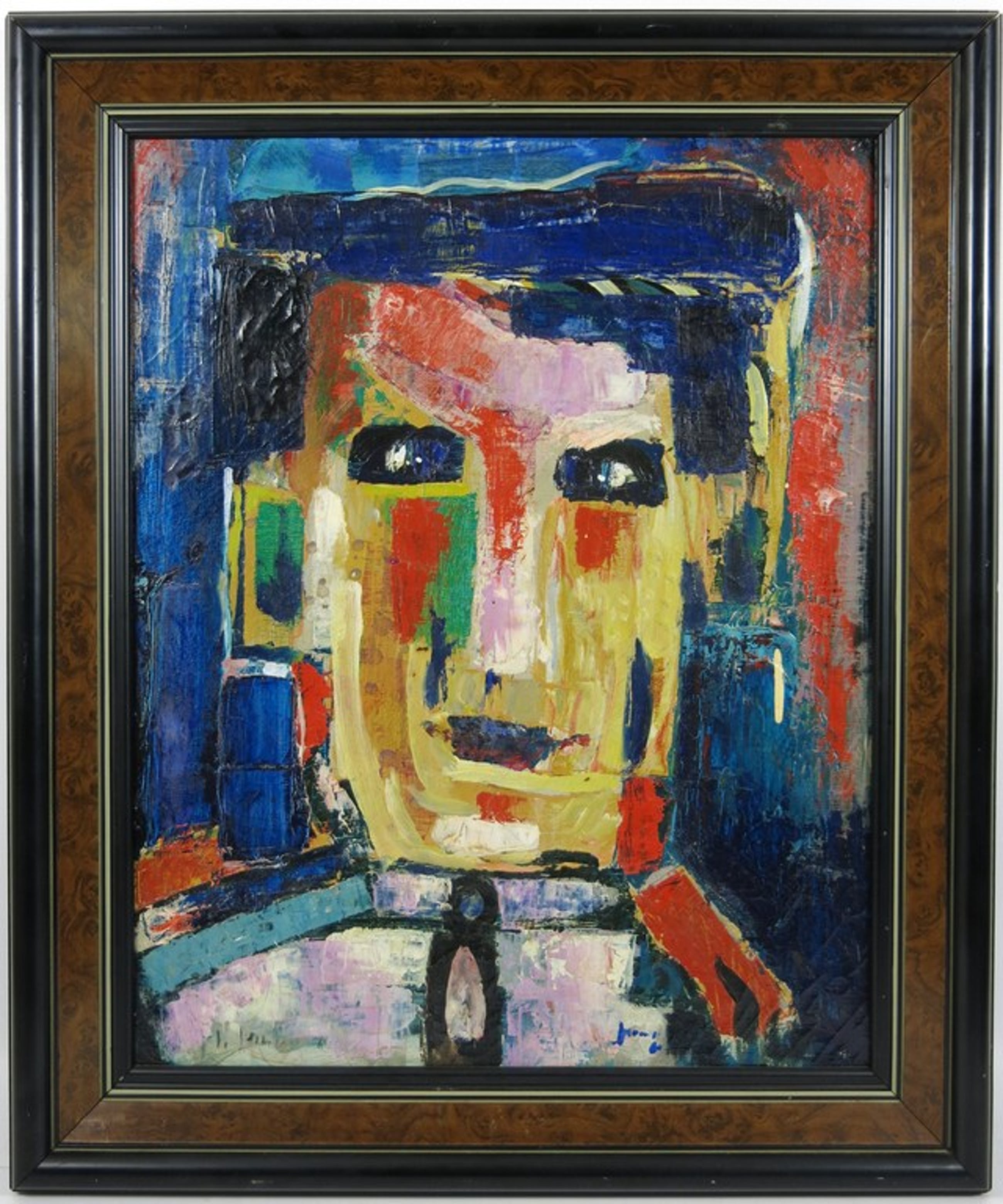 Prachtig zelfportret (?) van de Groningse kunstenaar Han Jansen, waarin het krachtig expressionistische kleurgebruik de stijl volgt van kunstenaarsgroep De Ploeg.