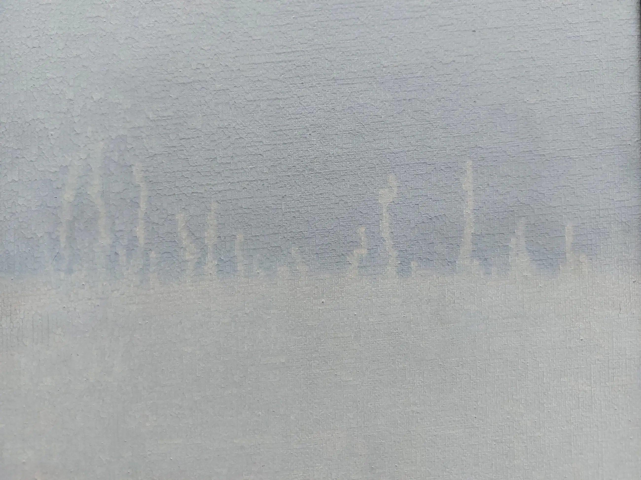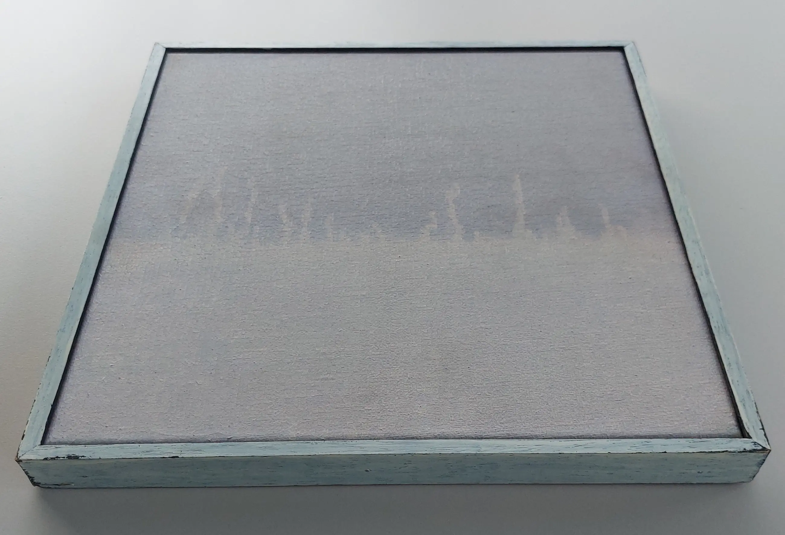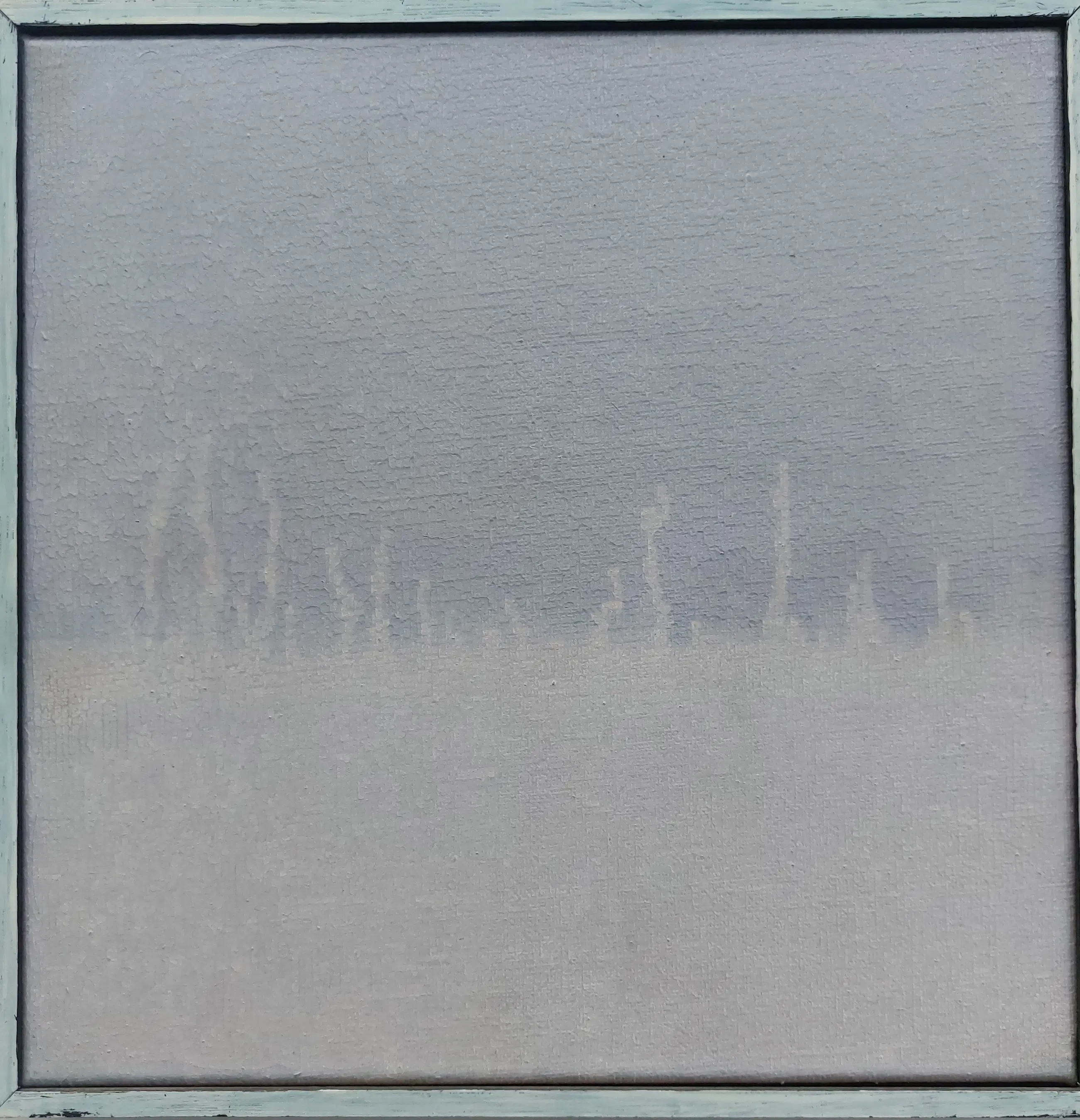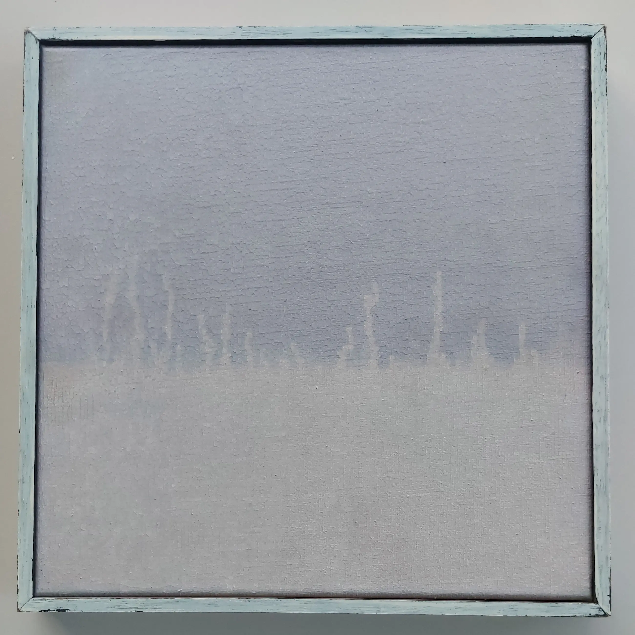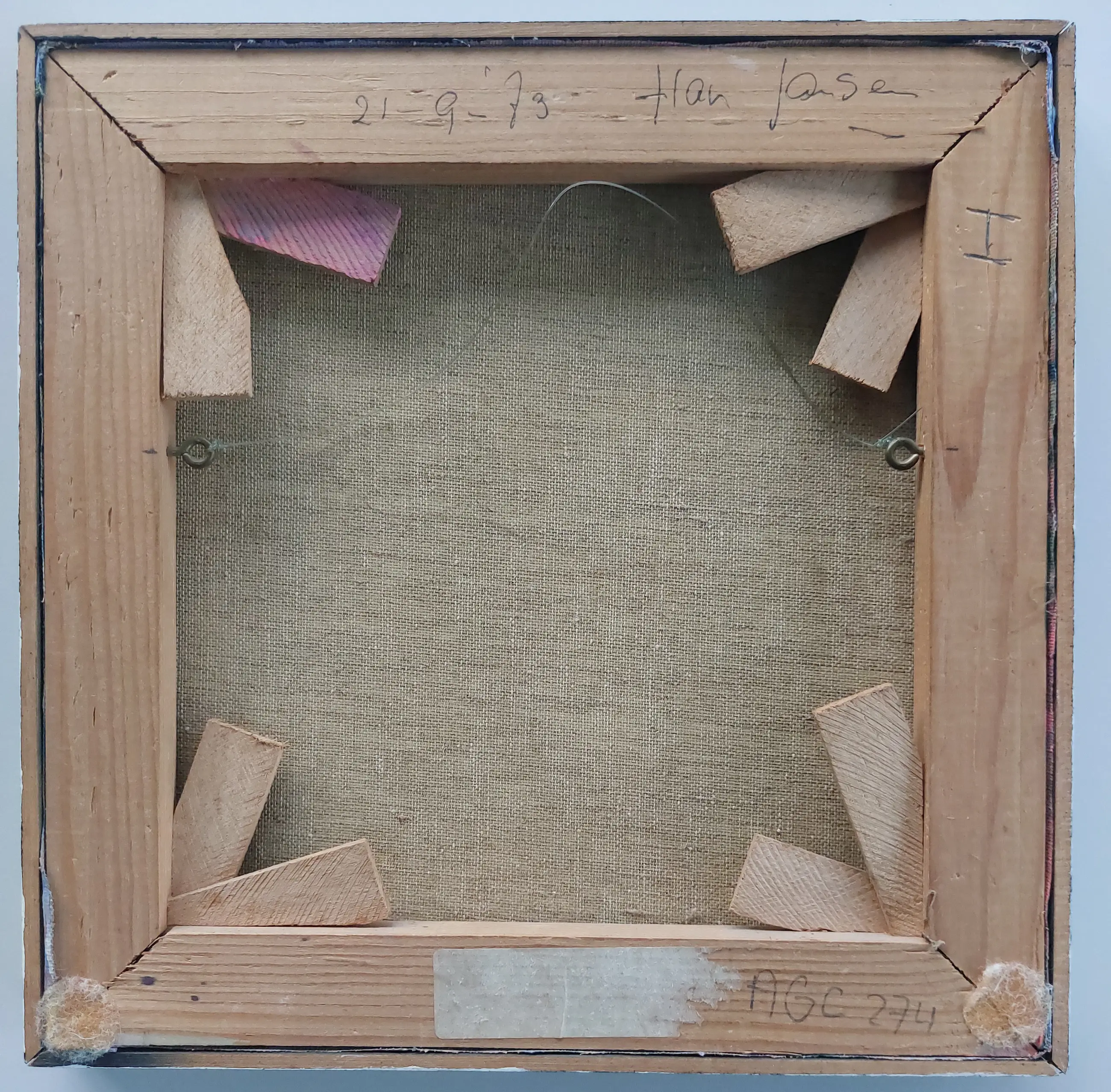 Olieverf op doek uit 1973 van de kunstenaar Han Jansen (1931-1994) Op de achterzijde is het werk gesigneerd en gedateerd. Afmeting doek 25 x 25 cm. (h x b) Afmeting houten lijst 26.5 x 26,5 cm. (h x b) Langs de randen is er wat lichte craquelé zichtbaar, verder in zeer goede staat.