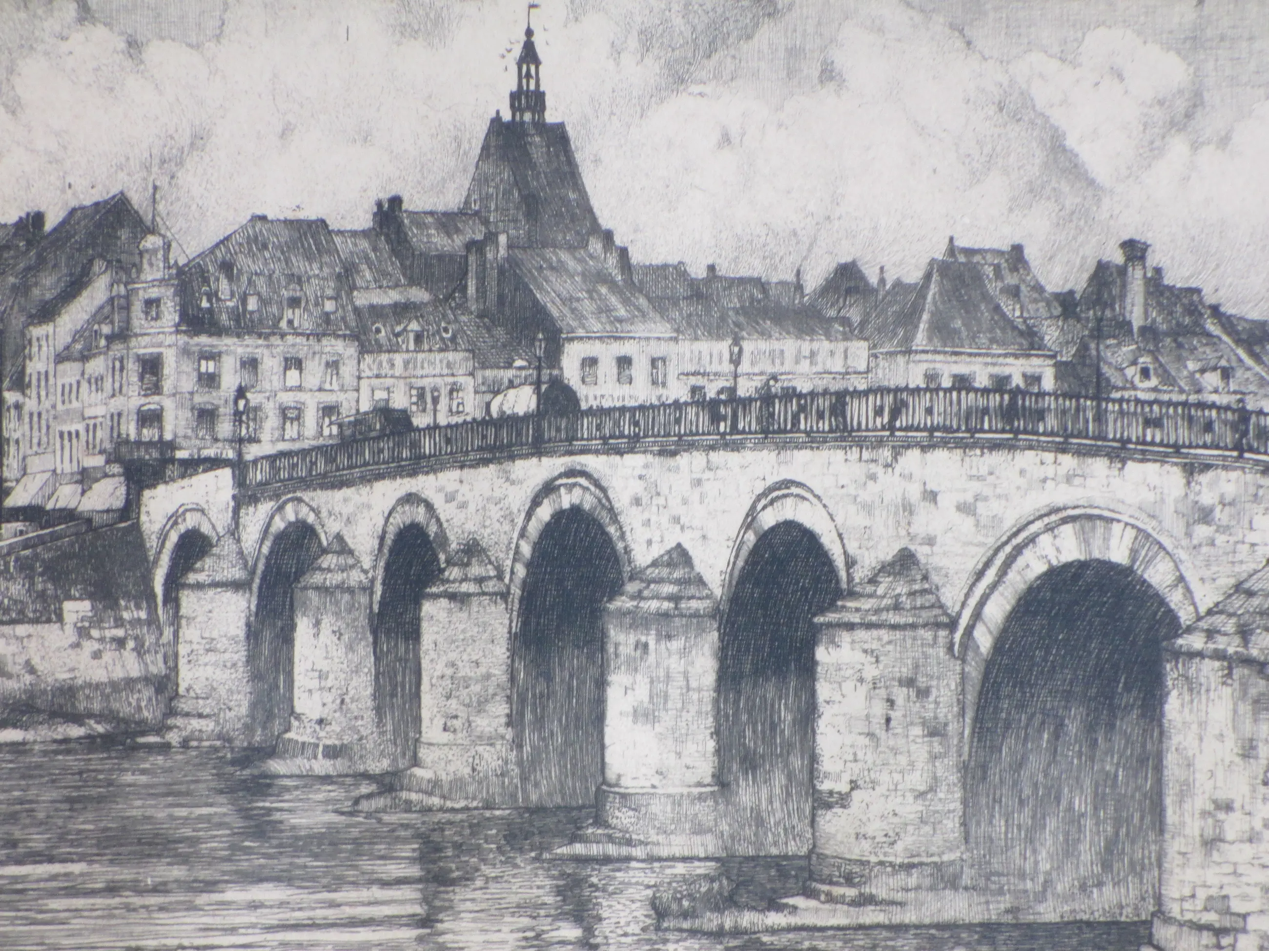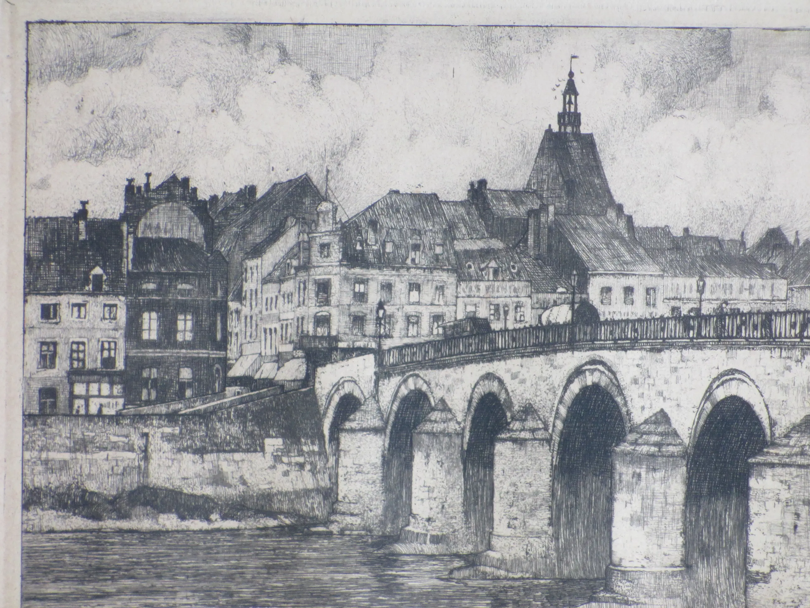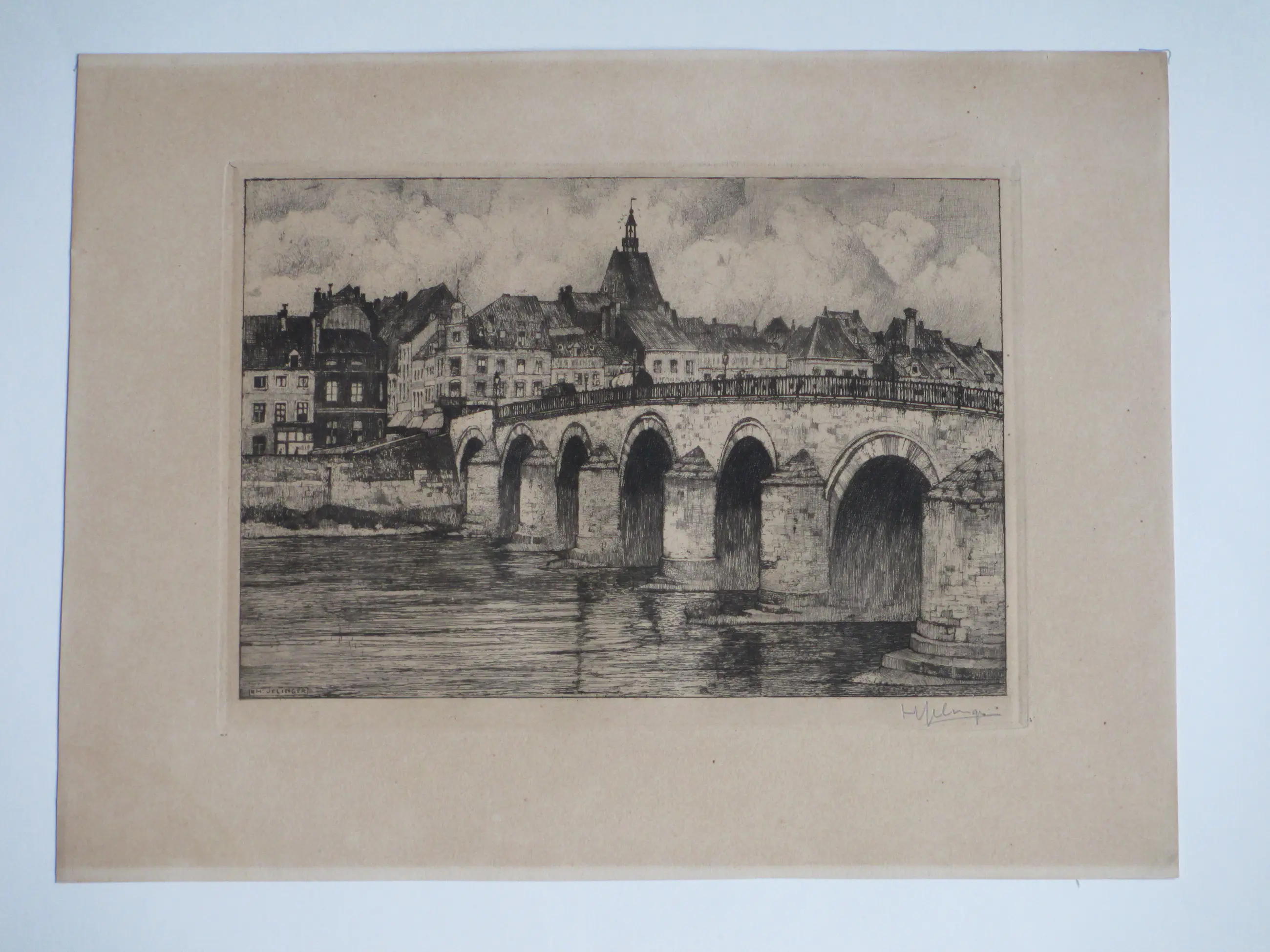 Ets door Han Jelinger Voorstelling van de Sint Servaasbrug in Maastricht Losbladig, beeldmaat 18.5x26, bladmaat 29x38 Gesigneerd in potlood r.o.: 'H Jelinger' Tevens gesigneerd in de druk l.o.: 'H. Jelinger'