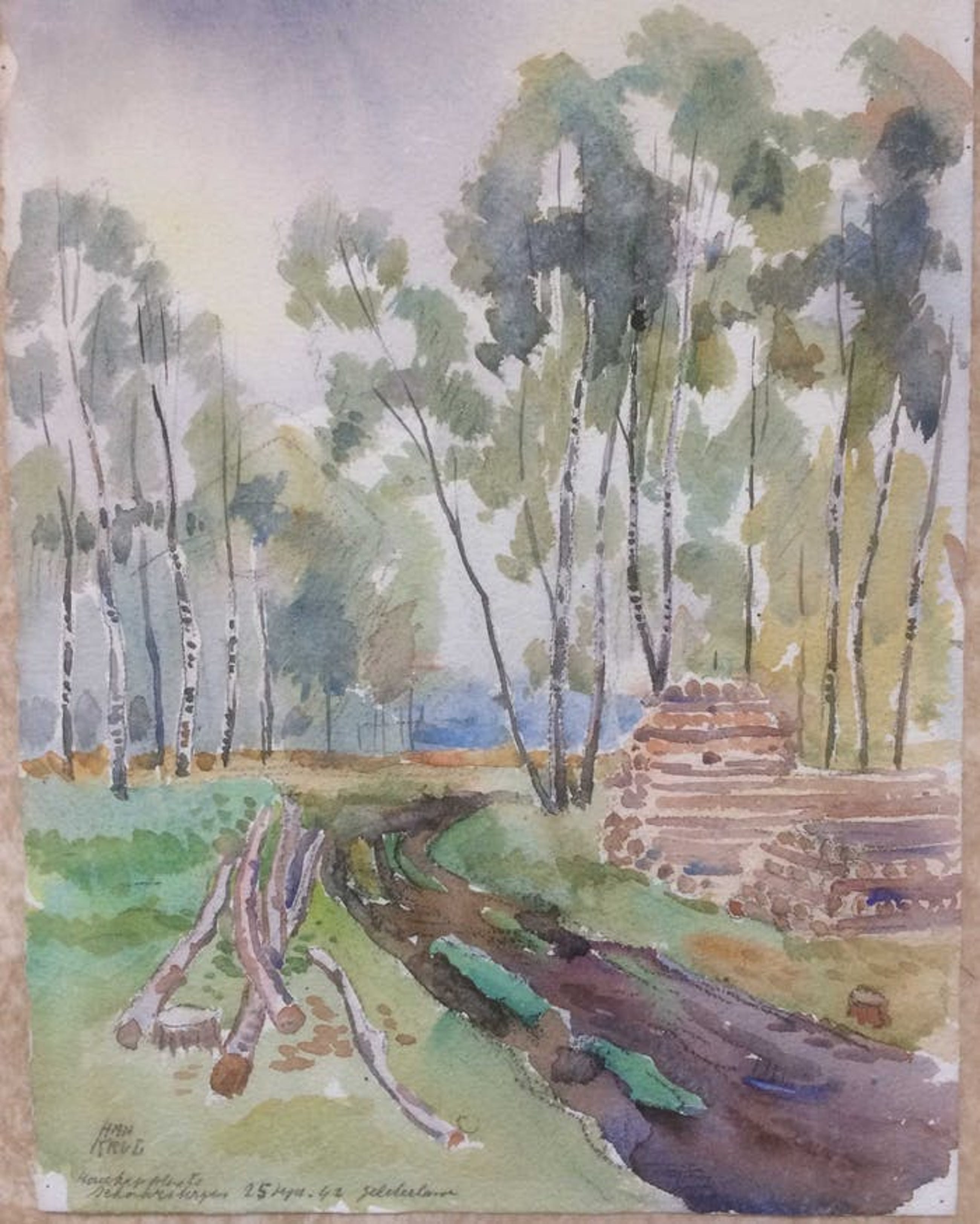 Titel: "Houtkapplaats Schaarsbergen" Jaartal: 25 september 1942 Gesigneerd: Ja linksonderonder in potlood Han krug en titel