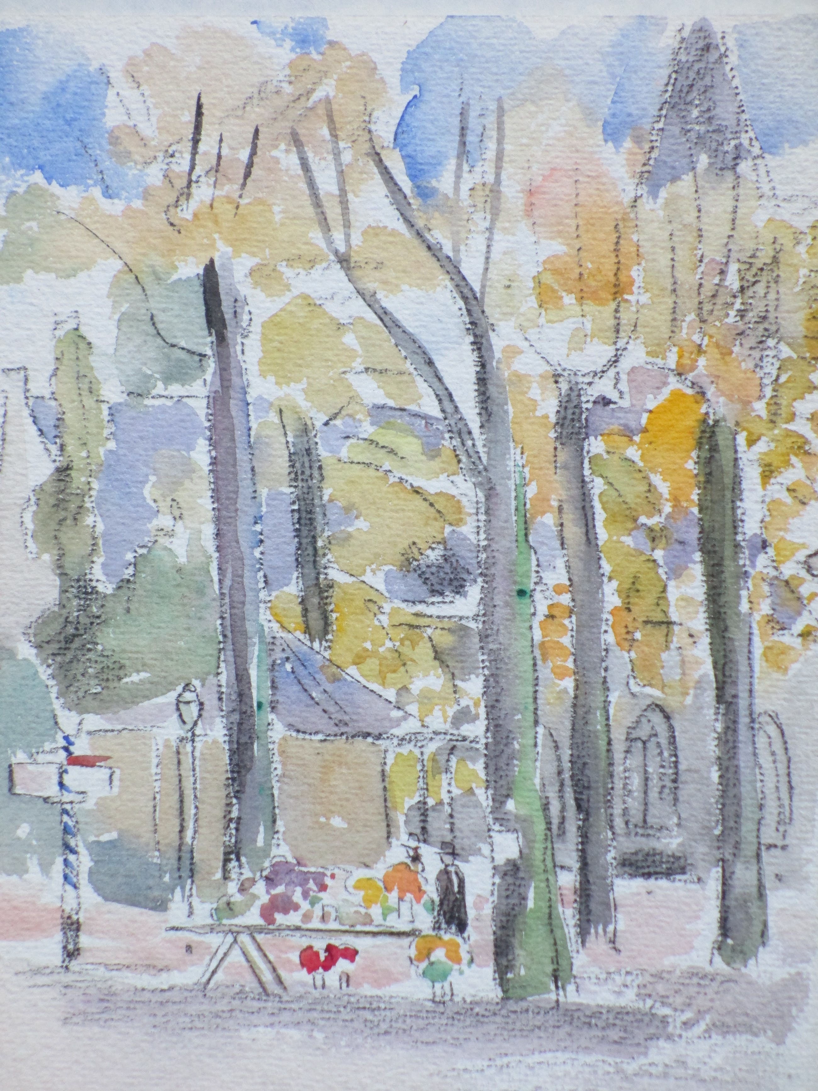 Aquarel door Han Krug Voorstelling van De Brink in Baarn Losbladig, beeldmaat 25x18 Getiteld l.o.: 'De Brink Baarn' Niet gesigneerd Herkomst: Venduehuis Den Haag, Collectie Krug Authenticiteit volledig gegarandeerd