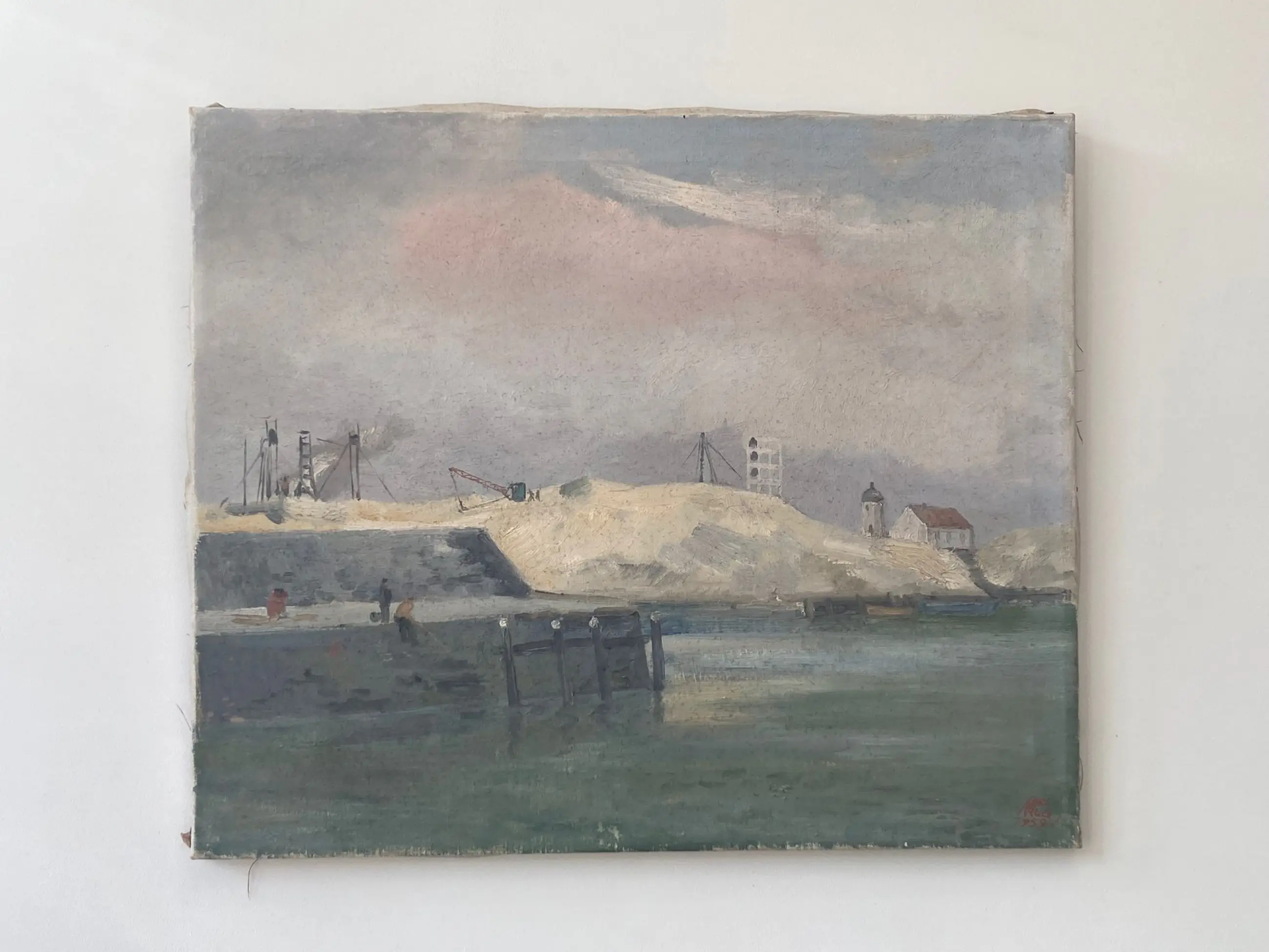 Prachtig olieverf schilderij 'Havenwerk Scheveningen' van de Nederlandse kunstenaar Han Krug. Het werk toont een sfeervol havenlandschap met industriële elementen en figuren, uitgevoerd in een kenmerkende stijl. Het olieverschilderij is rechts onder gesigneerd.