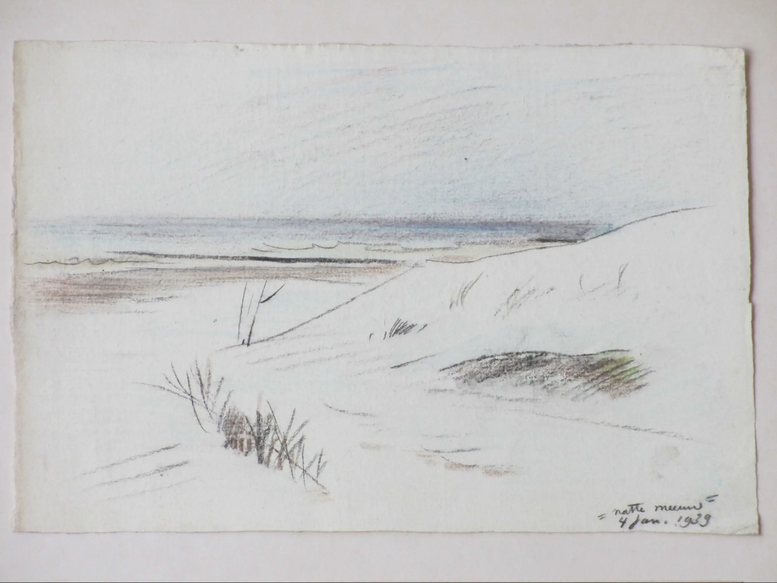 Twee gemengde technieken door Han Krug Voorstellingen van natte sneeuw in de duinen en een schelpenvisser Losbladig, beeldmaat 14x21 Eén tekening gedateerd en getiteld: '4 jan 1939' en 'natte sneeuw' Authenticiteit volledig gegarandeerd