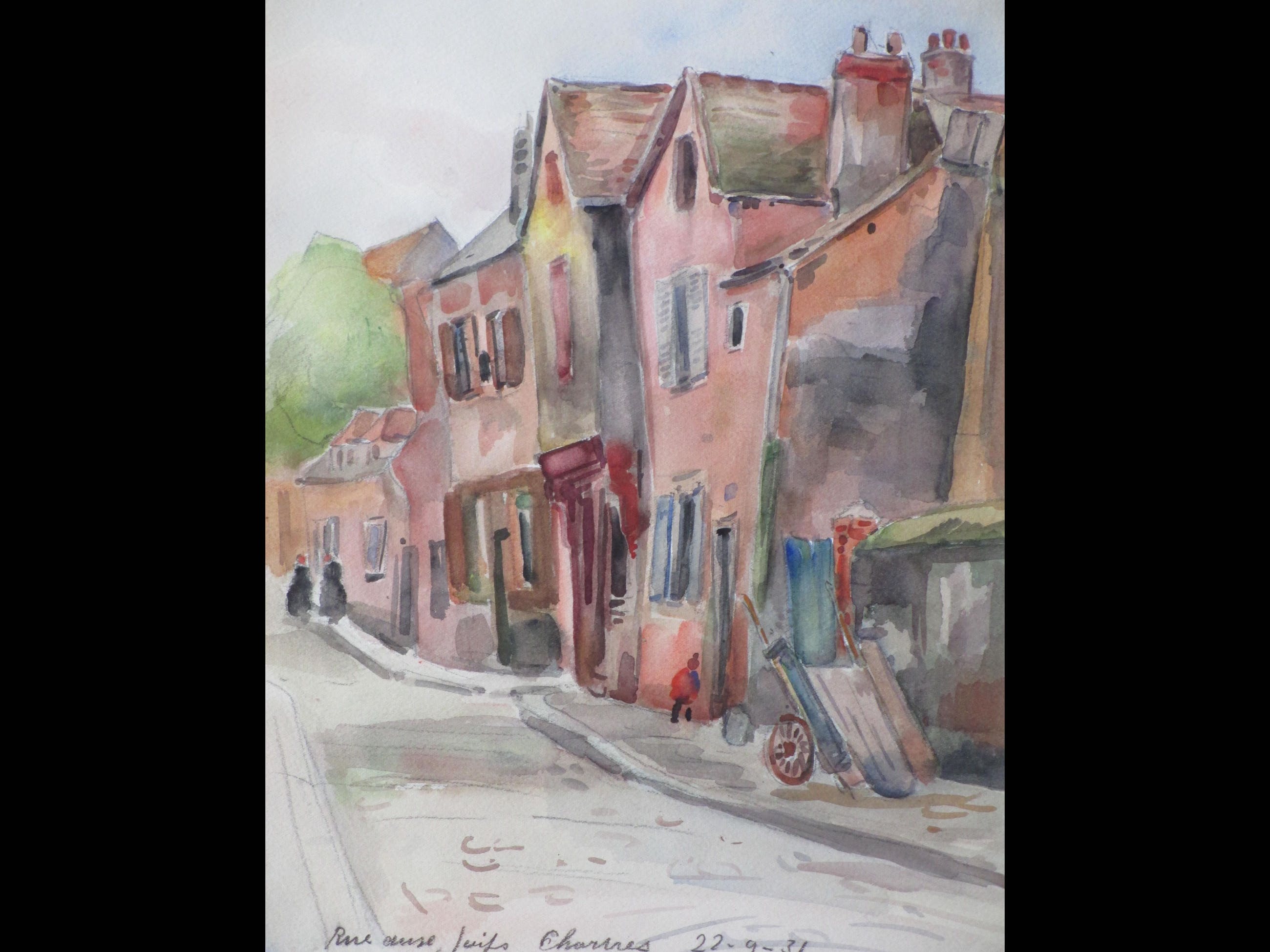 Aquarel door Han KrugVoorstelling van de Rue des Juifs in ChartresLosbladig, beeldmaat 36x24Getiteld en gedateerd l. en m.o. ' Rue des Juifs Chartres. 22-9-31' Niet gesigneerd Authenticiteit volledig gegarandeerd