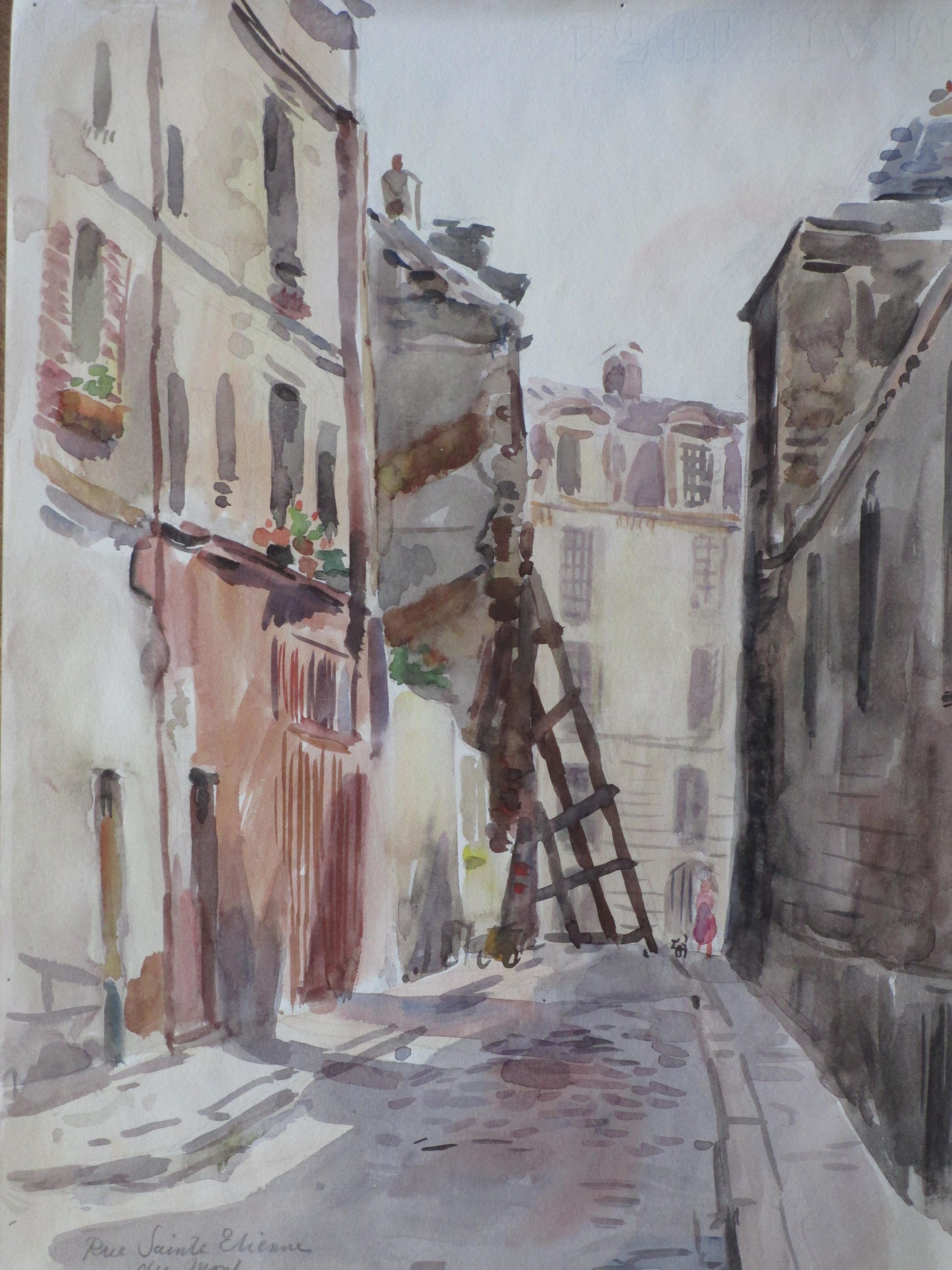 Aquarel van een Parijse straat door Han KrugLosbladig, beeldmaat 37x28Getiteld l.o. 'Rue Sainte Etienne du Mont'Gedateerd r.o. '3 juni '59'Niet gesigneerd, edoch 'signed all over'Authenticiteit volledig gegarandeerd