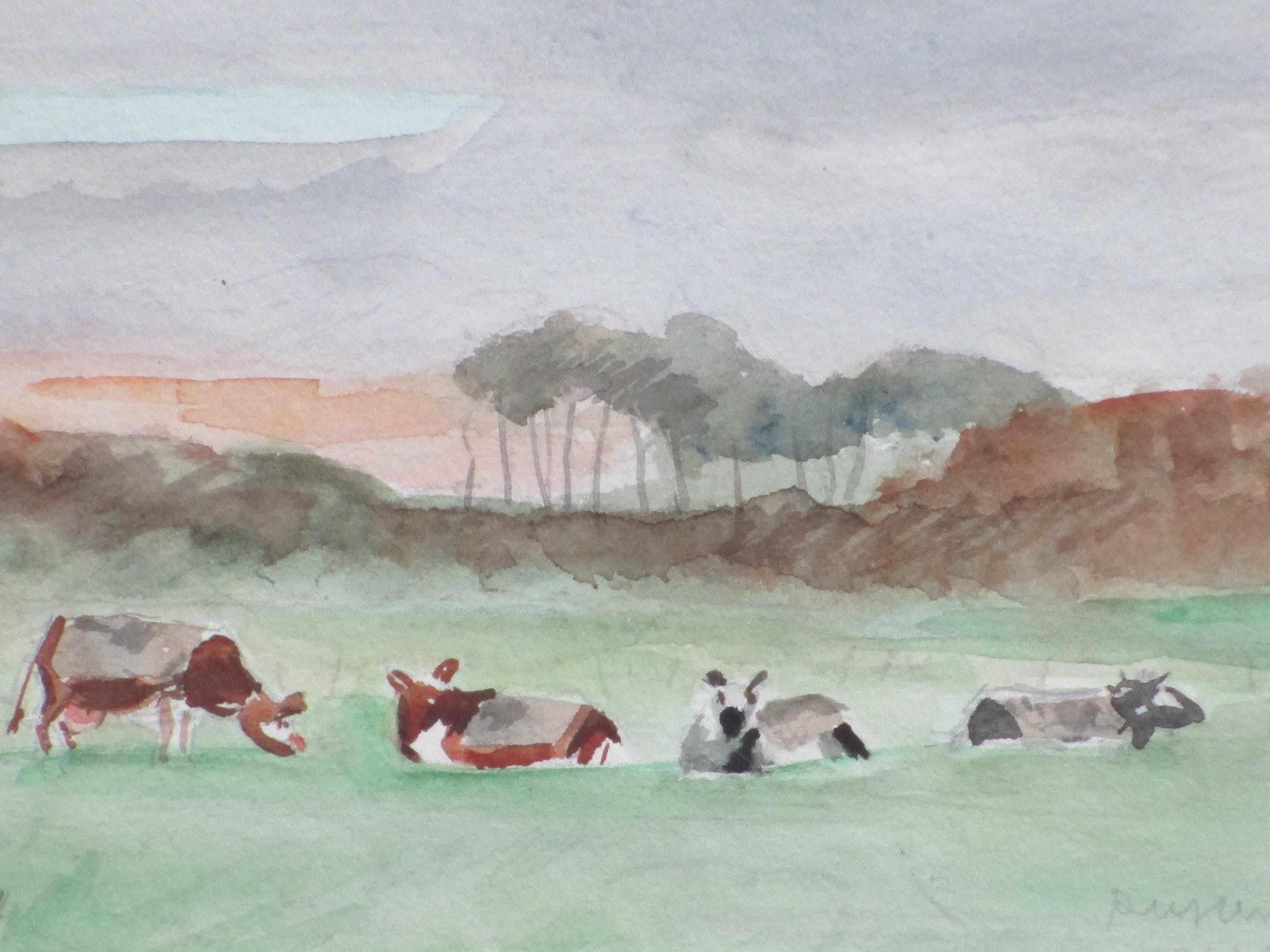 Gemengde techniek door Han Krug Voorstelling van rustend vee met dekkleden Losbladig onder passepartout, beeldmaat 20x24, p.p.maat 35x35 Gesigneerd en gedateeerd l.o.: 'Han Krug 30 oktober 1967 Hilversum' Getiteld r.o.: 'Rustend vee met dekkleden' Authenticiteit volledig gegarandeerd