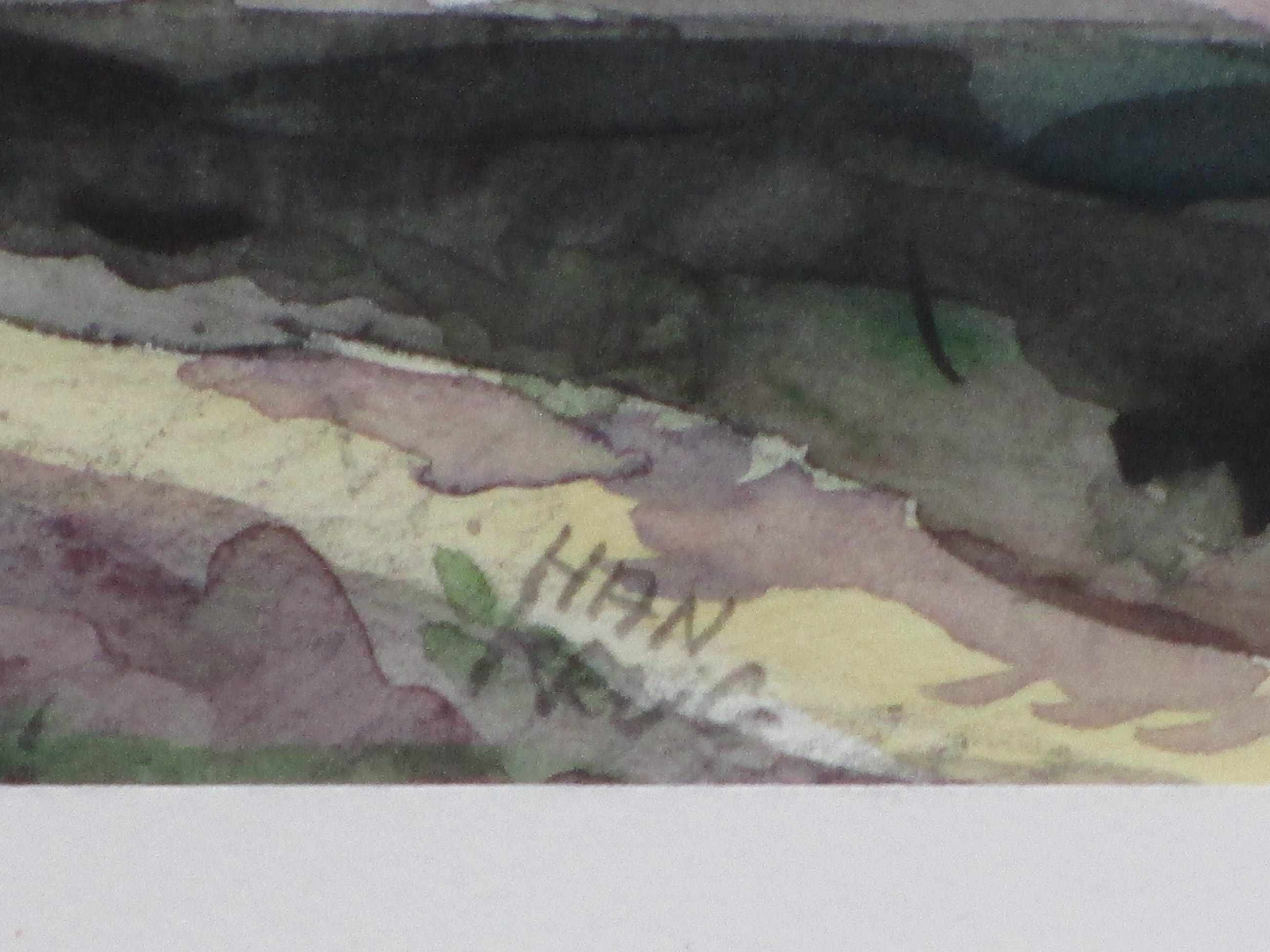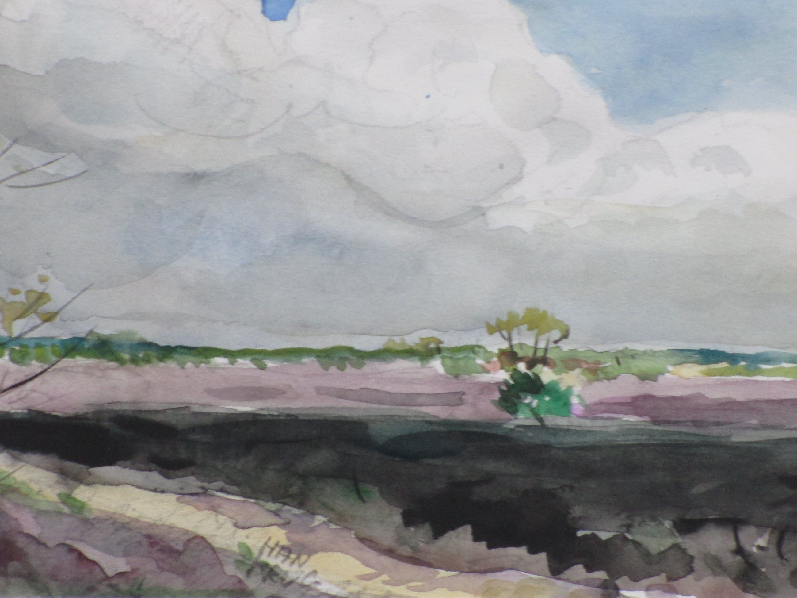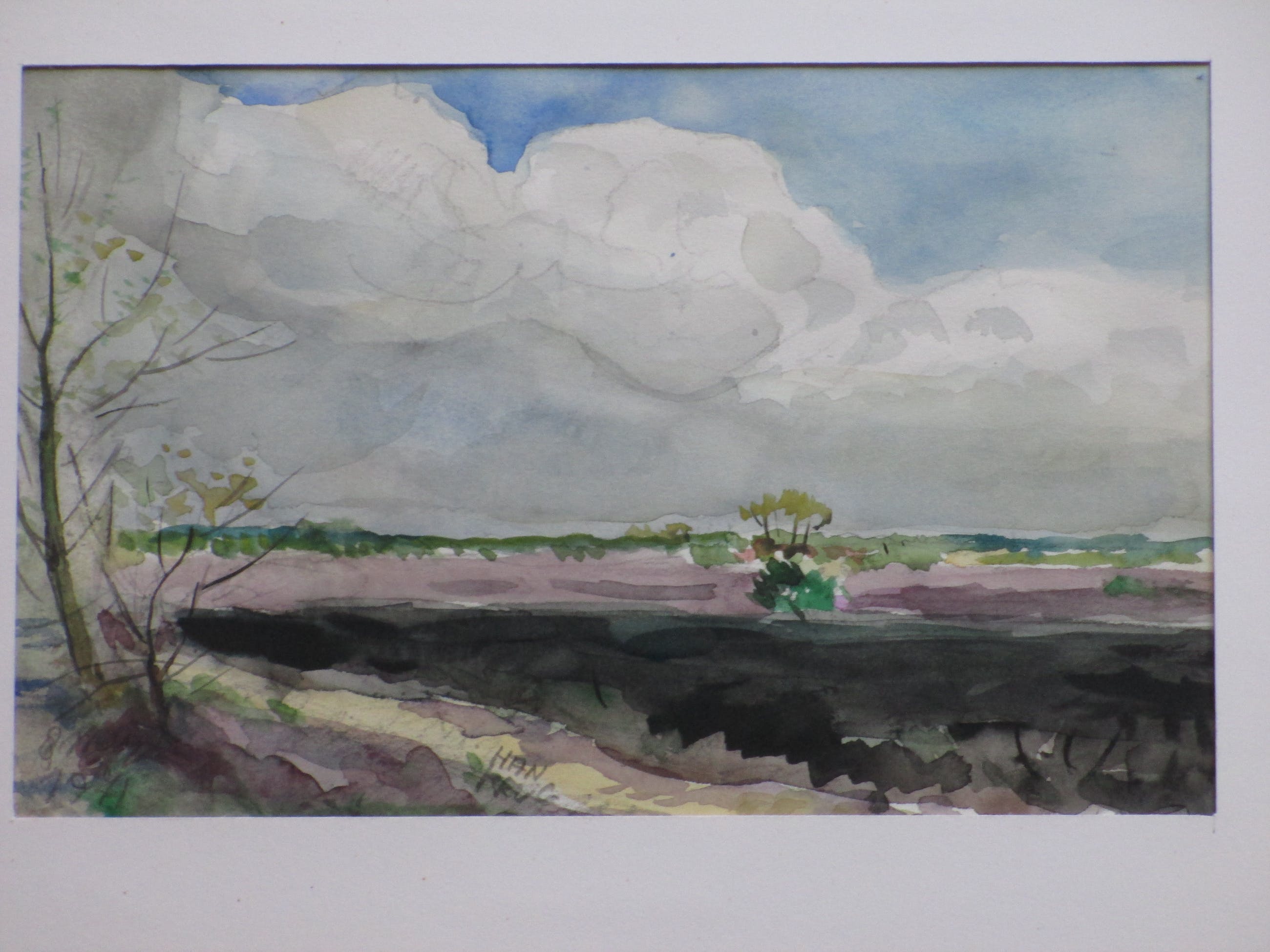Aquarel door Han Krug. Voorstelling van verbrande heide bij Hilversum. Losbladig onder passepartout, beeldmaat 16x24, p.p.maat 24x33 Gesigneerd m.o. in potlood: 'Han Krug' Gedateerd in potlood l.o.: '8 mei 1971' Getiteld en gedateerd op achterzijde in potlood: 'Hilversum 71 Verbrande Heide'