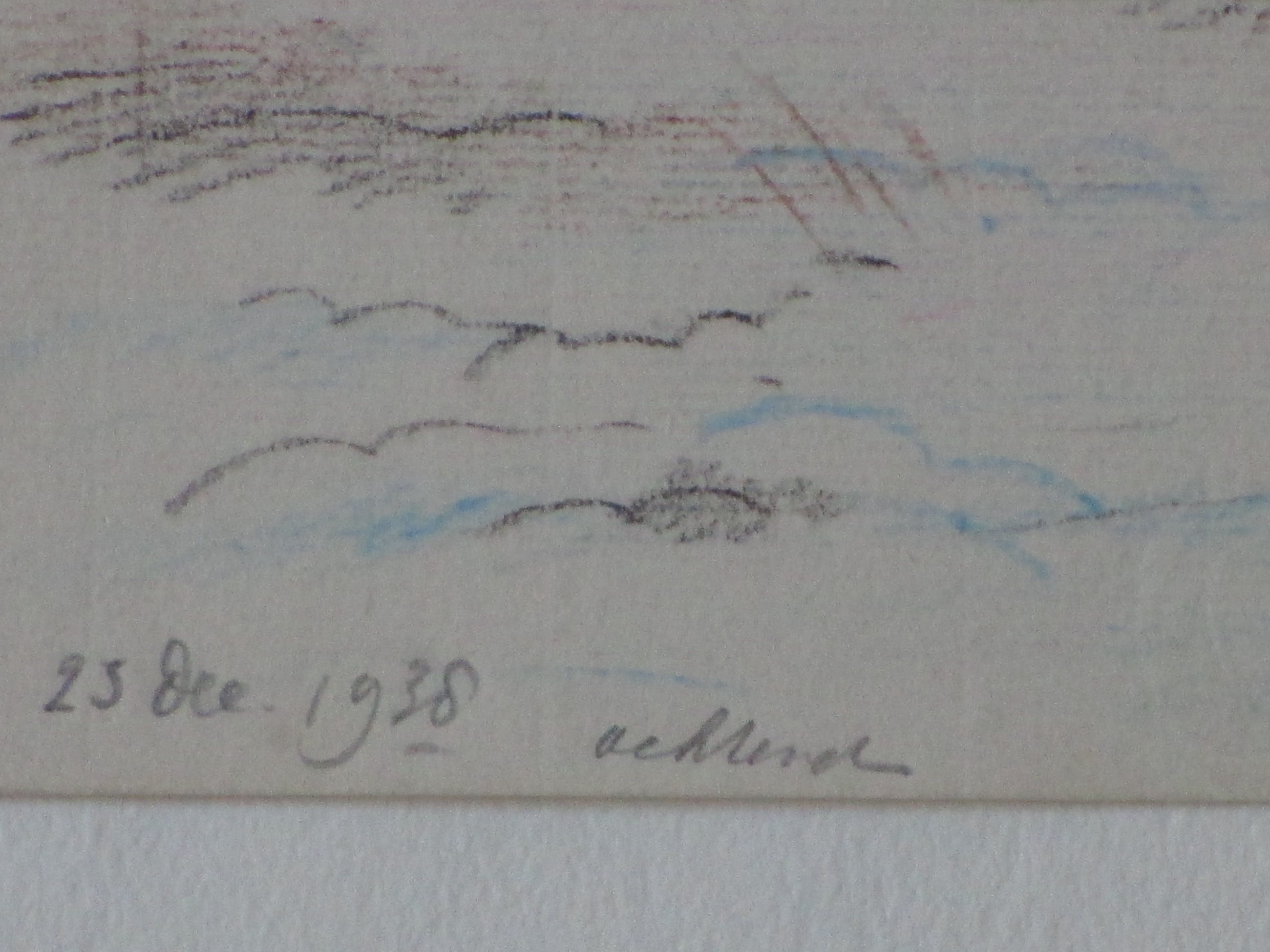 Kleurtekening door Han Krug. Voorstelling van een winterochtend in de duinen. Losbladig, beeldmaat 13x21 Niet gesigneerd Gedateerd en annotatie in potlood linksonder: '23 dec. 1938 ochtend' Authenticiteit volledig gegarandeerd