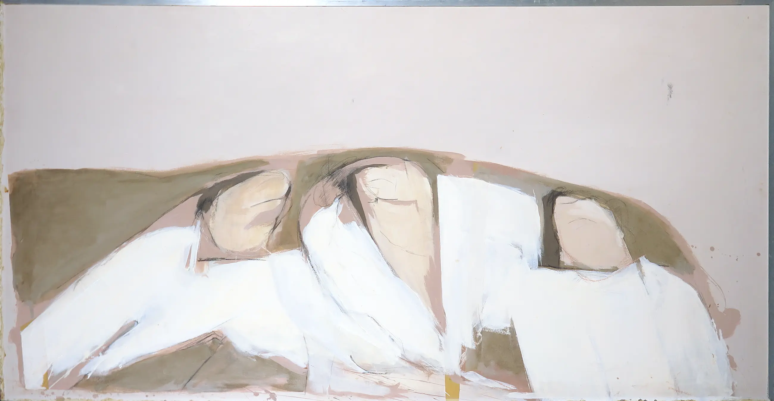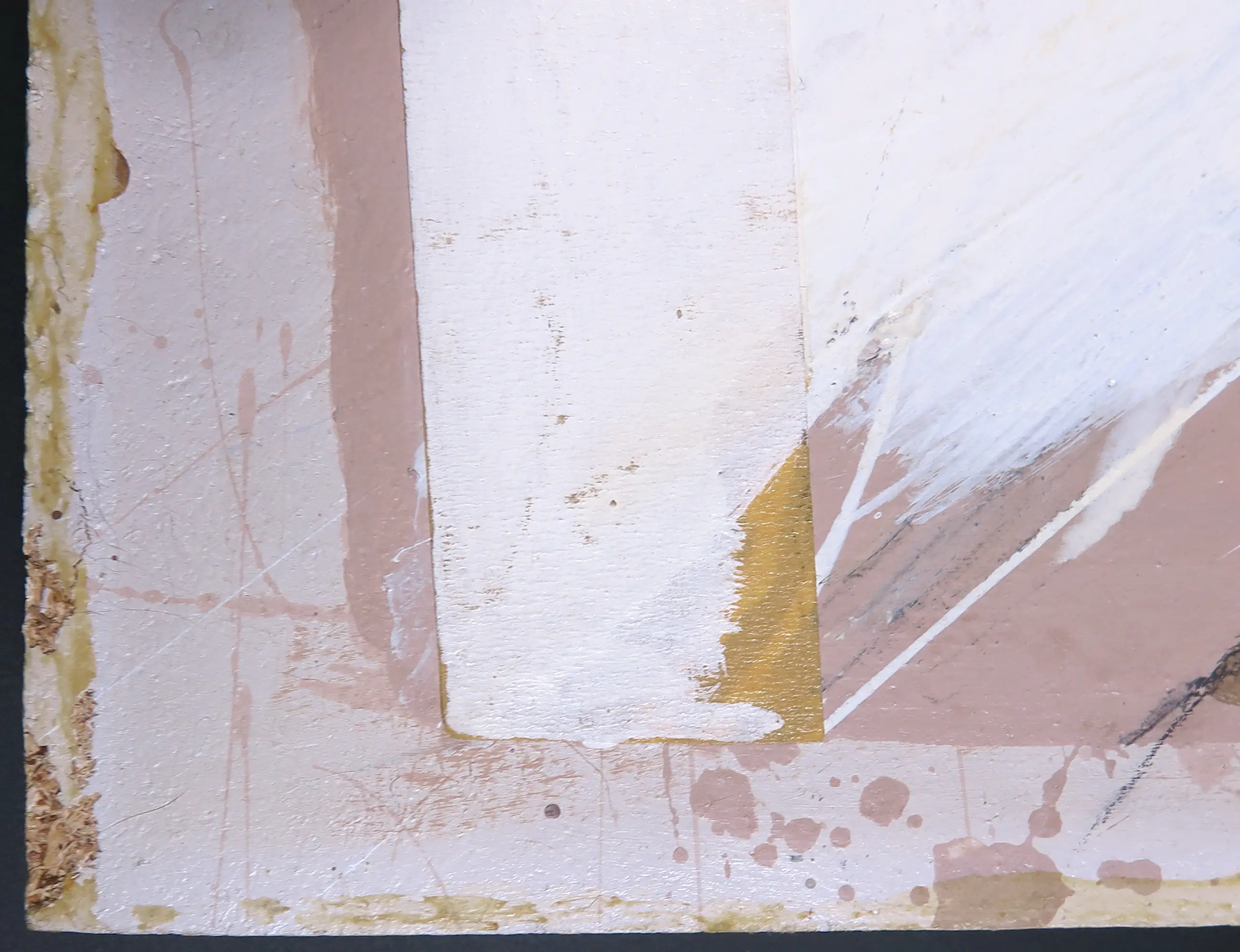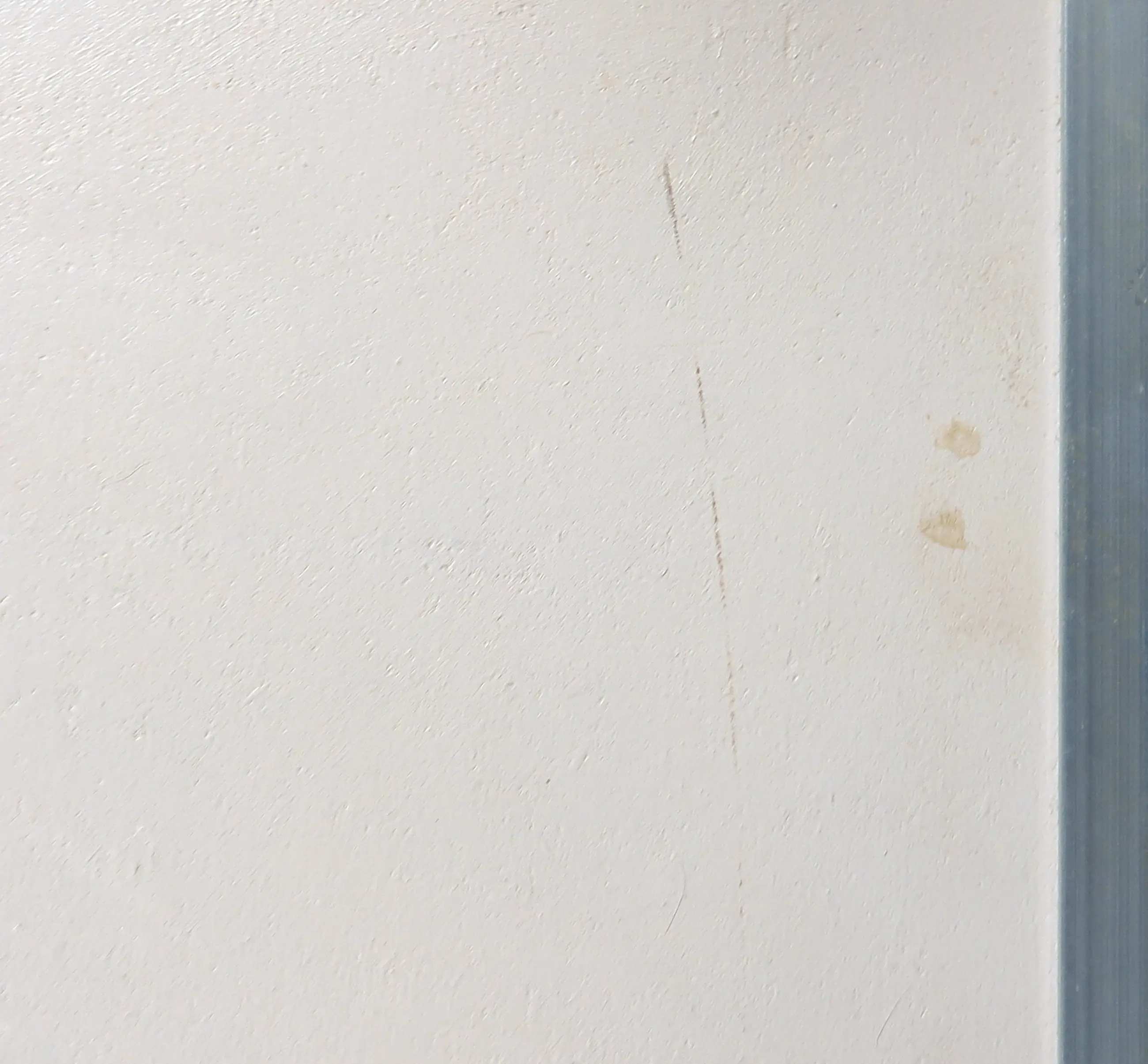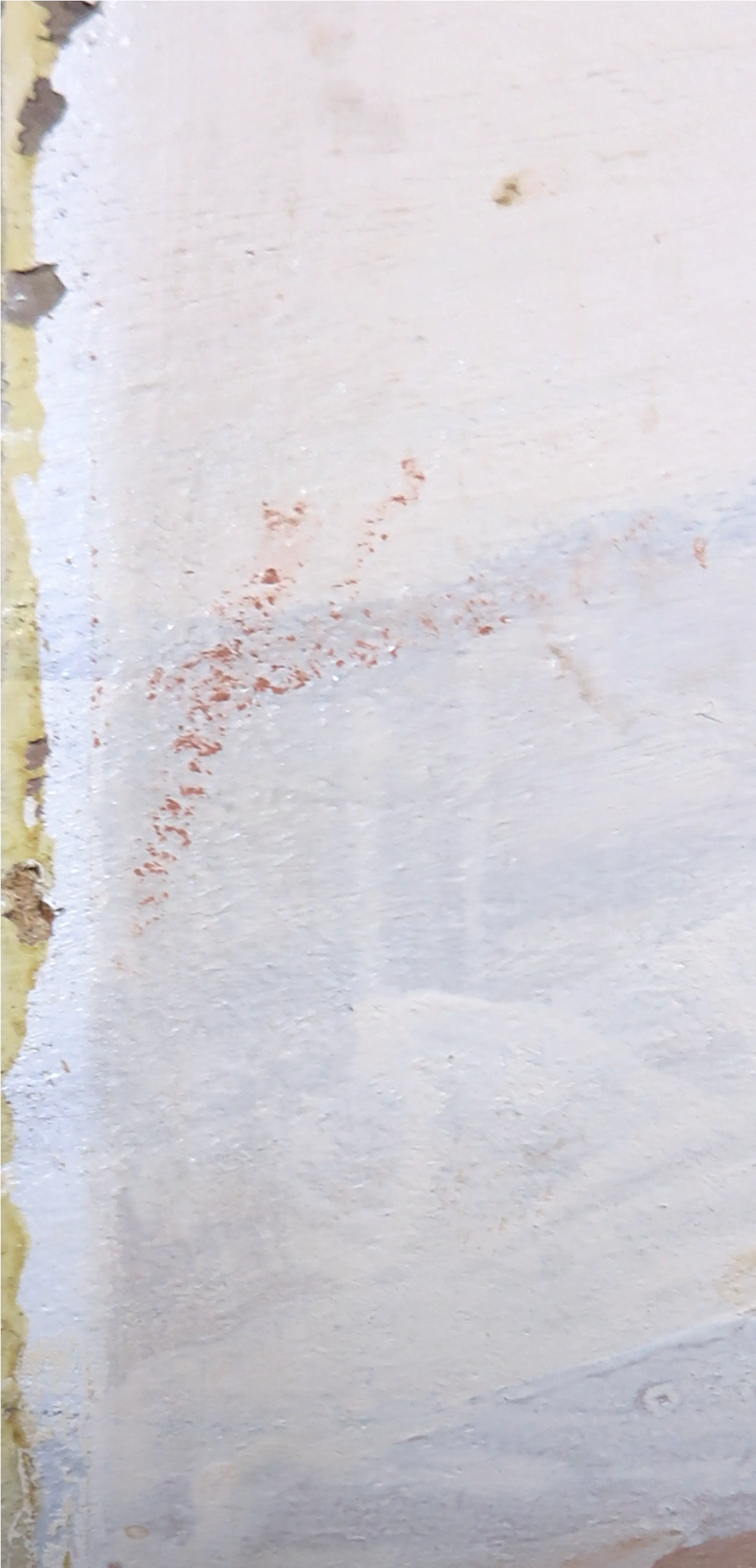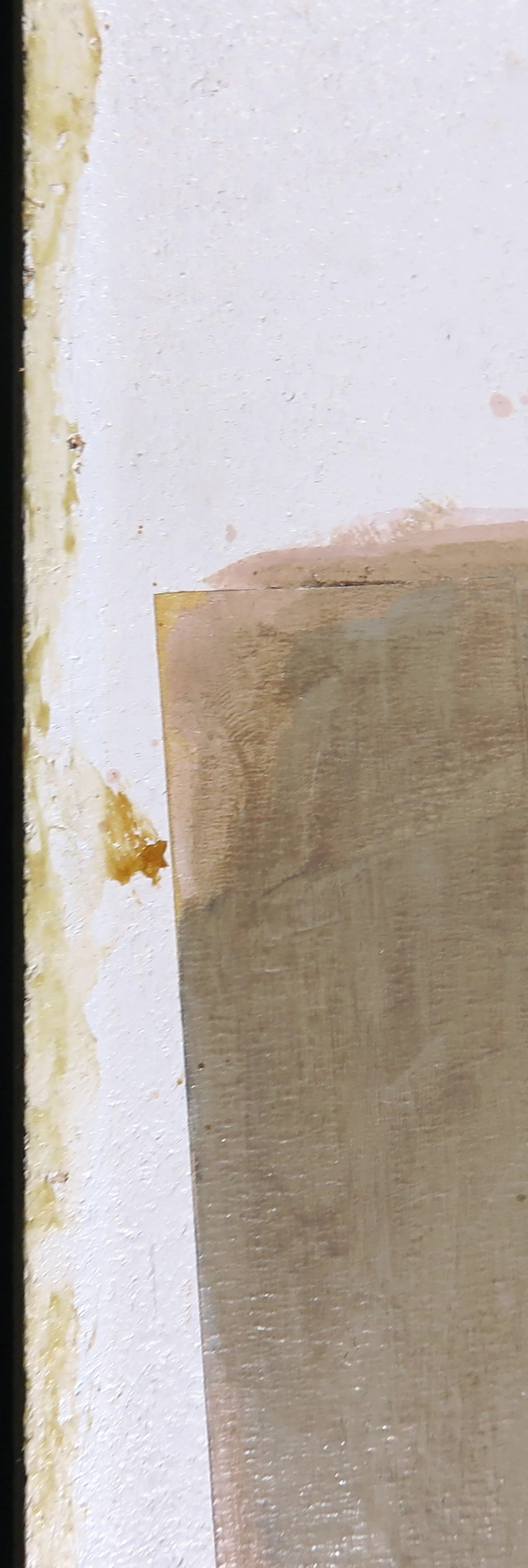 | Het werk is nog half ingelijst. De ontbrekende helft heeft sporen achtergelaten op de randen. Verder heeft het werk nog een paar vlekjes en veegjes. | |