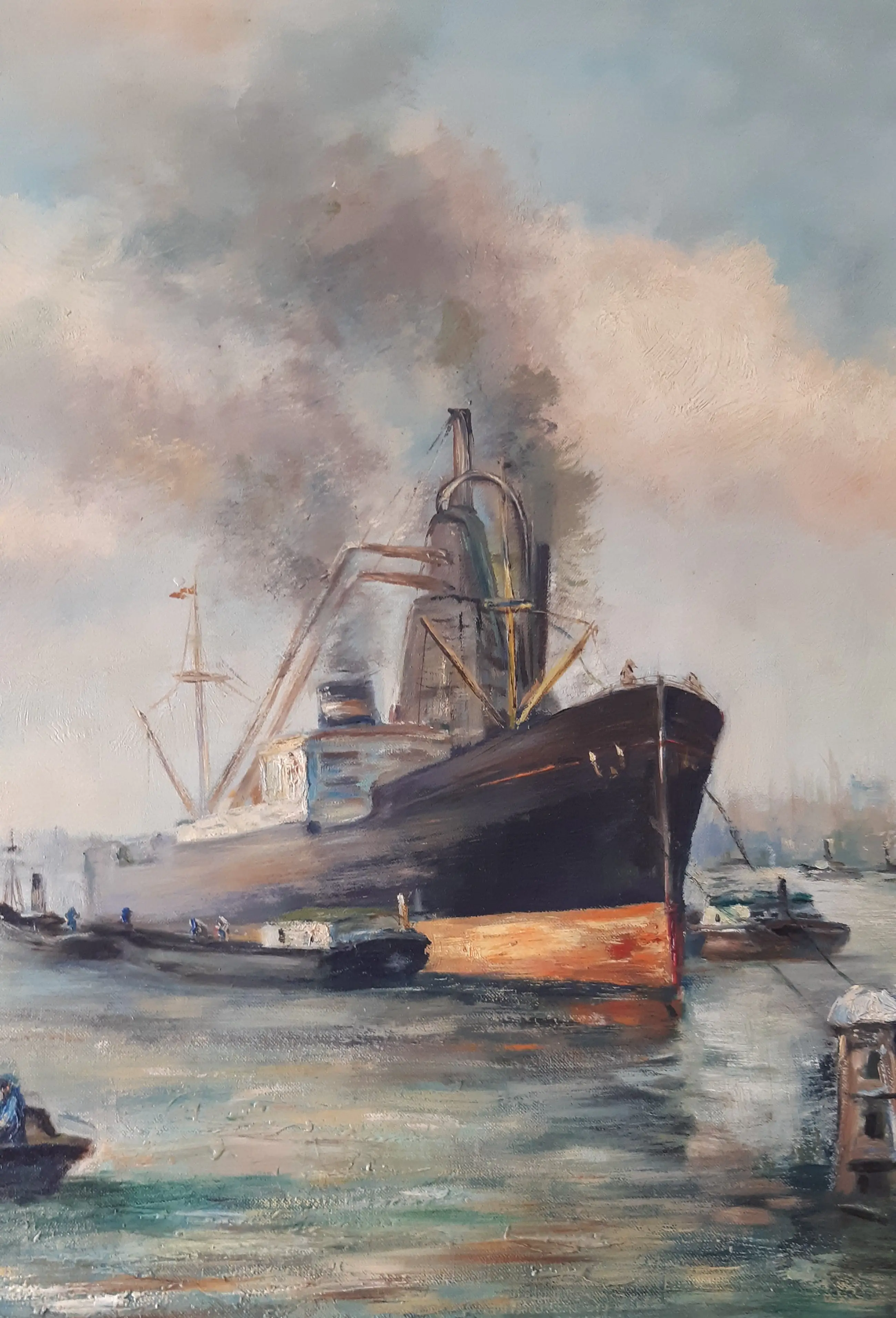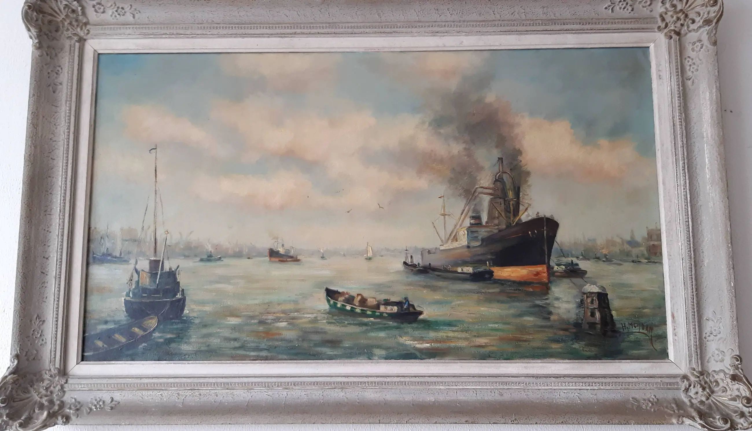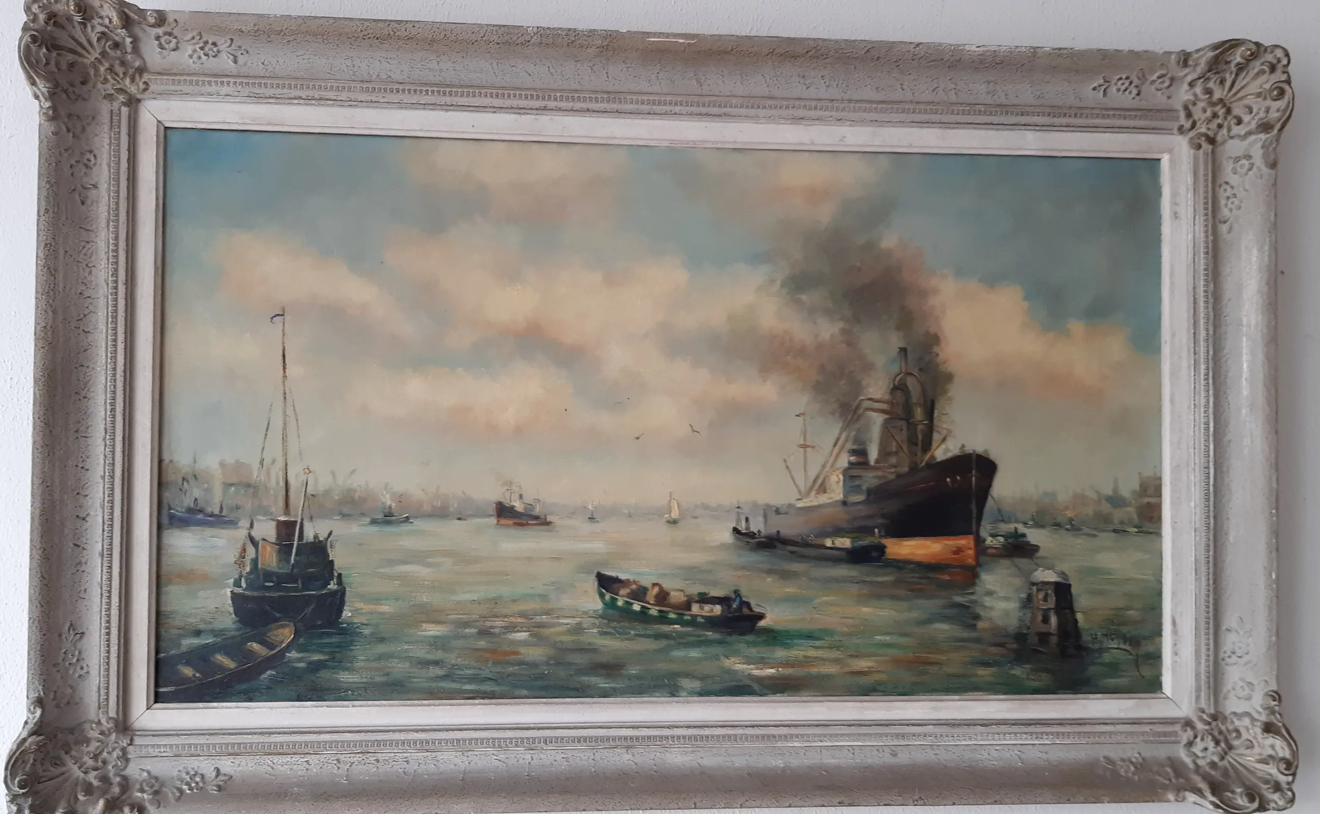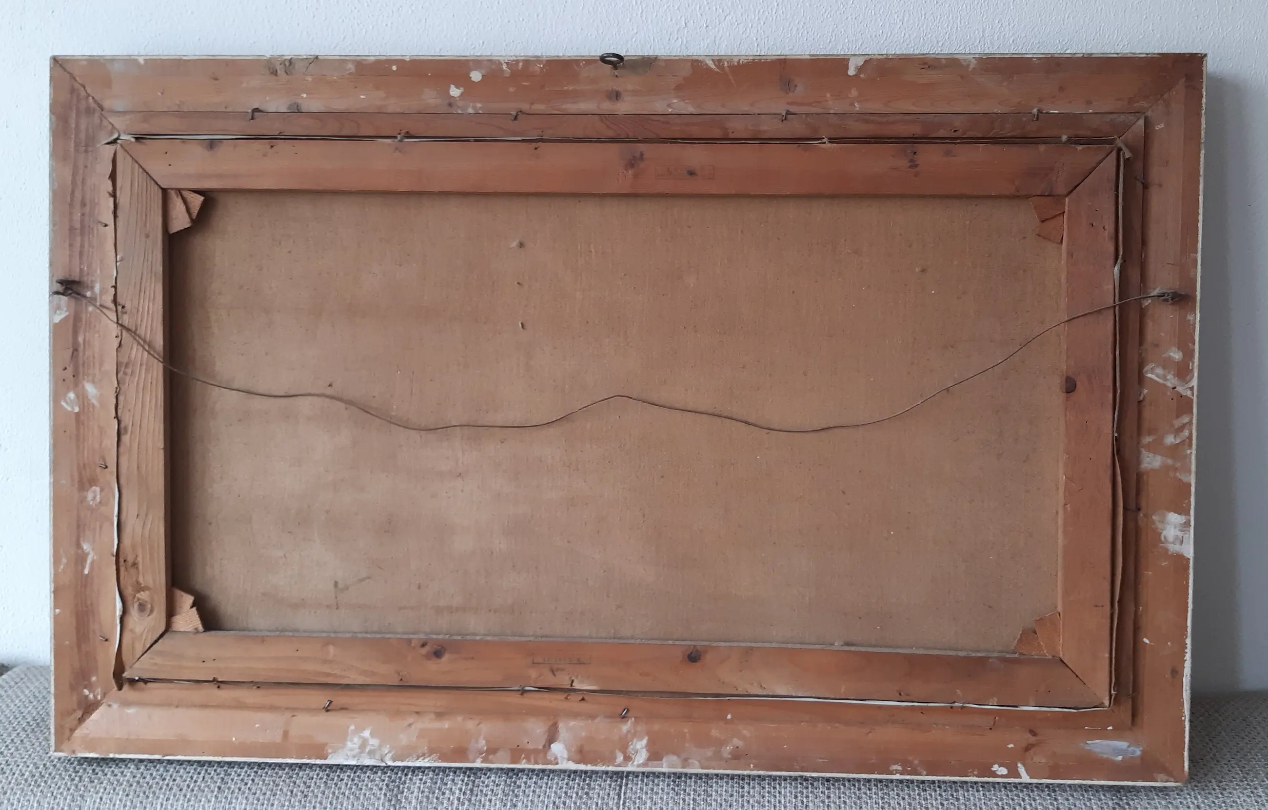 Het schilderij heeft altijd in de woning van mijn ouders gehangen. De kunstenaar was een vriend van mijn vader. Mijn vader stierf in 1967 en ik erfde het werk van mijn moeder die in 2008 overleed. Het houtwerk aan de achterkant is zichtbaar verouderd, maar nog steeds het originele.