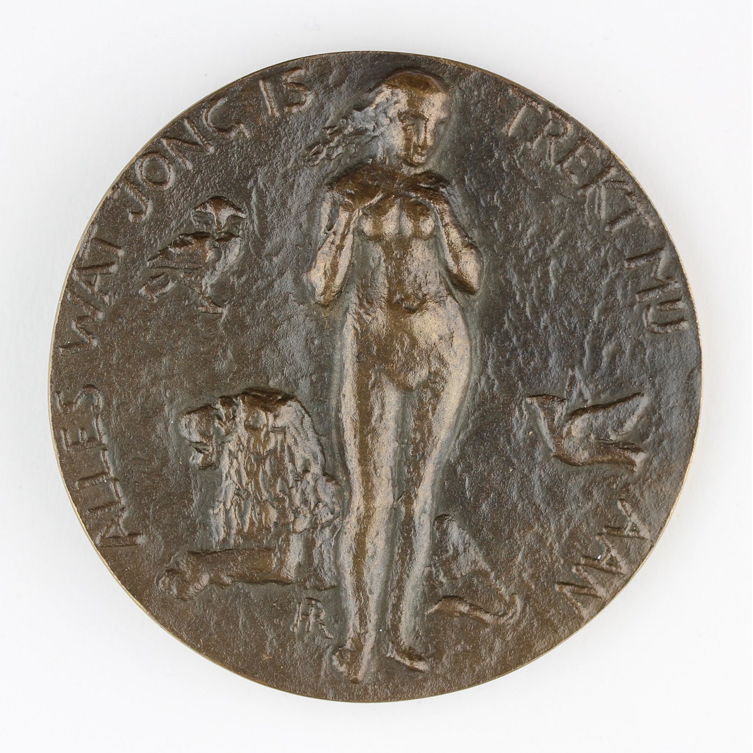 John Rädecker (1885-1956) werd in zijn tijd gezien als de 'grand old man' van de Nederlandse beeldhouwkunst. Hij was met Hildo Krop de belangrijkste bouwbeeldhouwer van zijn generatie en een virtuoos in het hakken in steen. 'Niemand kan zo'n huid hakken als John' zei Mari Andriessen over hem. Hij overleed in hetzelfde jaar dat de penning, ontworpen door zijn zoon, uitkwam. Het was het jaar dat het Nationaal Monument op de Dam onthuld werd - dat had zijn levenswerk moeten worden. Zijn zoons Han en Noeki maakten de laatste delen af. De voorzijde met het Rädecker kenmerkende wijkende voorhoofd is een impressionistisch gemodelleerd schouderstuk. 'Hij sluit', aldus de Geuzenpenning, 'in zijn opvatting aan bij de keerzijde, die de kunstenaar typeert in zijn geliefde motieven: het meisje als symbool van het immer jonge en schone; de leeuw voor de mannelijke sterkte; de uil, de nacht en daarmee het levensmysterie en de duif, de vrijheids-gedachte weergevend'. #Louk Tilanus, Handzame Sculptuur