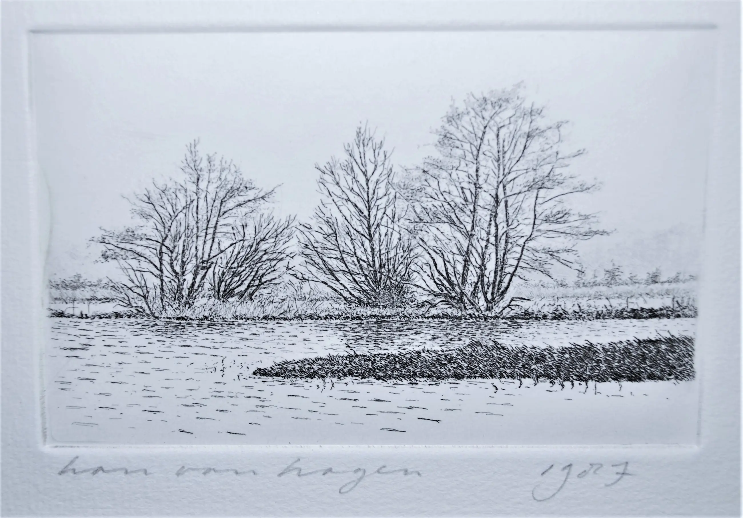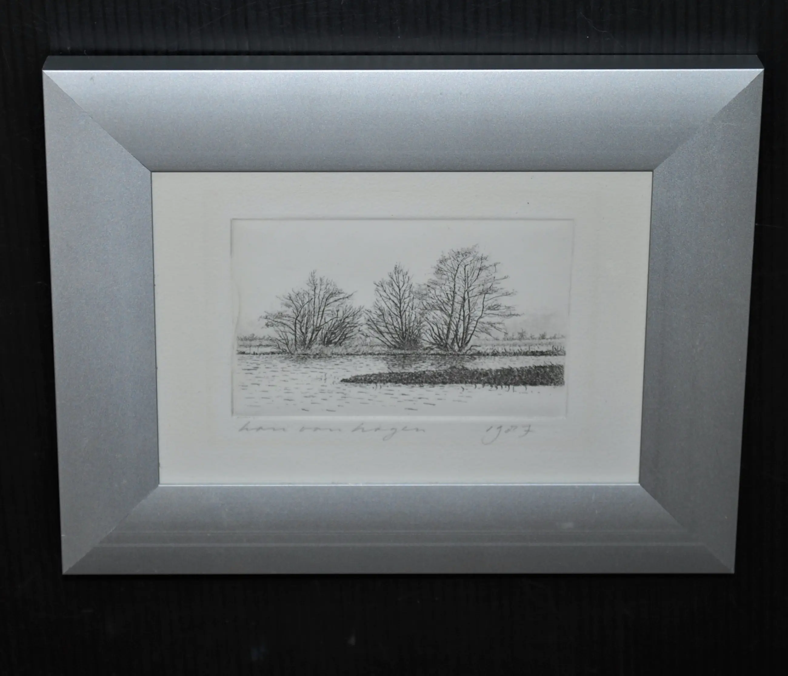 - Landschap aan het water. Plaatrand ca 60x97 mm. Bladmaat ca 10x15 cm.