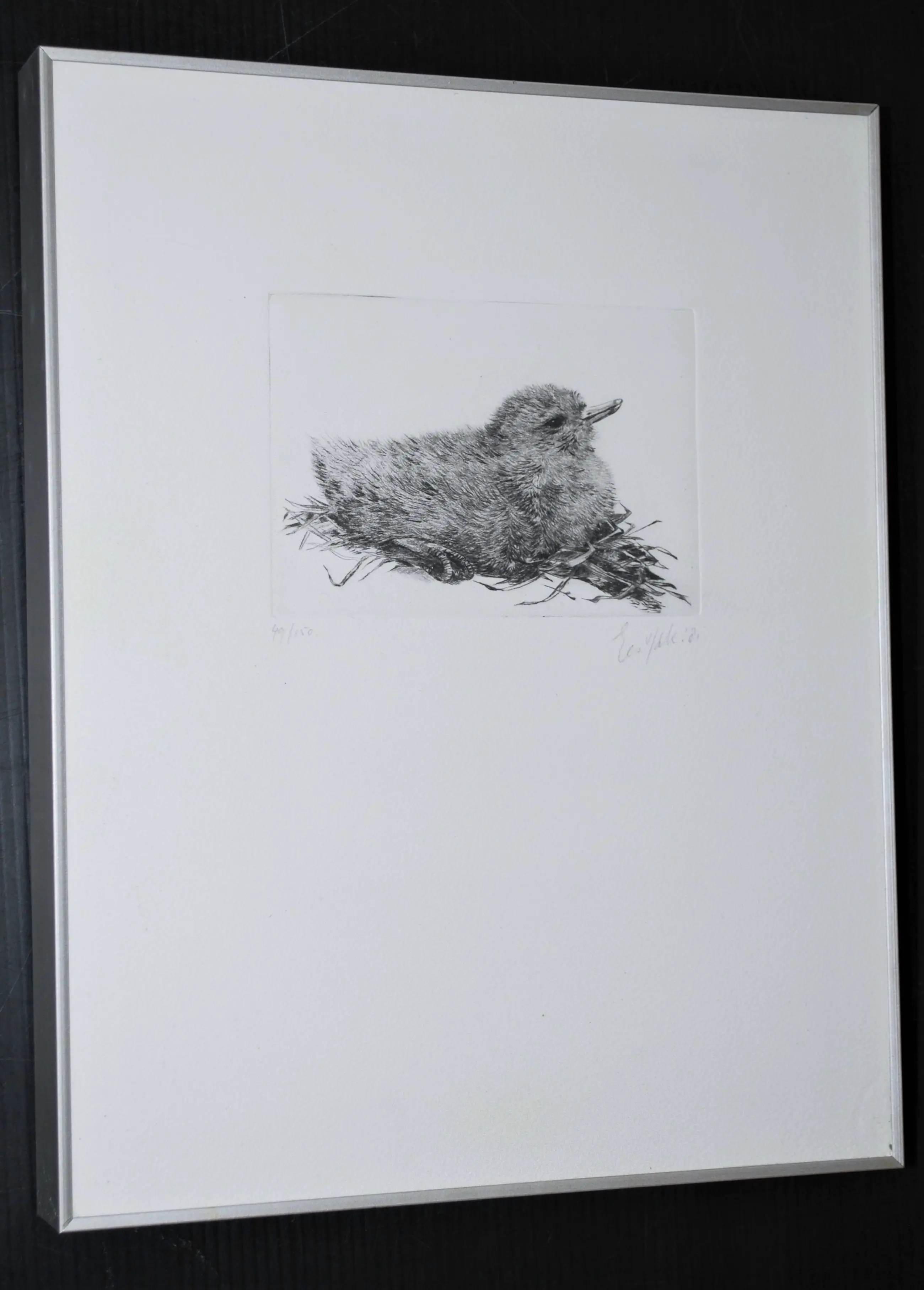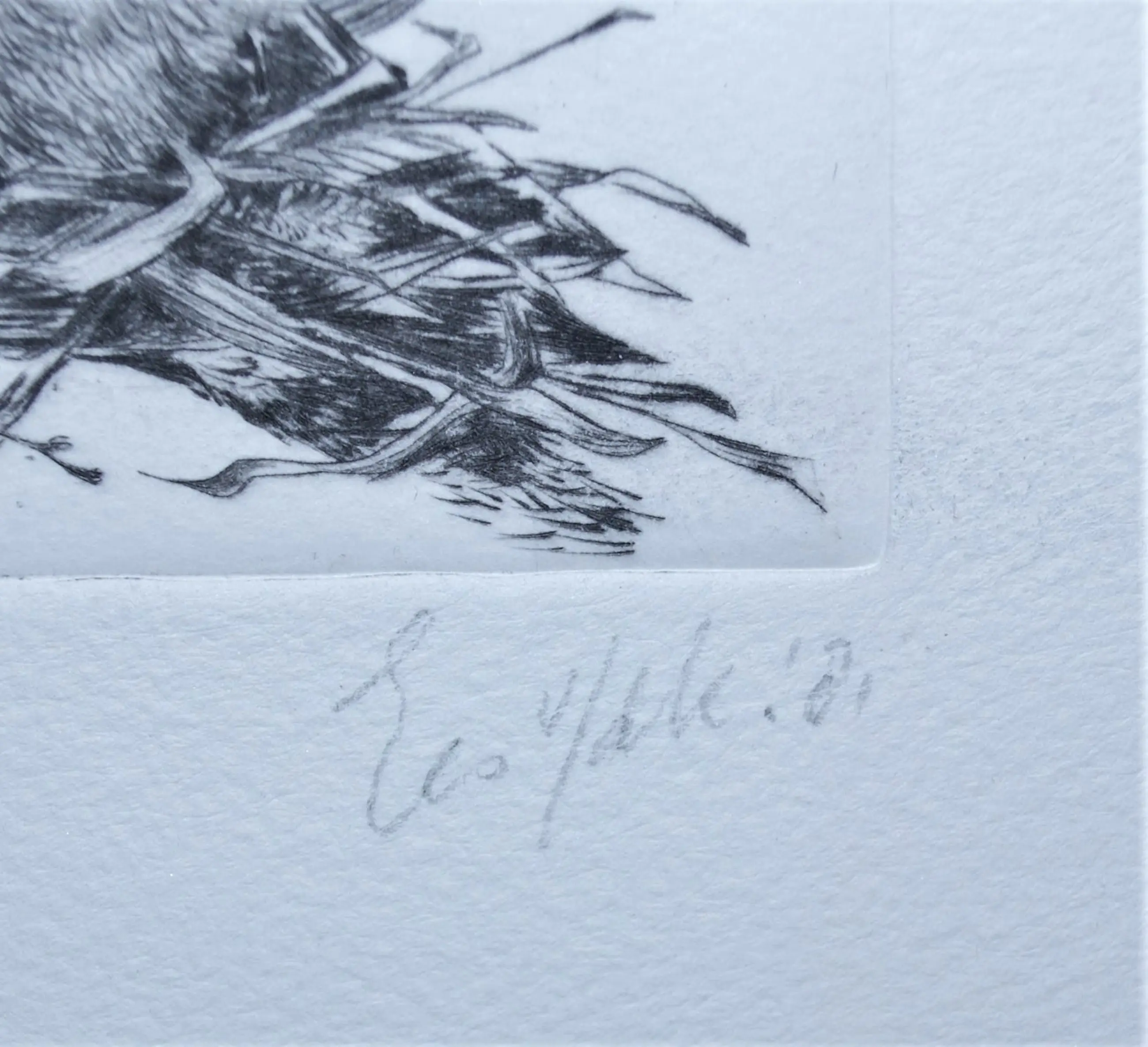 - De 2e ets, jonge eend, heeft plaatrand 83x118 mm. Lijstmaat ca. 29x23 cm. Er lijkt een signatuur te staan of 'ets v.d. k.(=kunstenaar)' '81, Ik kan op deze ets geen volledige garantie geven. Oplage 49/150.